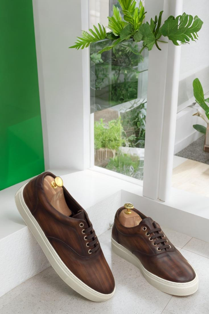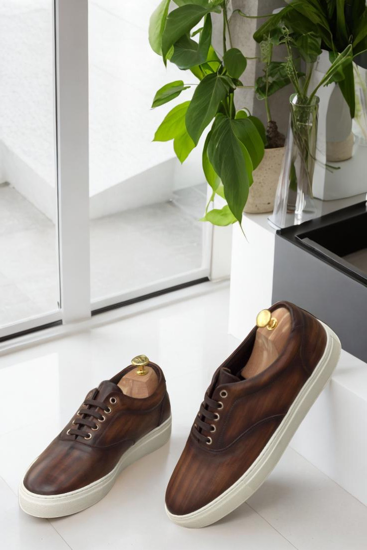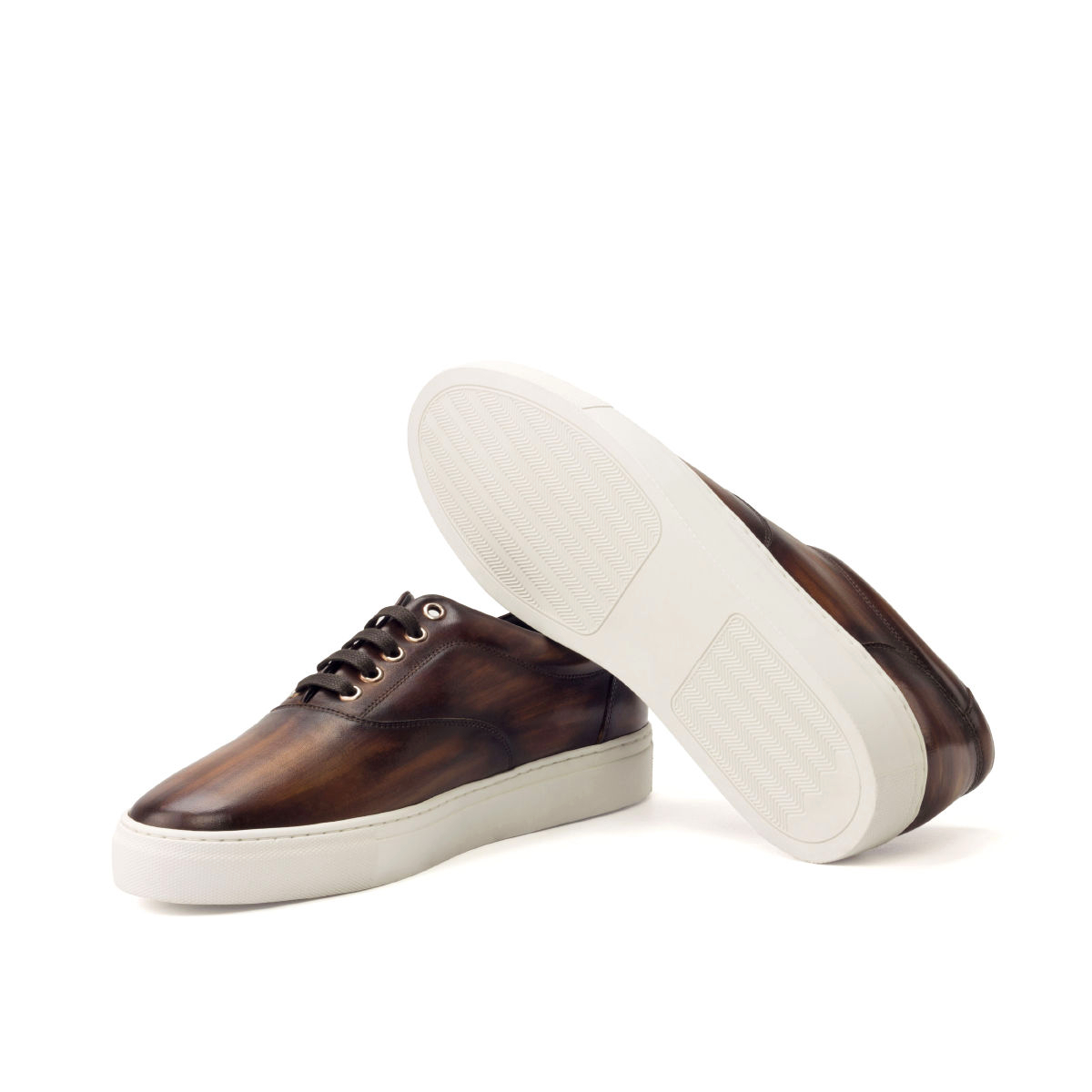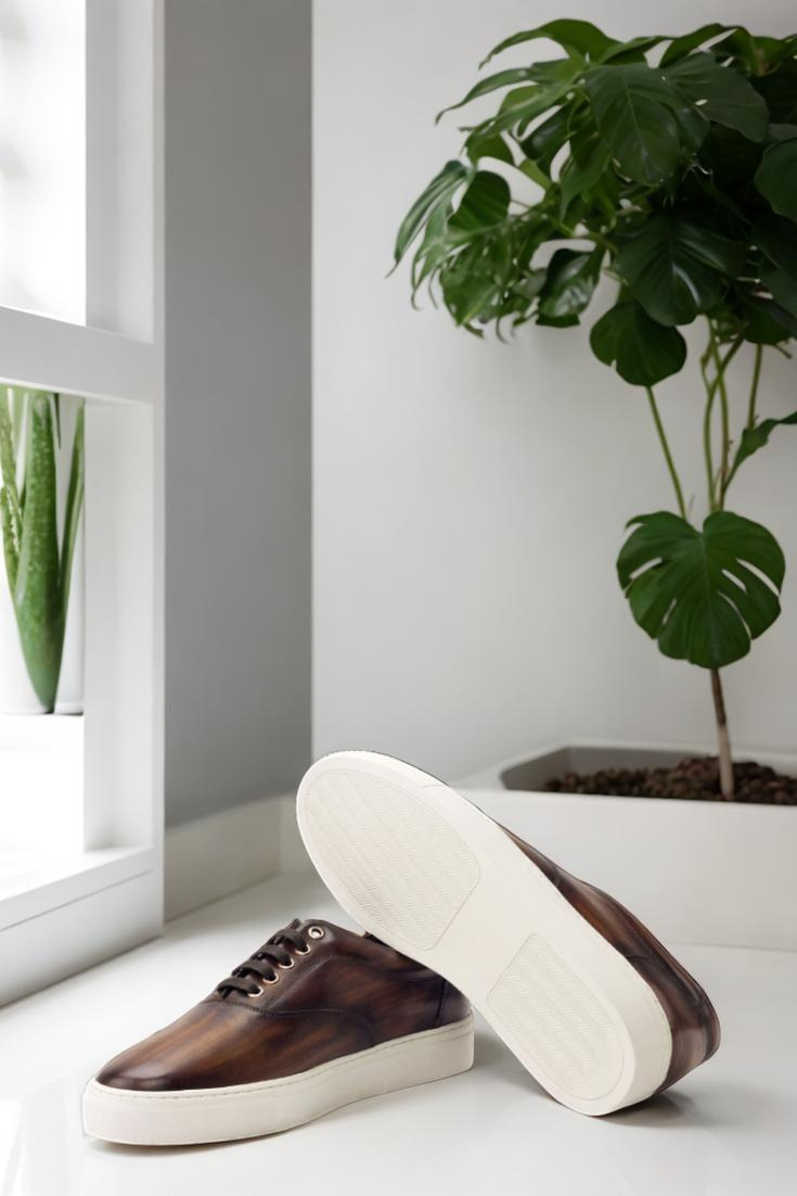 The exterior features a Brown Original Hand Patina with a dark intensity. Skilled artisans apply this finish manually, ensuring the color penetrates the leather deeply rather than sitting on the surface. This specialized technique creates a rich, varied tone that standard production methods simply cannot replicate. The dark patina not only provides sophisticated visual depth but also effectively conceals daily wear and minor scuffs, ensuring the sneakers maintain their polished appearance for years.