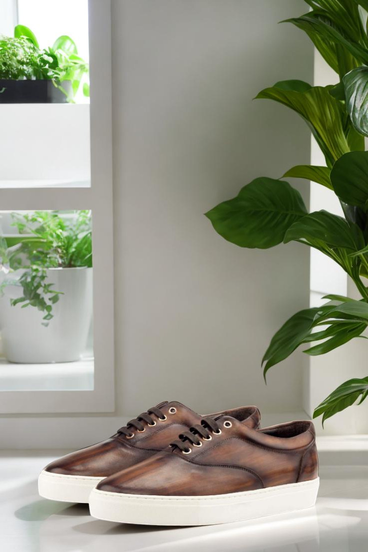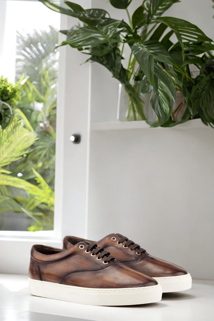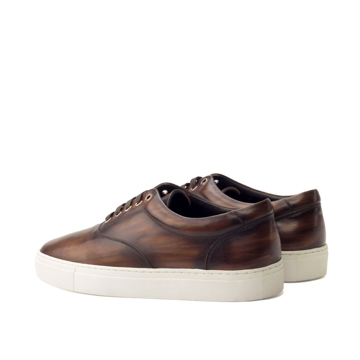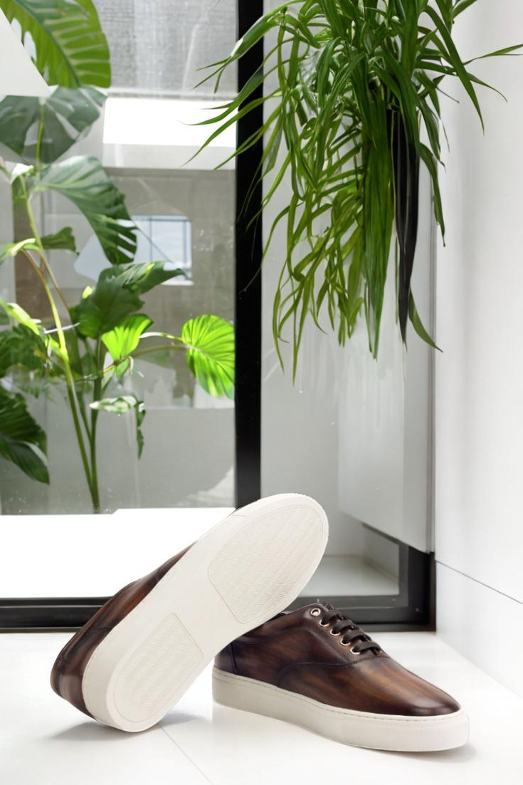 The exterior features a Brown Original Hand Patina with a dark intensity. Skilled artisans apply this finish manually, ensuring the color penetrates the leather deeply rather than sitting on the surface. This specialized technique creates a rich, varied tone that standard production methods simply cannot replicate. The dark patina not only provides sophisticated visual depth but also effectively conceals daily wear and minor scuffs, ensuring the sneakers maintain their polished appearance for years.