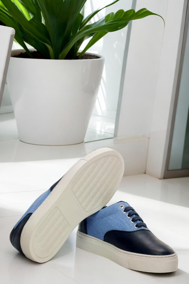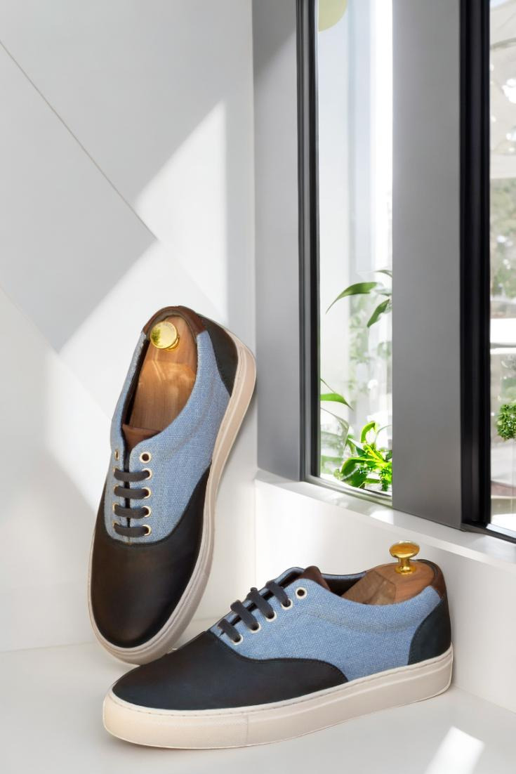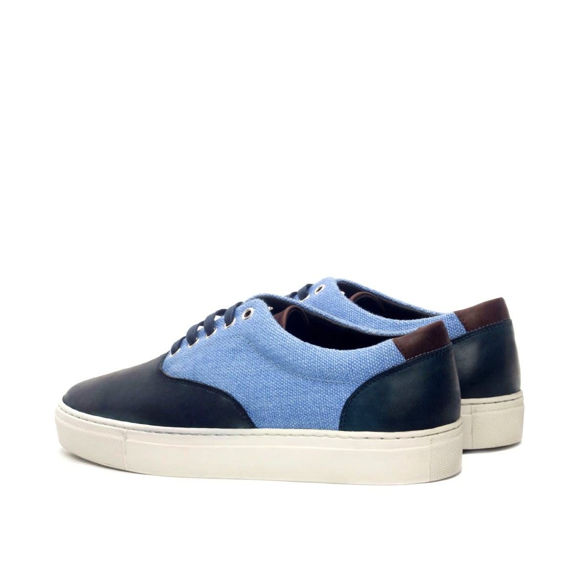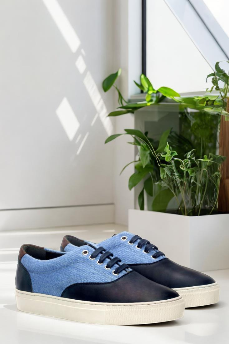 The navy blue painted calf toe cap and back provide structure and a smooth finish, while the blue linen sides add texture and visual balance. Dark brown painted calf on the tongue and heel tab introduces a richer tone that grounds the design and gives the shoe a more considered, elevated appearance. Nickel eyelets add a subtle metallic accent, and the navy blue laces keep the overall look clean and cohesive. Every detail works together to create a sneaker that feels intentional from every angle.