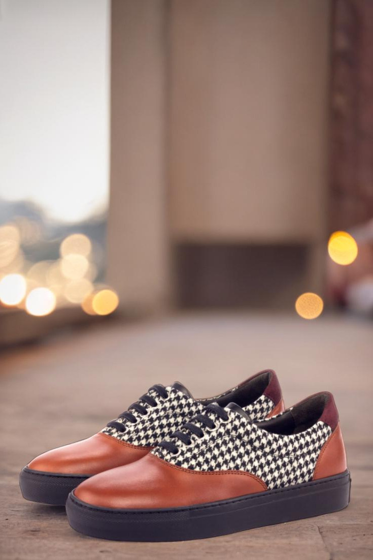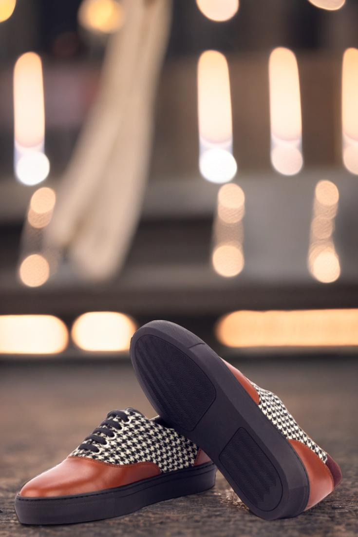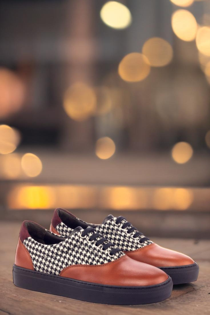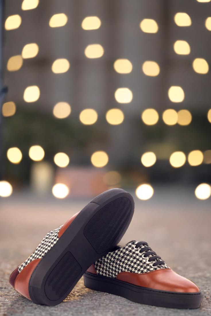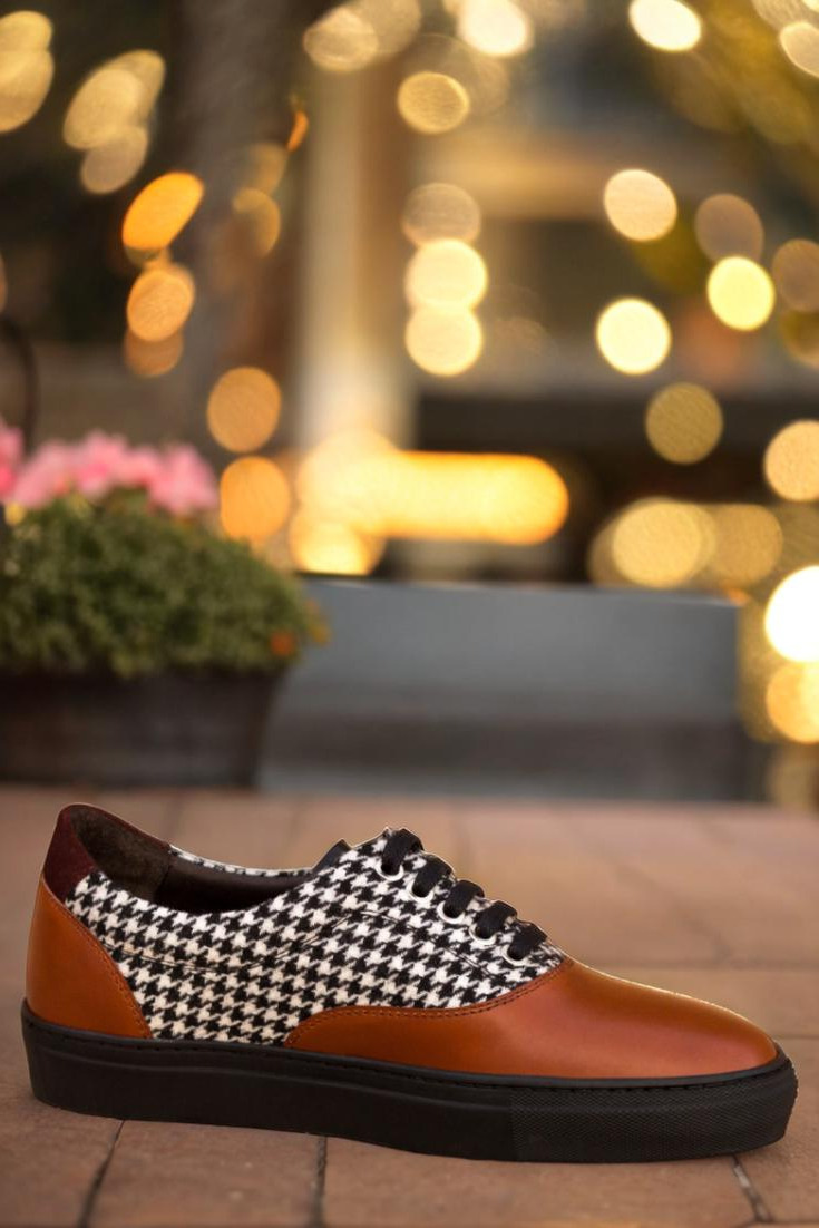 Crafted with the highest quality materials, the uppers boast a stunning combination of cognac painted calf and houndstooth wool, paired with accents of burgundy luxe suede and sleek black nappa leather. The result? A sophisticated and stylish shoe that will elevate any outfit.