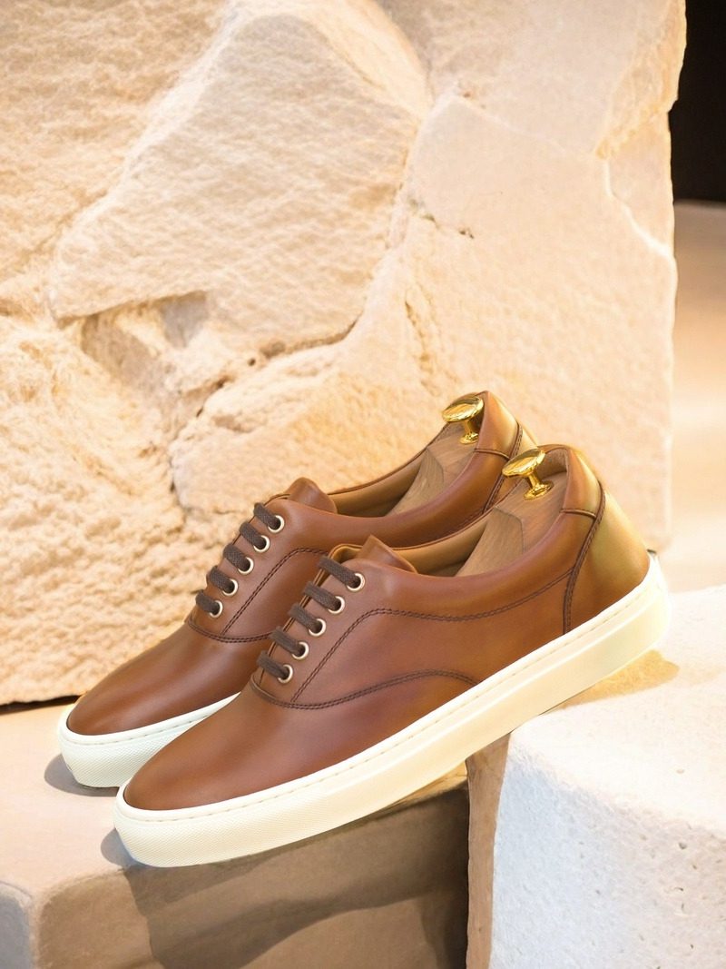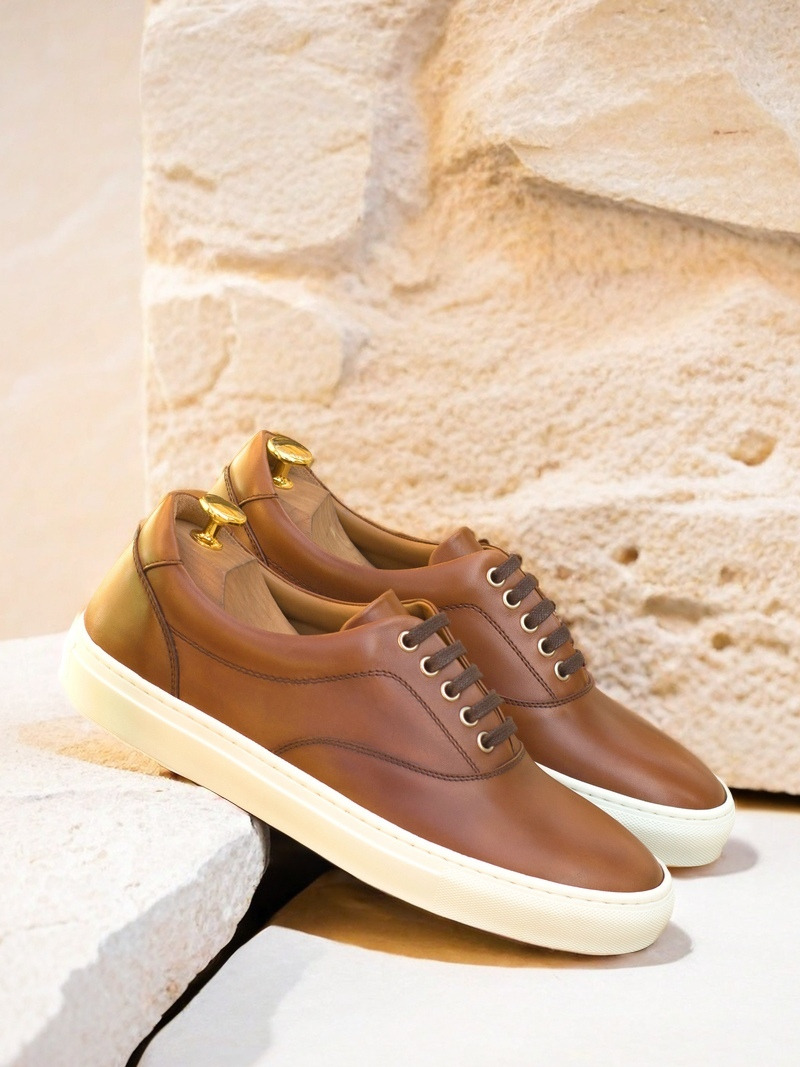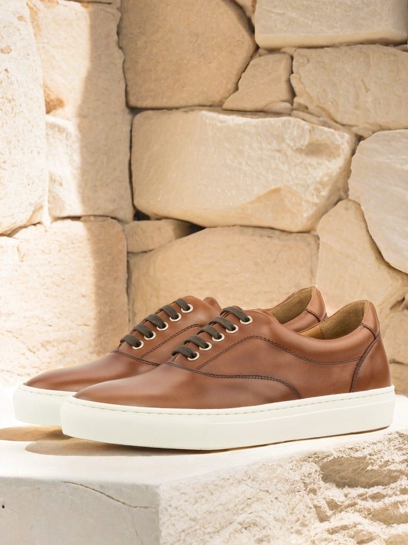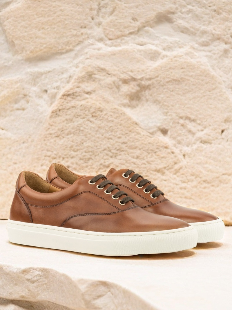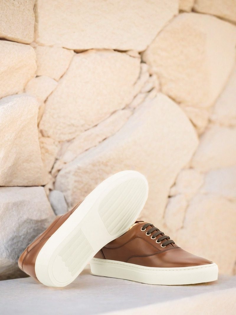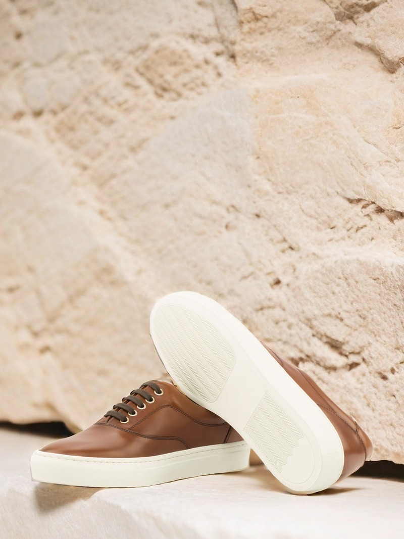 The uppers are made from the finest quality medium brown nappa leather, giving the sneakers a sleek and sophisticated look. The eyelets are made with nickel, adding a touch of elegance to the overall design. To complete the look, the laces are in a matching brown color, creating a cohesive and polished appearance.