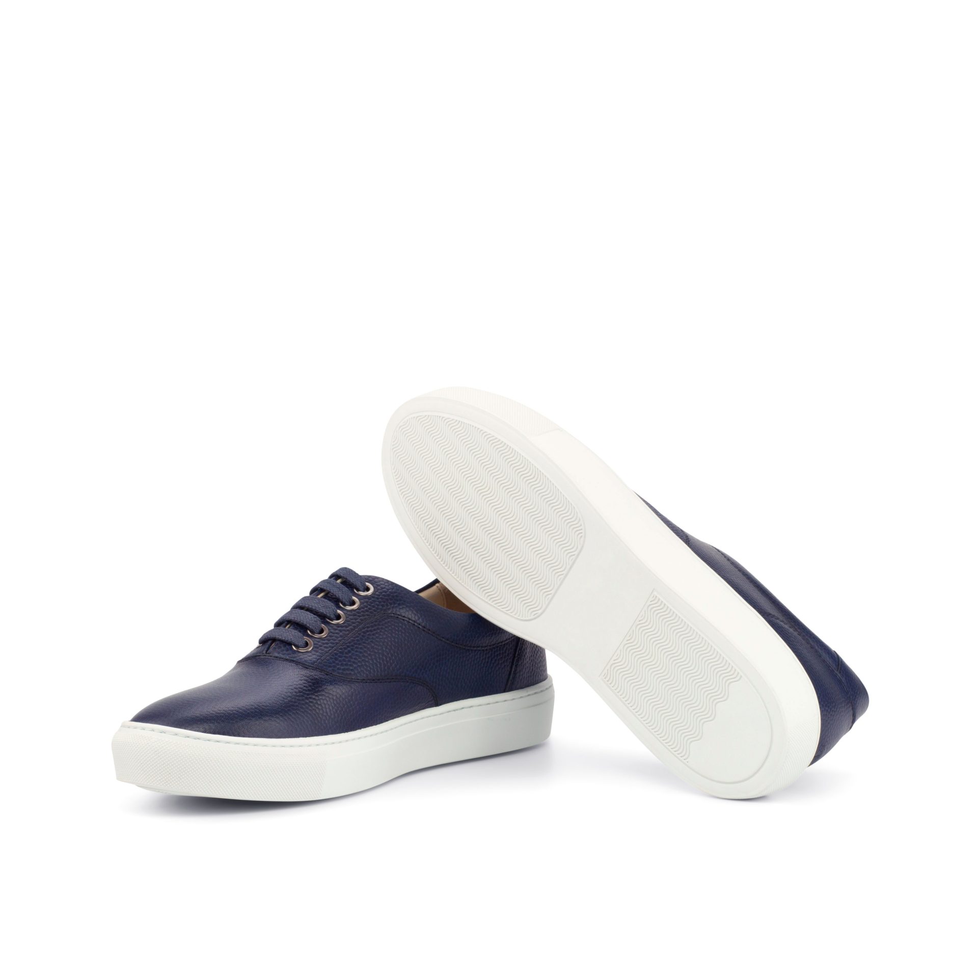 The upper features Navy Blue Pebble Grain Leather on the toe cap, sides, tongues, back, and heel tab for a cohesive and polished look. A touch of Graphite on the eyelets adds a subtle pop of contrast to the overall design. The laces, in a matching Navy Blue, provide a secure fit while completing the sleek aesthetic.