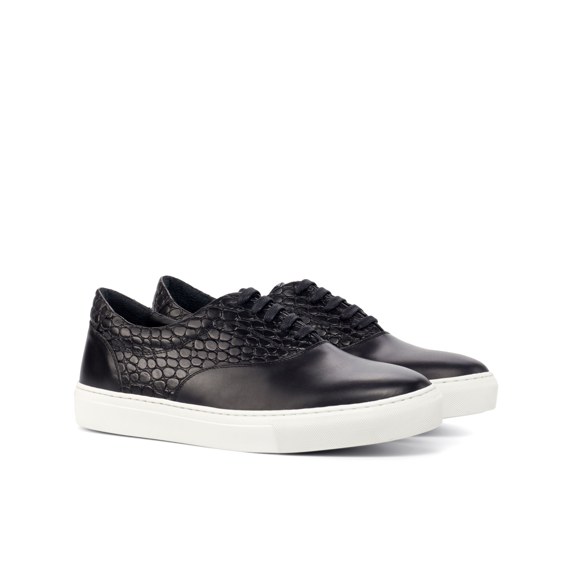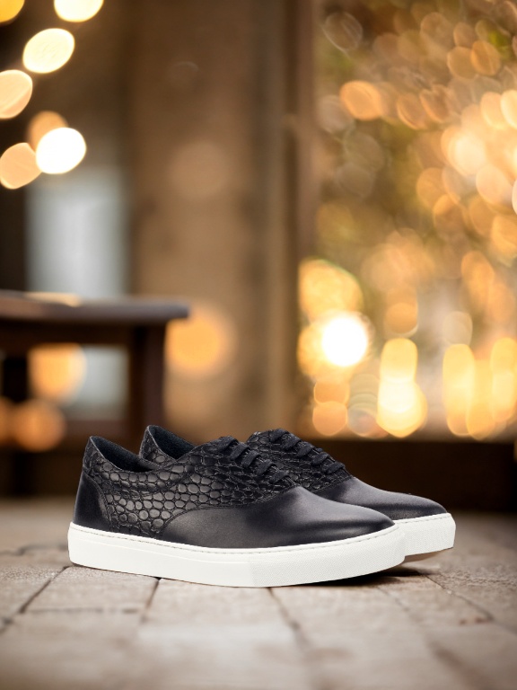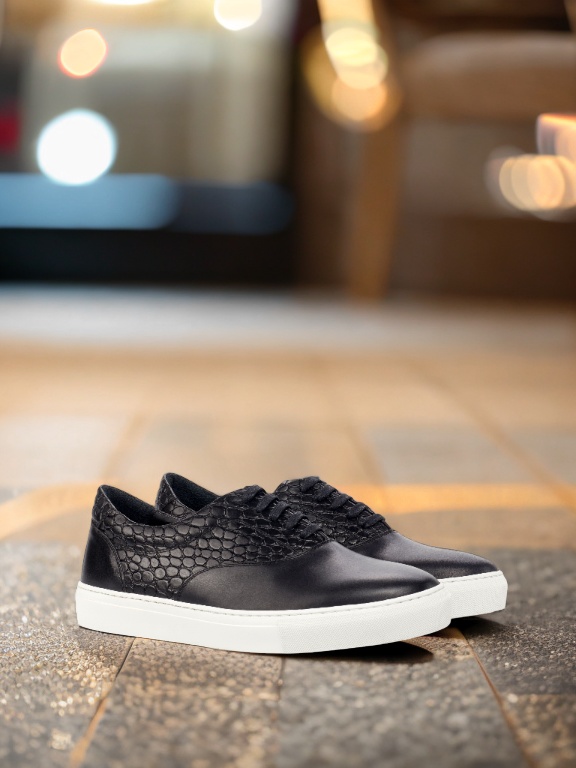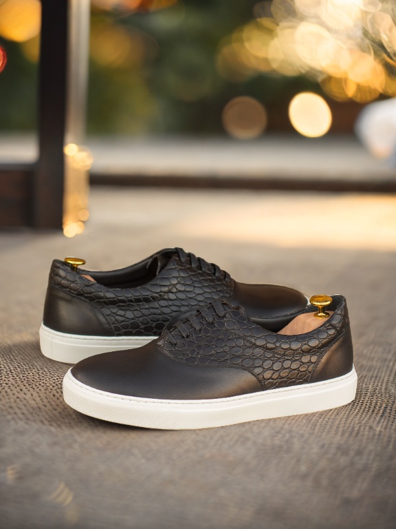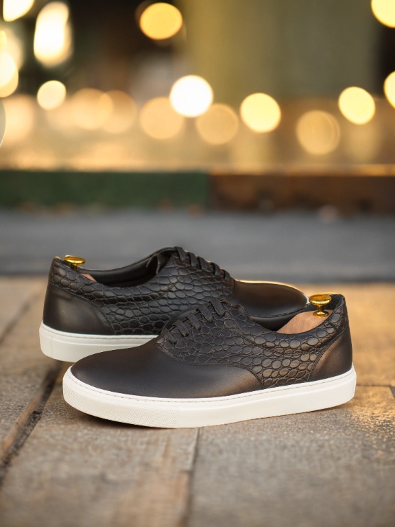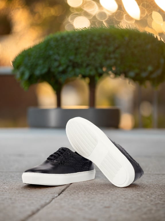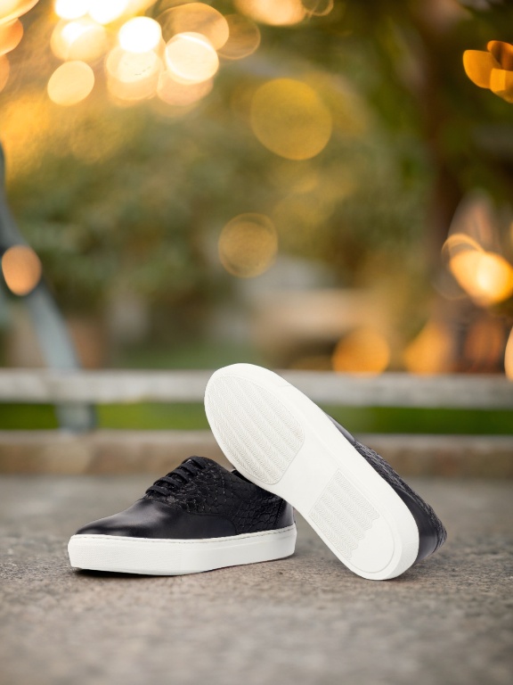 Made with high-quality materials, the upper of the sneaker features a combination of Black Nappa Leather and Black Croco Embossed Calf Leather, giving it a sophisticated and edgy look. The eyelets are blind, giving the sneaker a clean and seamless finish. The black laces blend in seamlessly with the rest of the sneaker, adding to its elegant design.