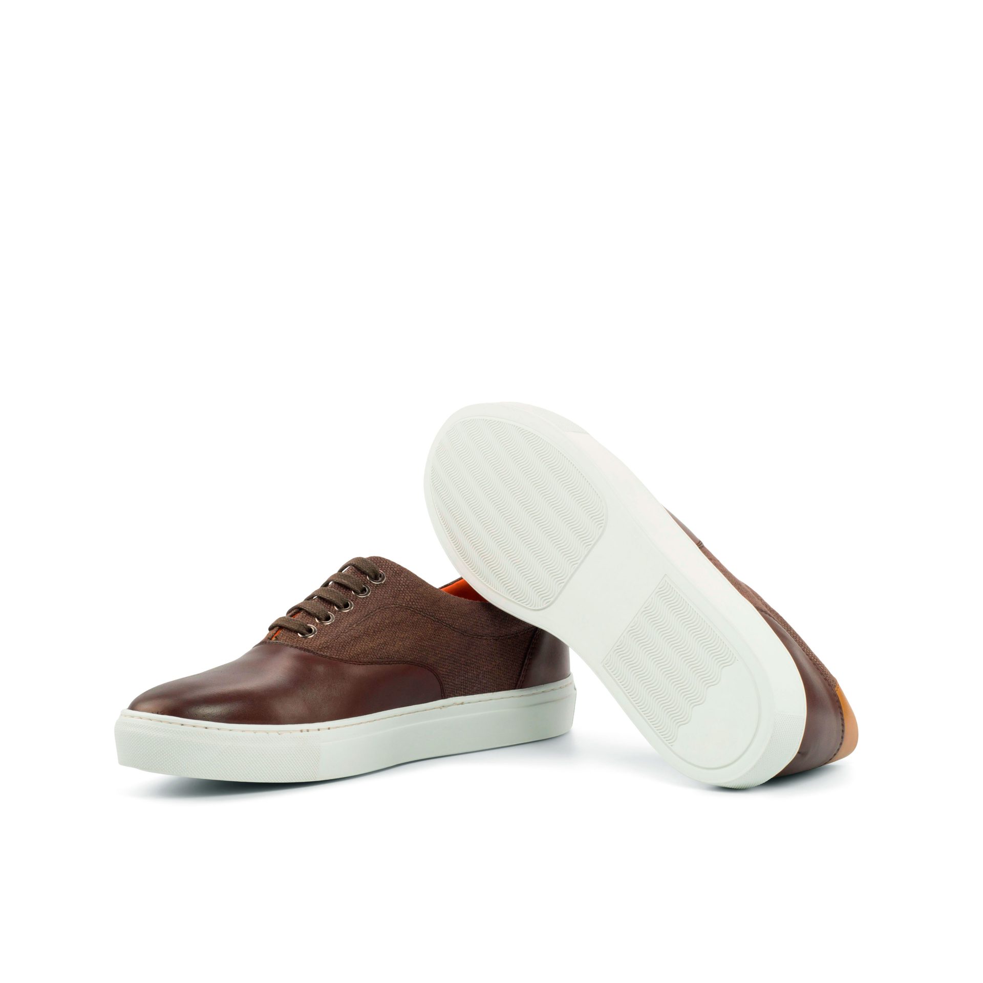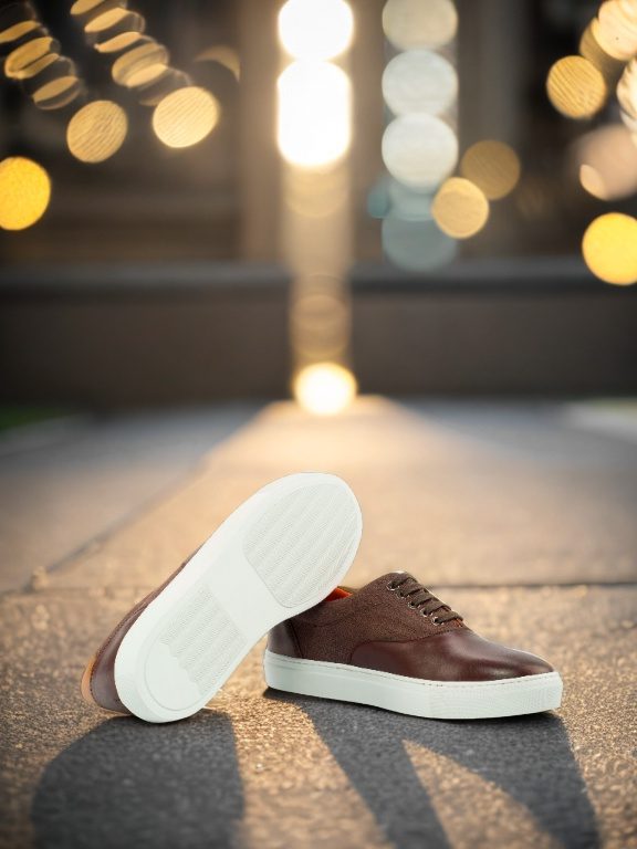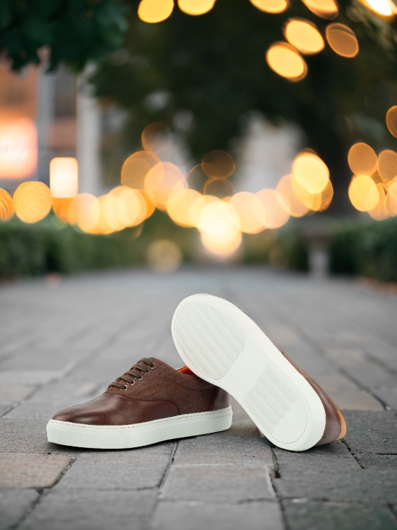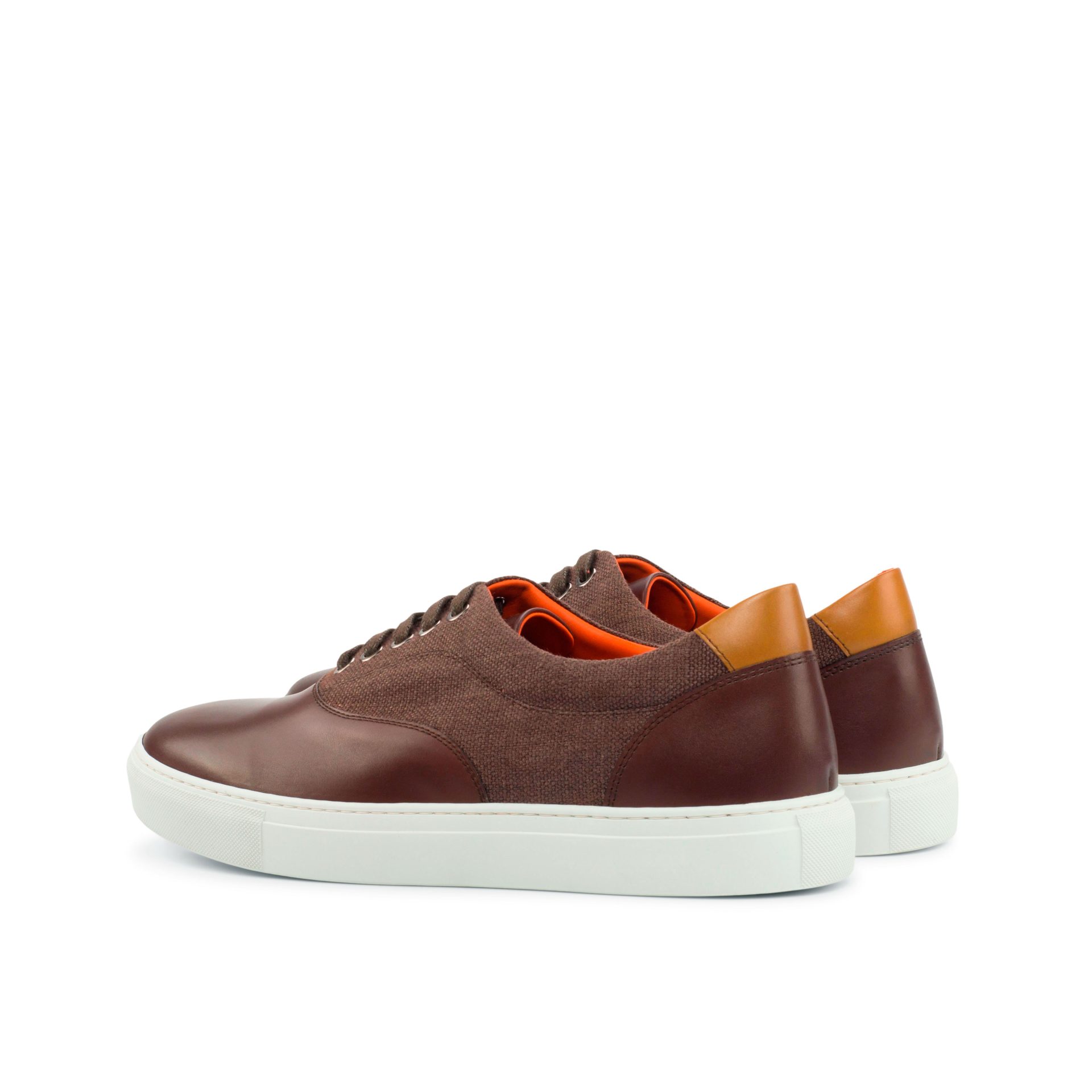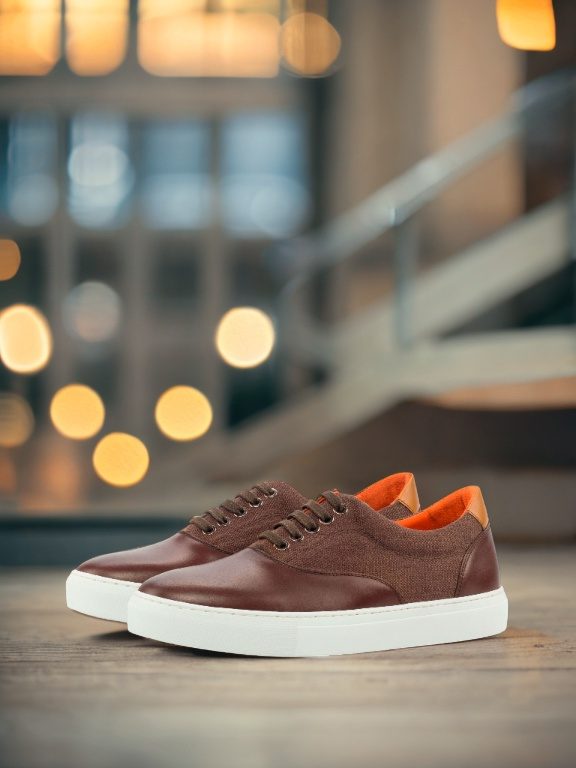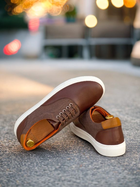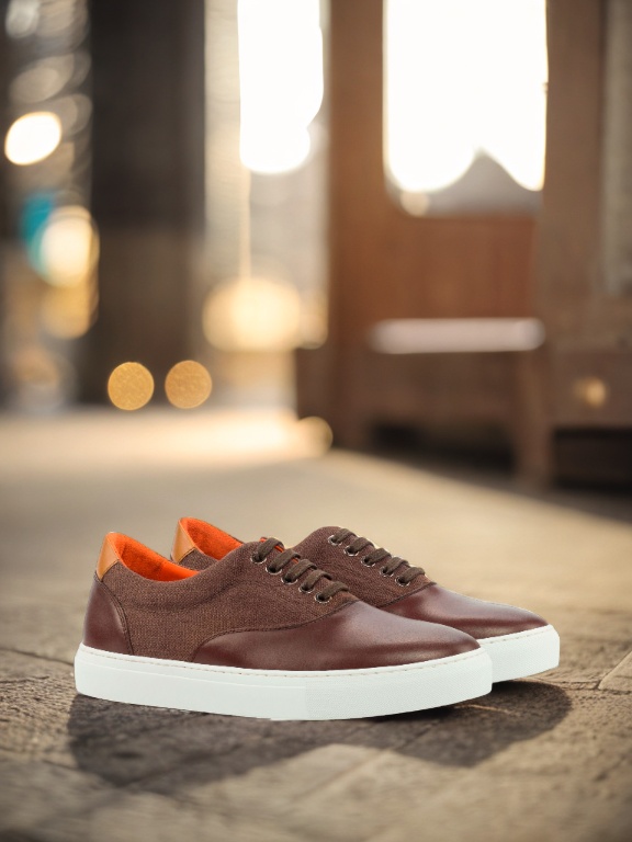 Step up your style with The Ridge Ave. Sneaker No. 4323 from Robert August, a perfect blend of craftsmanship and elegance. This standout sneaker is designed with a striking combination of dark brown painted calf accents, rich brown linen sides, and a cognac-painted calf heel tab, creating a look that’s both refined and versatile. The interior features a luxurious orange calf leather lining that not only adds a pop of character but also ensures maximum comfort with every step. The durable white rubber cupsole guarantees all-day wearability, whether you’re strolling through the city or heading to a casual outing.