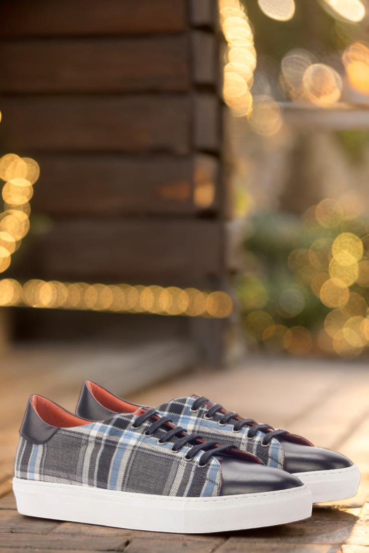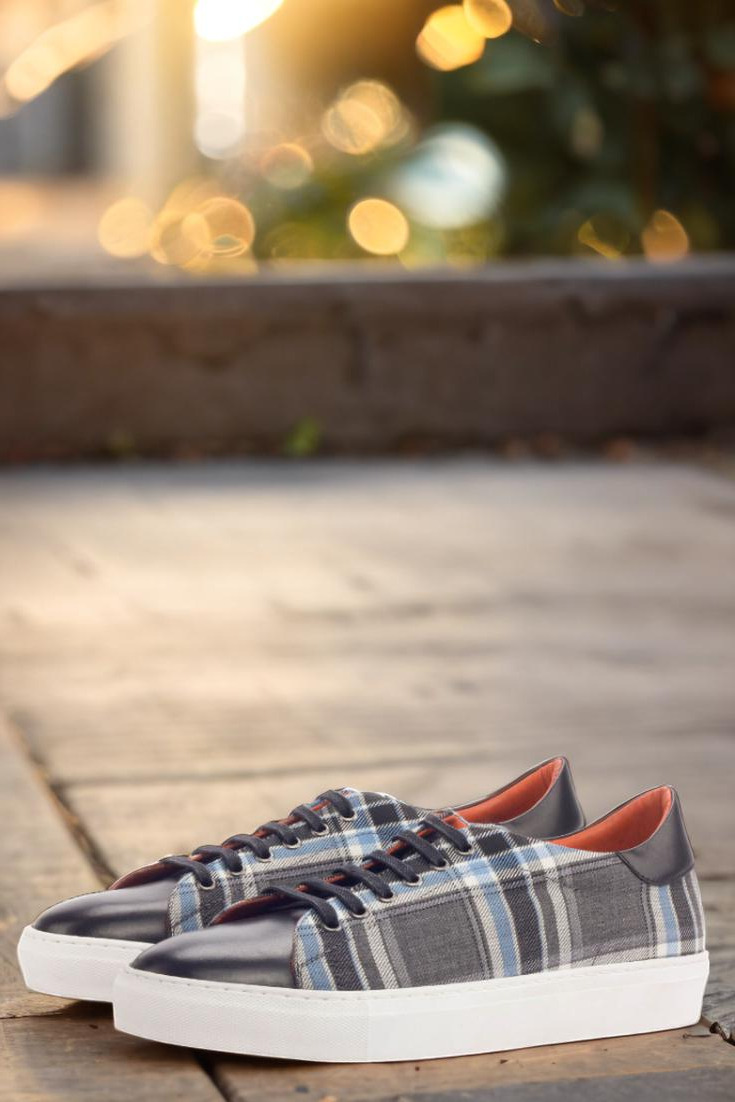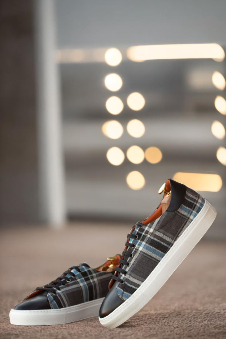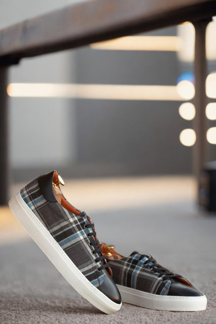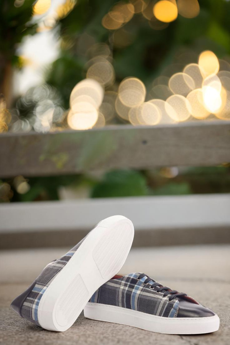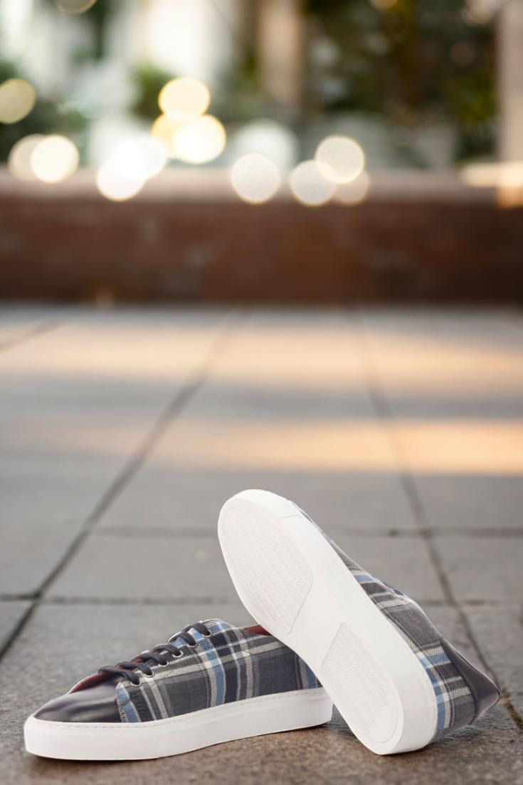 Stand out from the crowd with the striking uppers, made from a mix of grey and blue plaid wool and sleek black nappa leather. The eyelets in graphite add a touch of sophistication while the navy blue laces provide a subtle contrast. But it’s not just about looks, the Bryn Mawr Ave. Trainer also boasts functionality with its durable, white rubber cupsole.