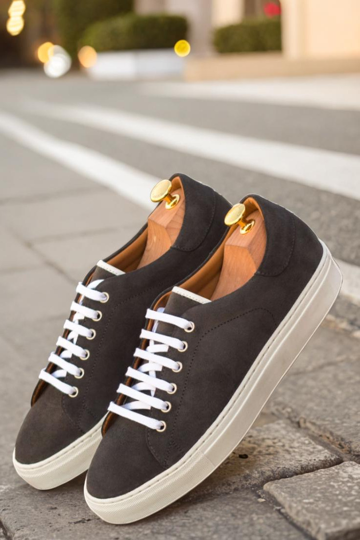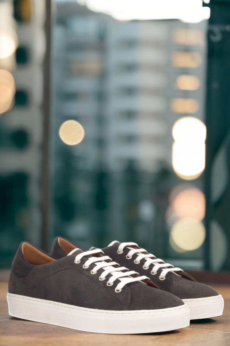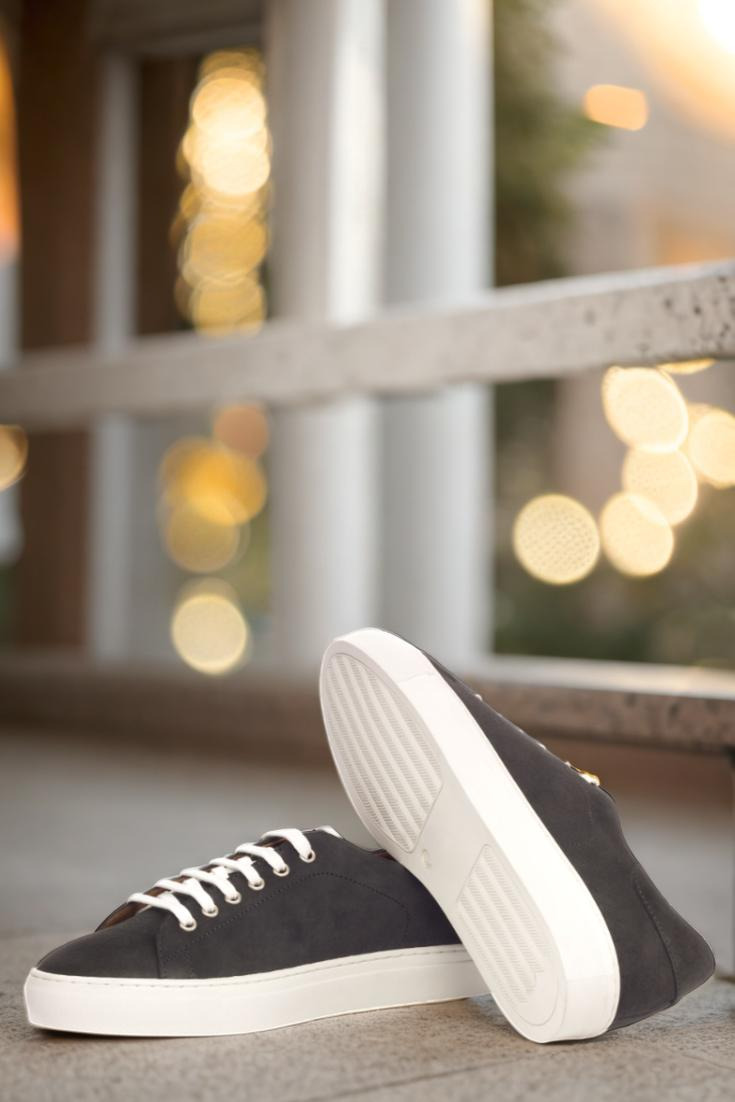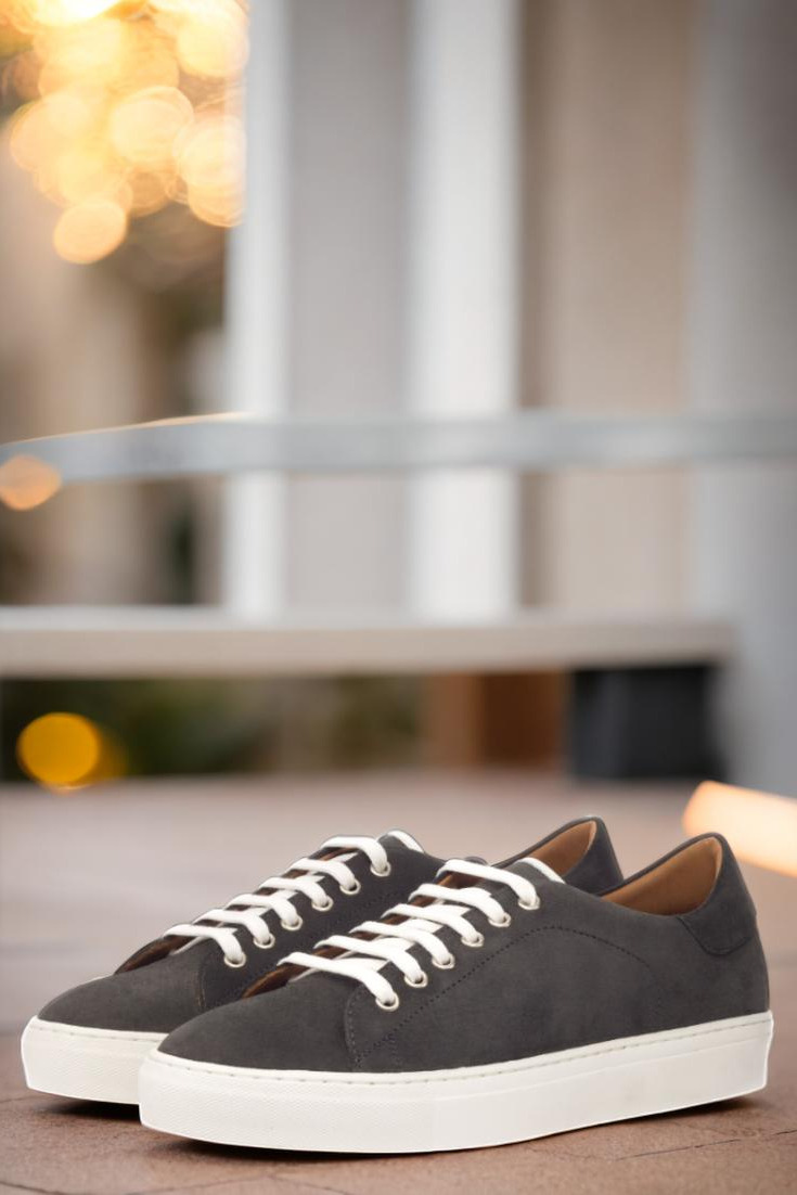 Introducing the Bryn Mawr Ave. Trainer No. 3439 from Robert August. Designed for those who appreciate sleek and modern style, this shoe boasts a clean and crisp look that will elevate any outfit. Its uppers are crafted from luxurious grey suede, giving it a sophisticated touch. The eyelets are made of high-quality nickel, adding a subtle shine to the shoe’s overall design. To keep things minimal yet classy, we’ve paired it with crisp white laces that perfectly complement the grey suede.