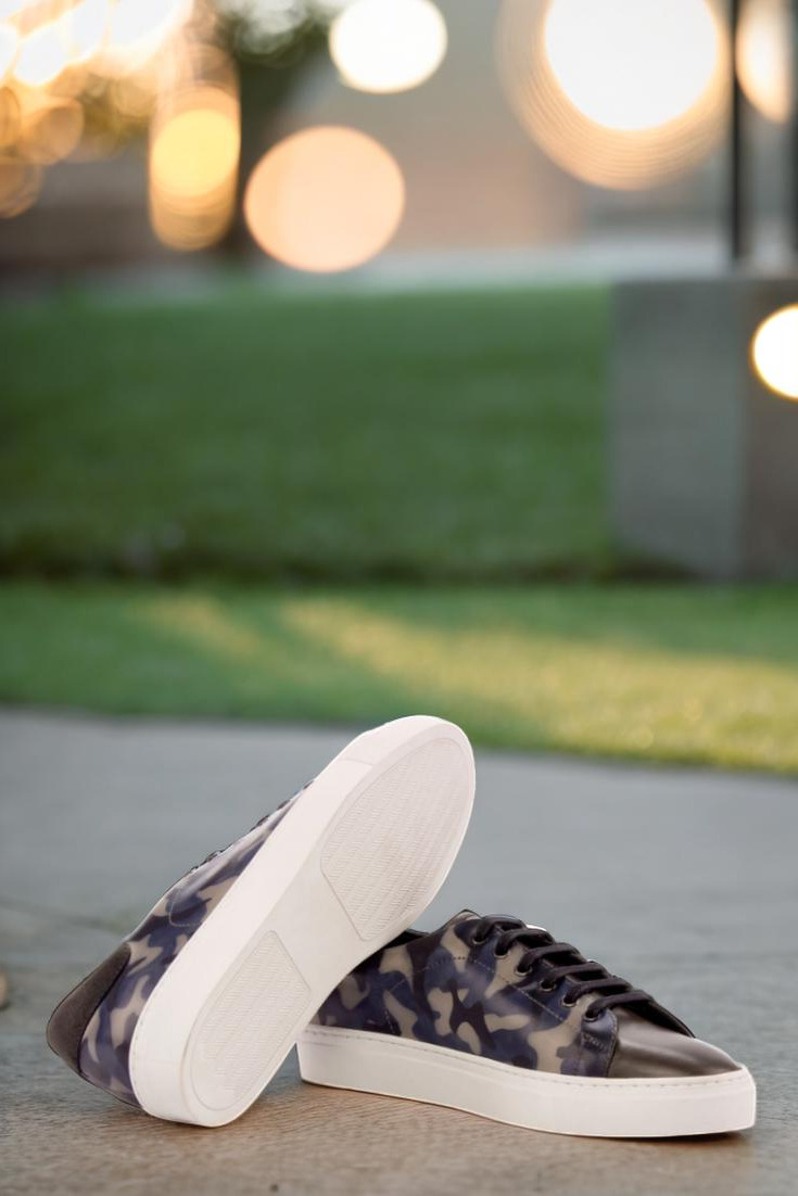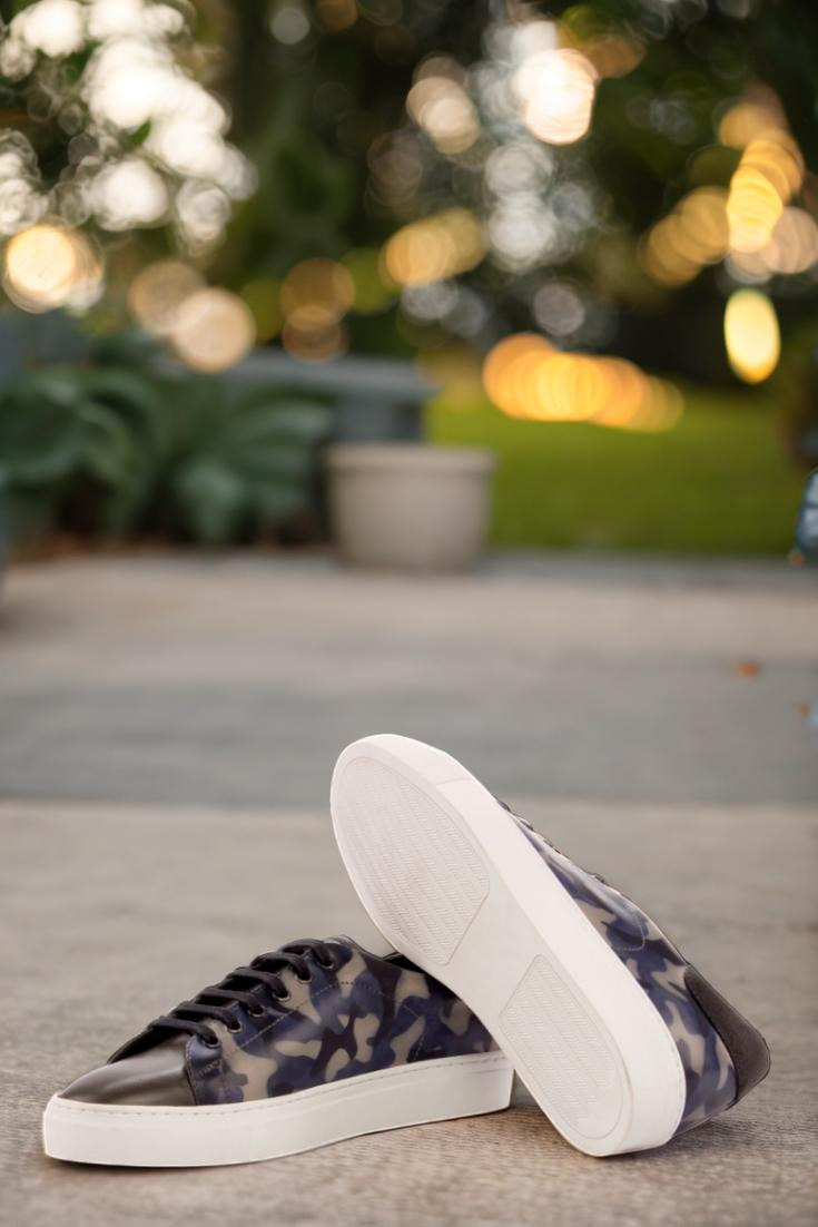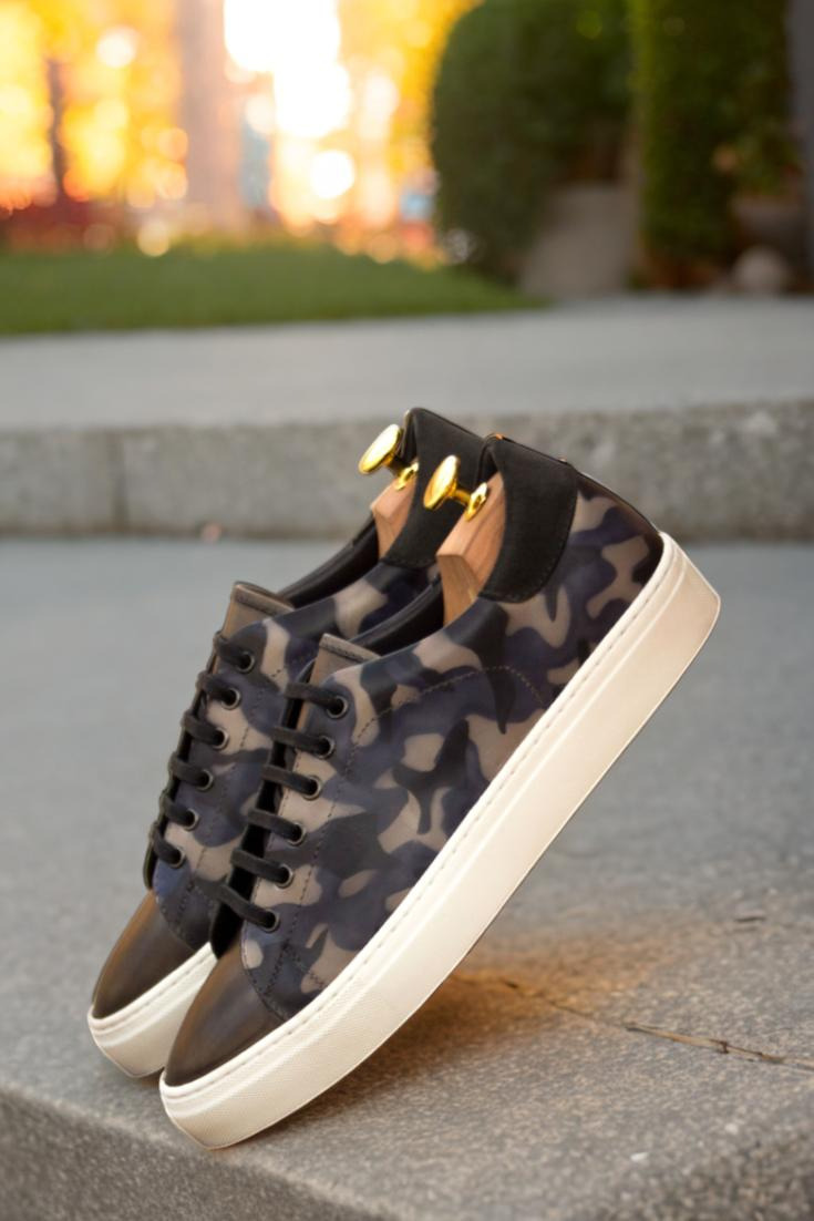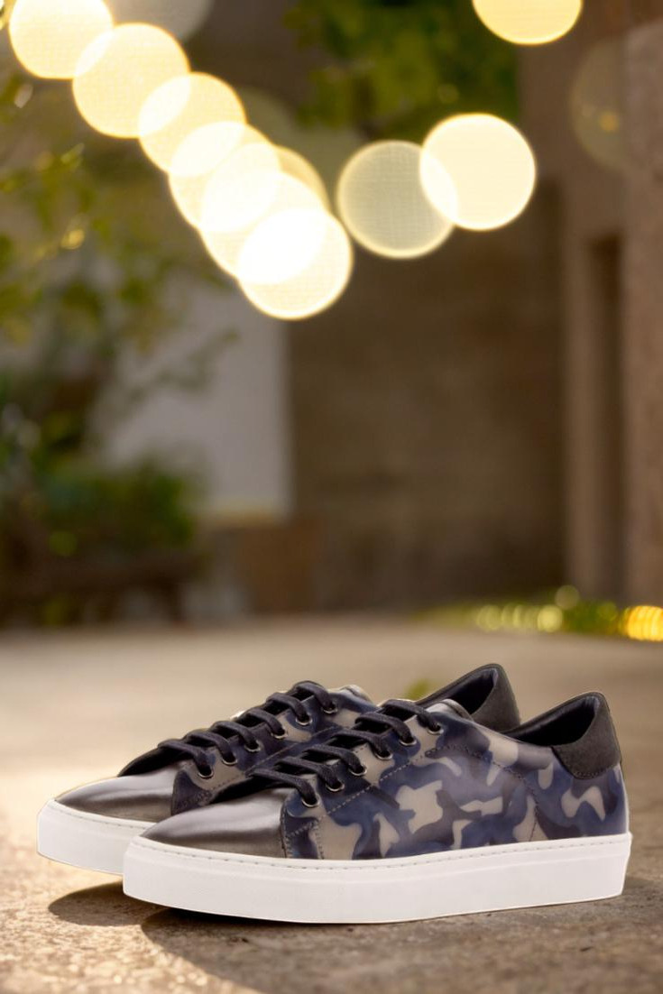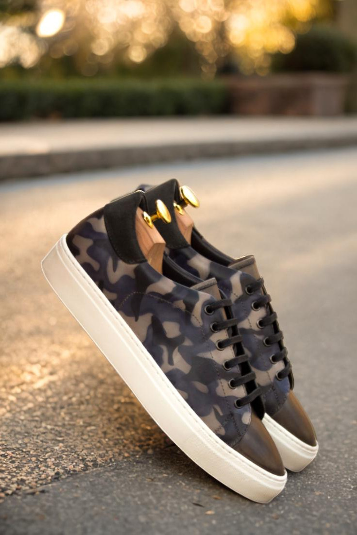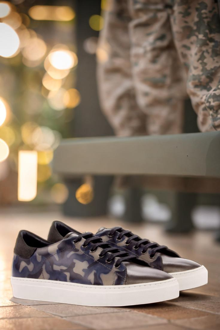 The patina style of these trainers is inspired by the iconic camo pattern, giving them an edgy and stylish look that is sure to turn heads. Graphite eyelets and black laces add a touch of sophistication, while the navy blue calf leather lining provides added comfort and durability.