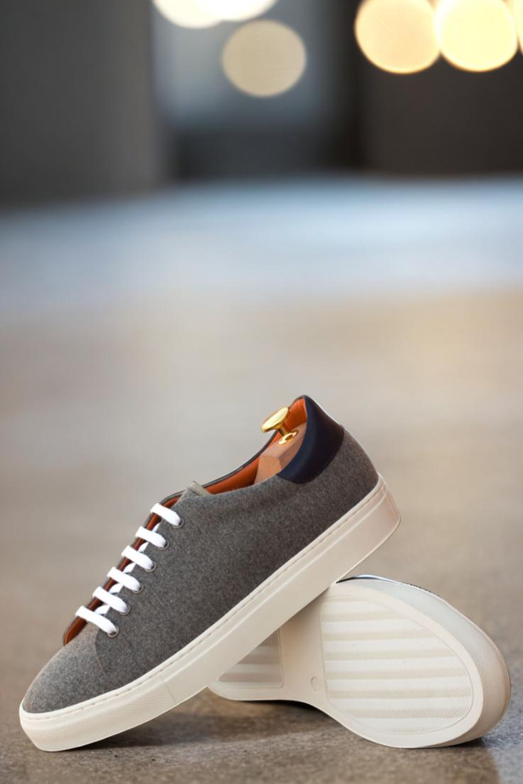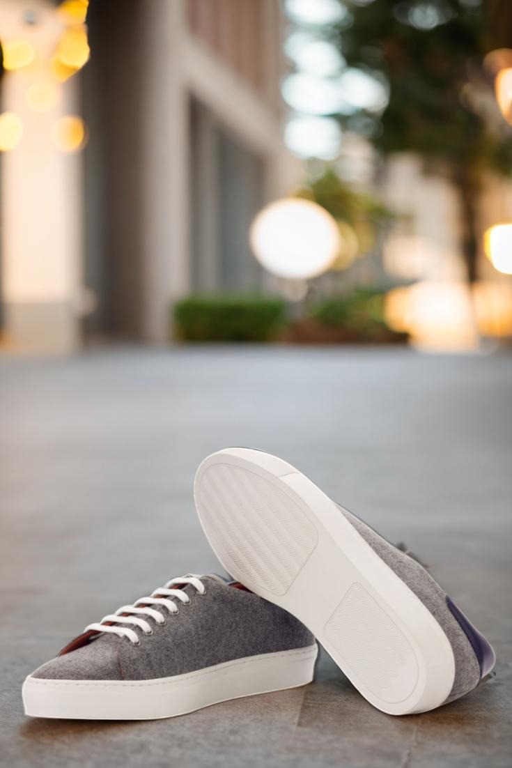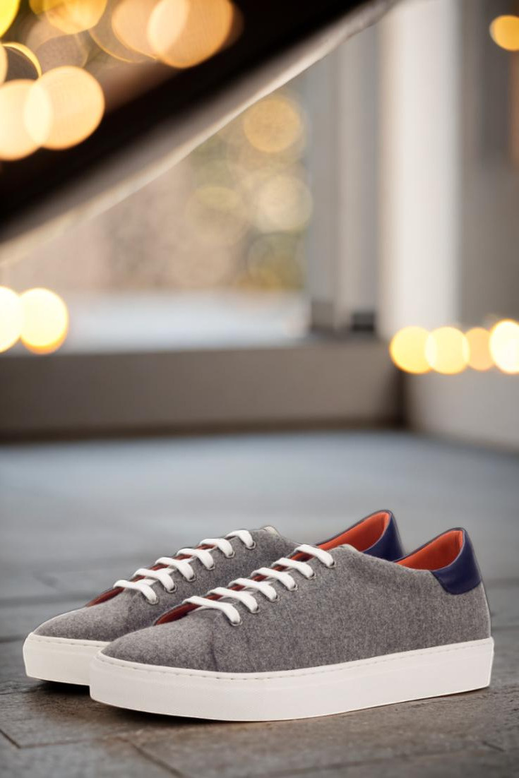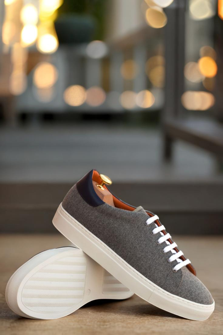 The upper of the Bryn Mawr Ave. Trainer is made from a luxurious light grey flannel material, with accents of navy blue painted calf leather for a pop of sophistication. The eyelets are a sleek graphite, perfectly complementing the overall design. And let’s not forget about the crisp white laces that add a touch of contrast and elevate the overall look.