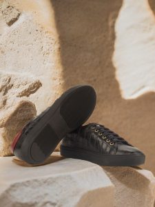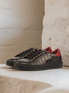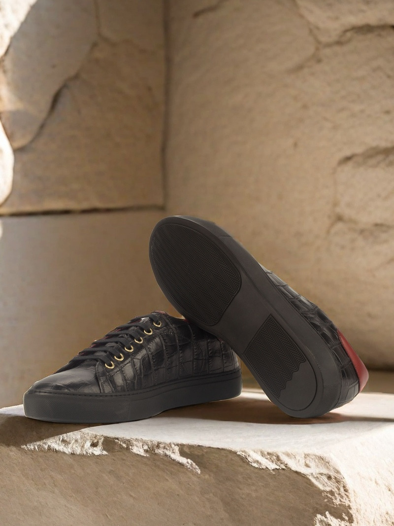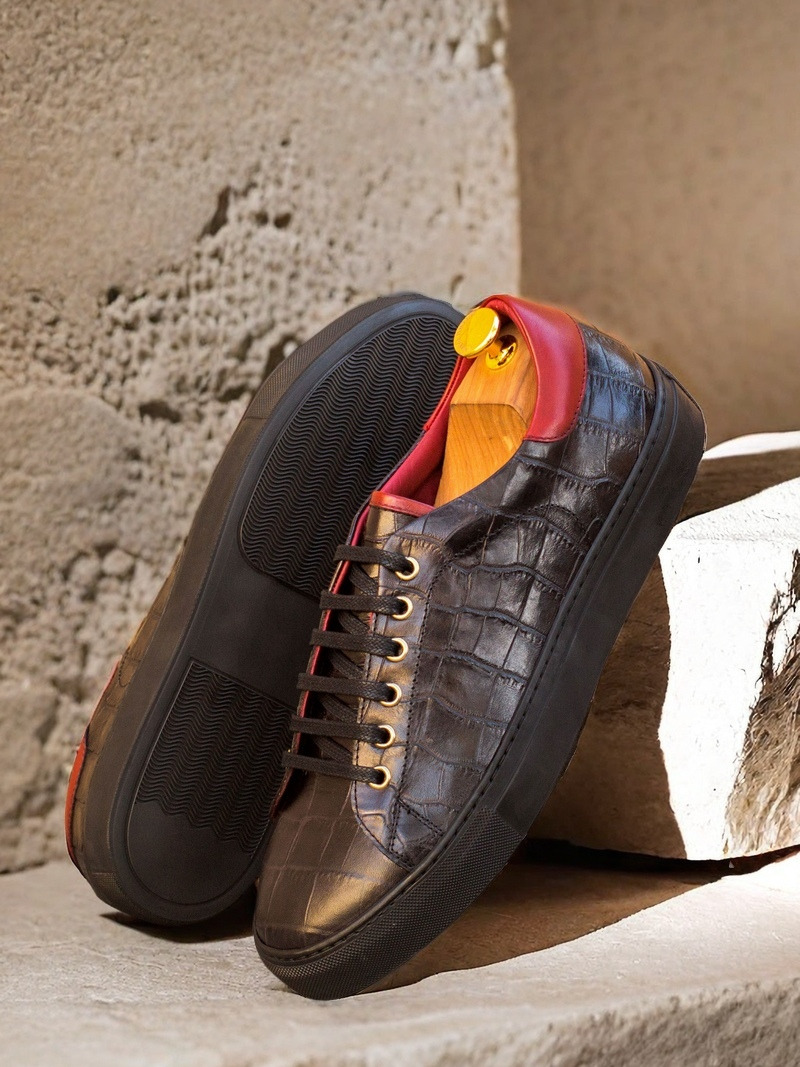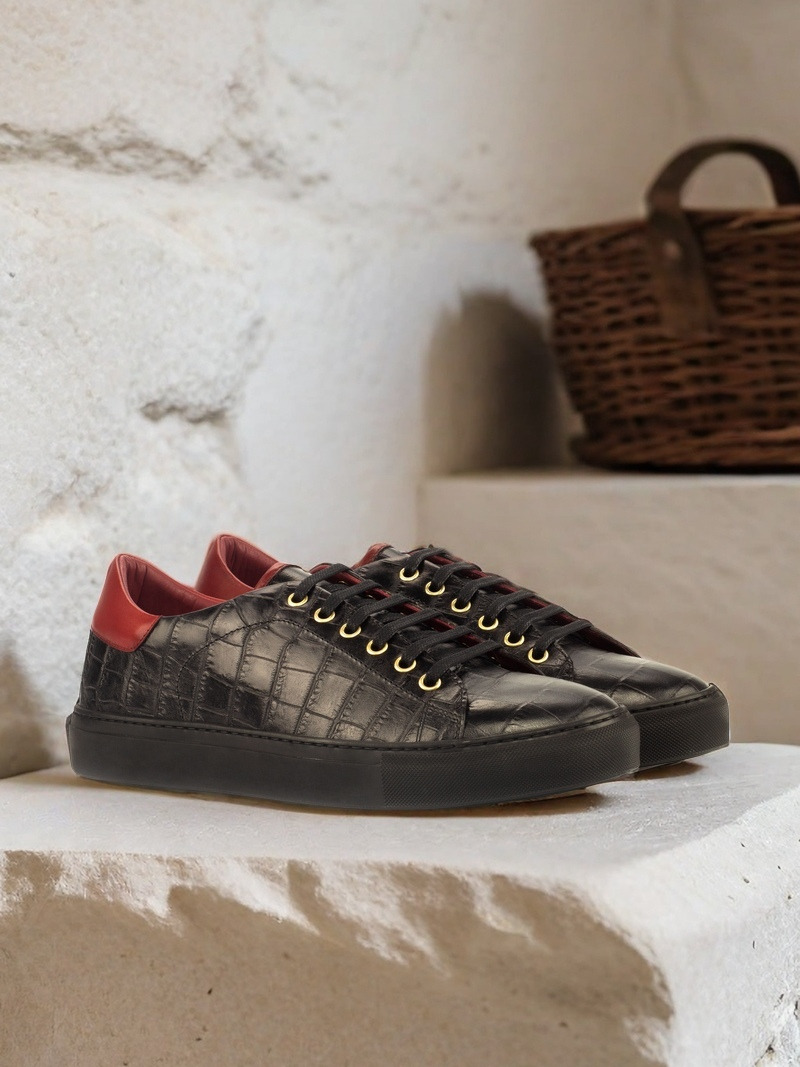 The Uppers are made of Black Croco Embossed Calf and Red Painted Calf, giving them a sophisticated and luxurious look. The eyelets, in a rich gold color, add a touch of elegance to the overall design. Complete with Black laces and a Red Calf Leather lining, these trainers are the epitome of luxury and craftsmanship.