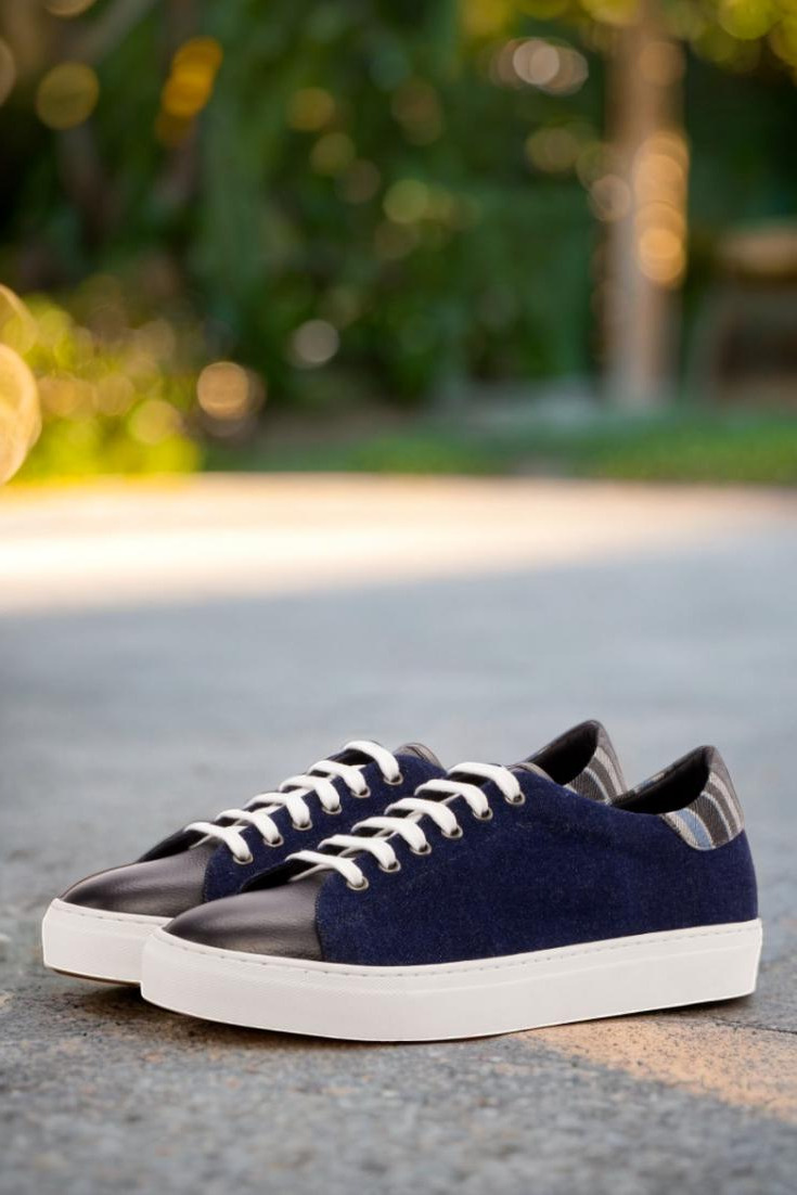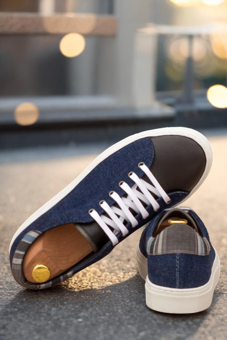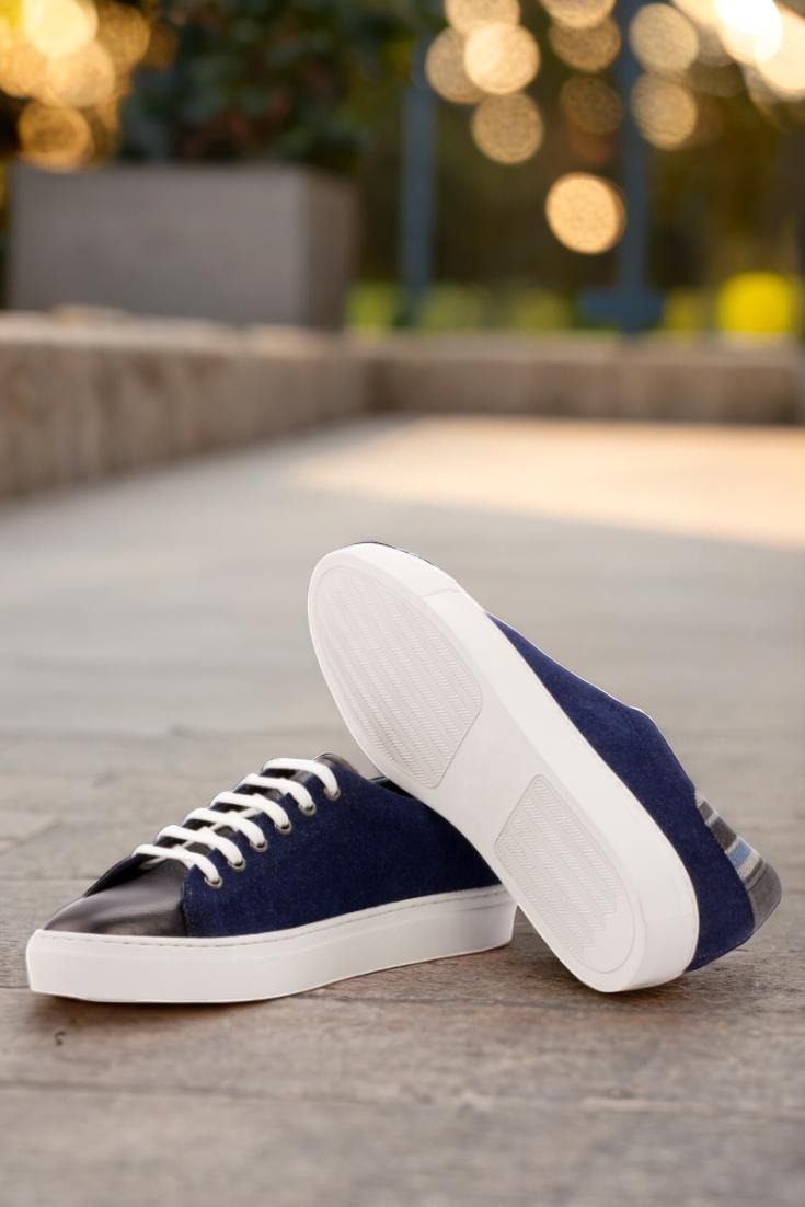 Designed and handcrafted in sunny Spain, the Bryn Mawr Ave. Trainer No. 3913 from Robert August is the ultimate blend of style and craftsmanship. Our team of skilled artisans have spared no expense in creating a trainer that is truly a cut above the rest. The uppers are made from the highest quality black full grain leather, ensuring durability and a timeless, sophisticated look. Paired with jeans featuring a trendy plaid wool pattern, these trainers are perfect for adding a touch of edge to your wardrobe.