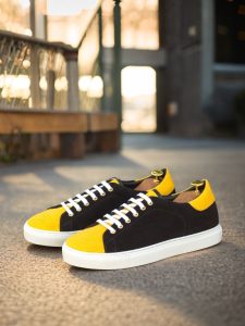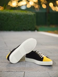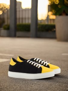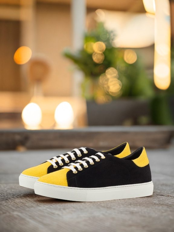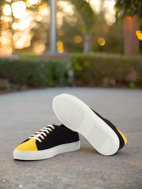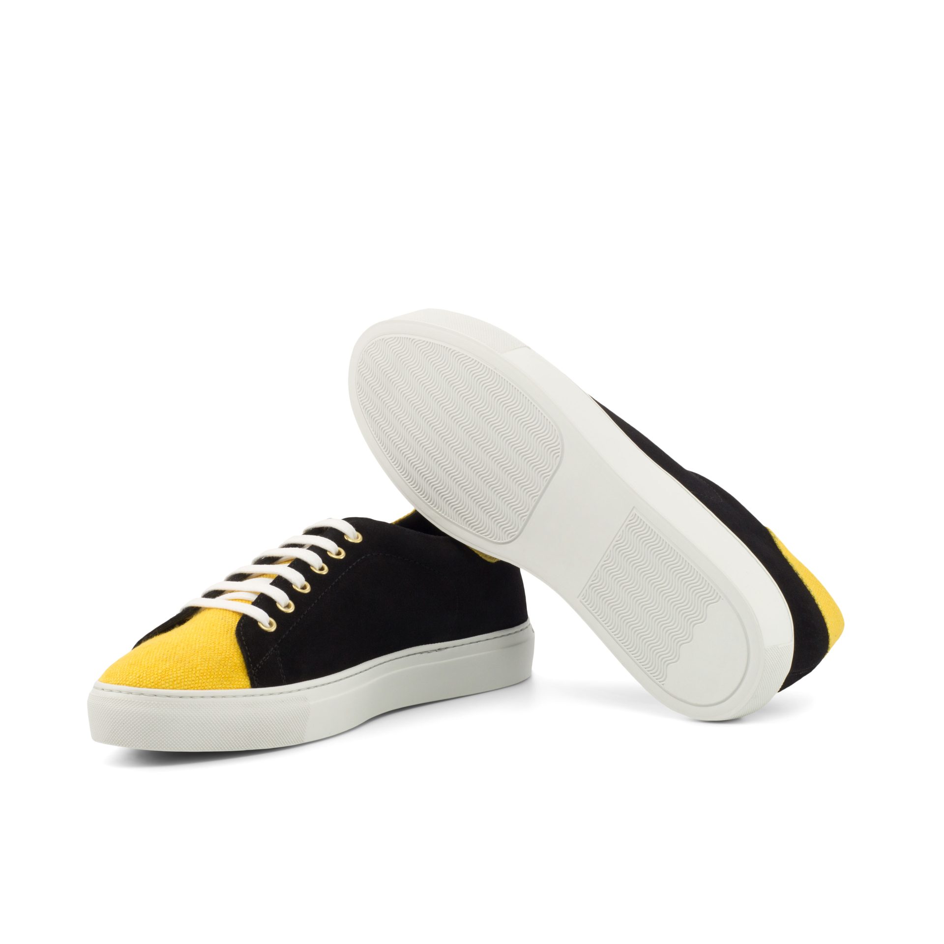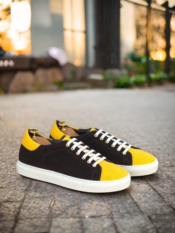 Crafted with care and precision in Spain, this trainer boasts a stunning mustard yellow linen toe cap, exuding elegance and bringing a pop of color to your ensemble. The sides are made with black luxe suede, adding a touch of texture and sophistication, while the back features the same mustard yellow linen as the toe cap for a seamless finish.
