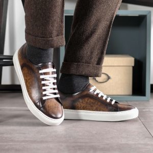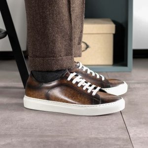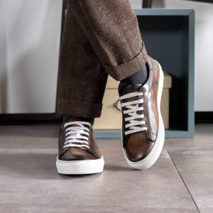 The uppers are constructed from a high-quality brown marble hand patina leather, giving the shoe an elegant, sophisticated look. Patina intensity is dark, making the shoe visually striking and distinct, while white laces bring balance to the design. Inside the shoe is a soft brown calf leather lining which will mold comfortably around your feet for a supportive fit. Lastly, a white rubber cupsole finishes off this elegant design for optimum durability and lasting use.