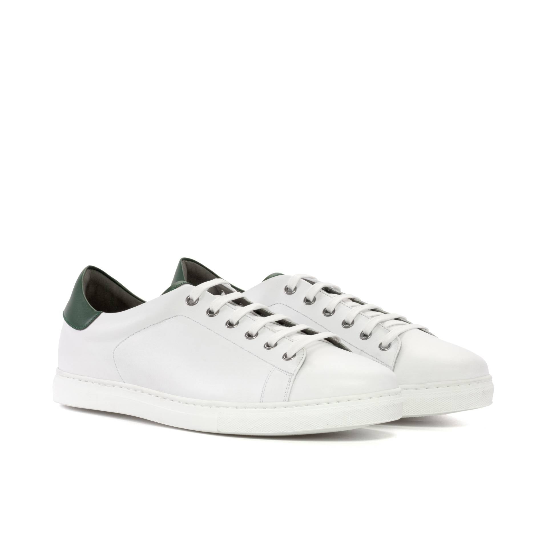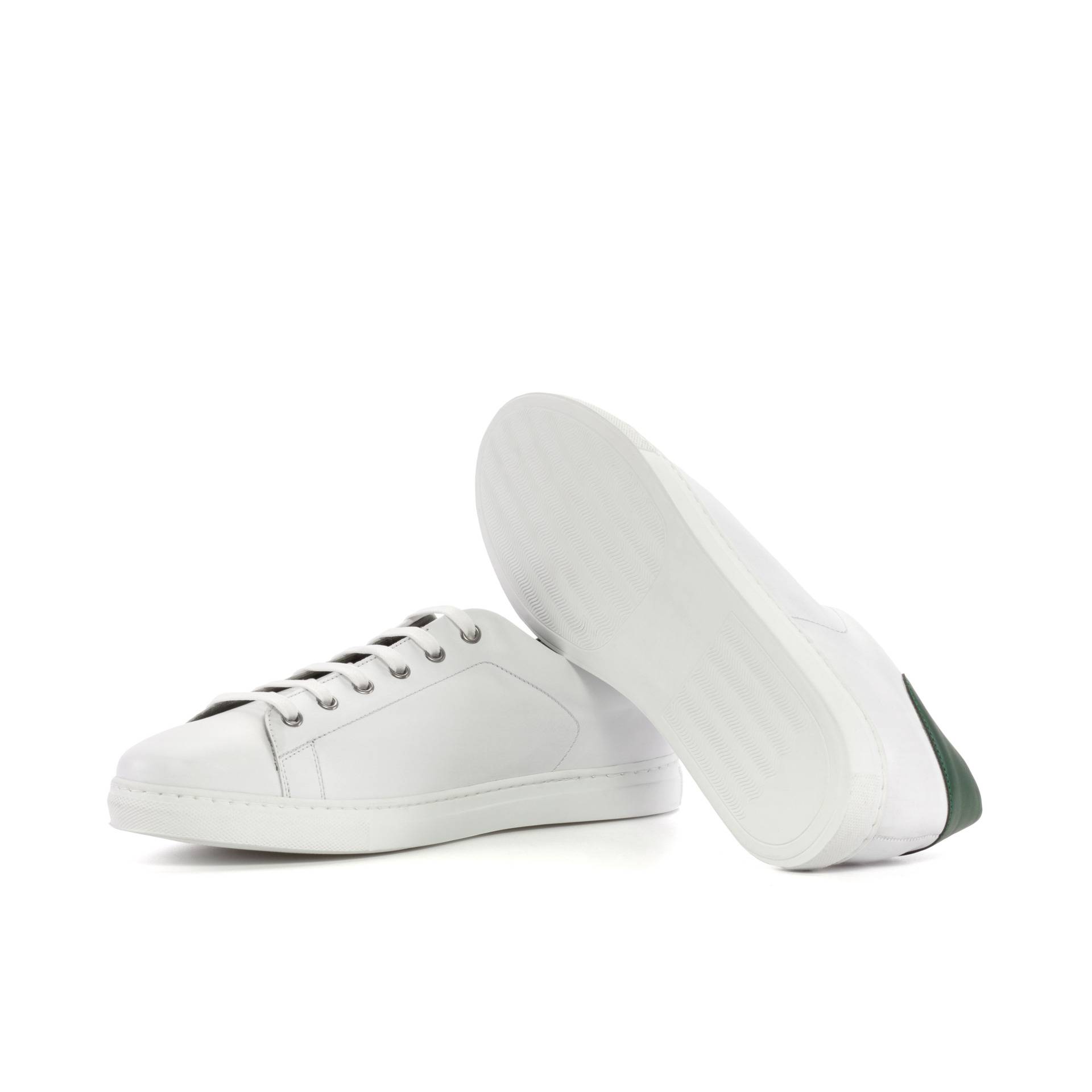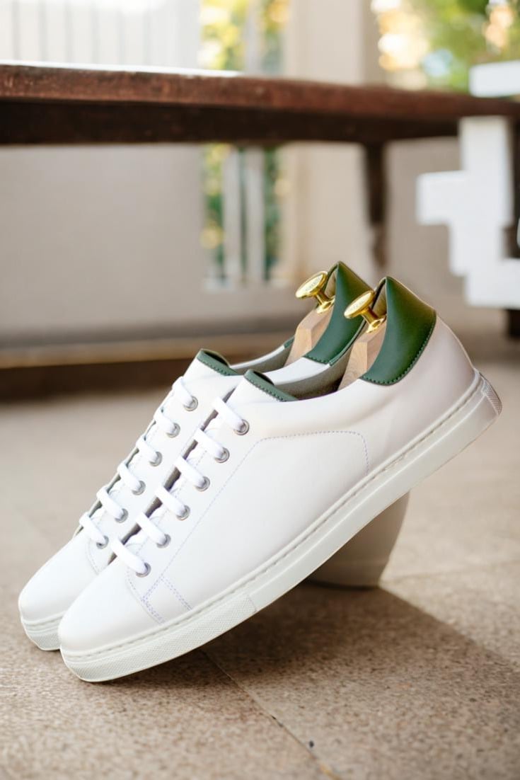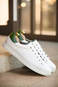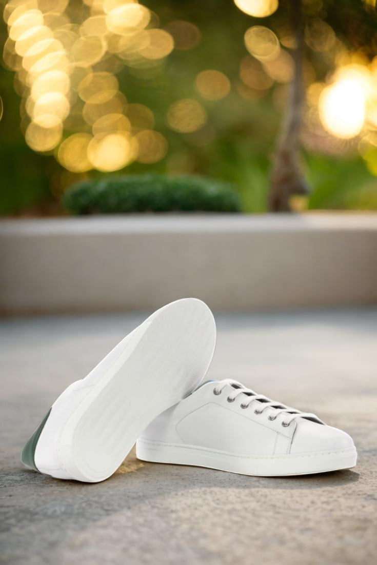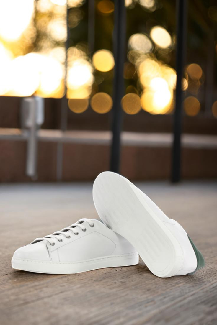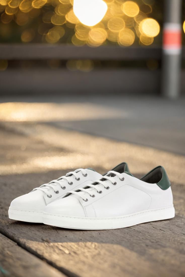 Made with the highest quality materials, the Bryn Mawr Ave. Trainer No. 5844 features a striking combination of white Nappa leather on the toe cap and sides, complemented by rich green vegan Nappa leather on the back and trim. The graphite eyelets add a touch of modern flair, while the white laces provide a clean, crisp finish.