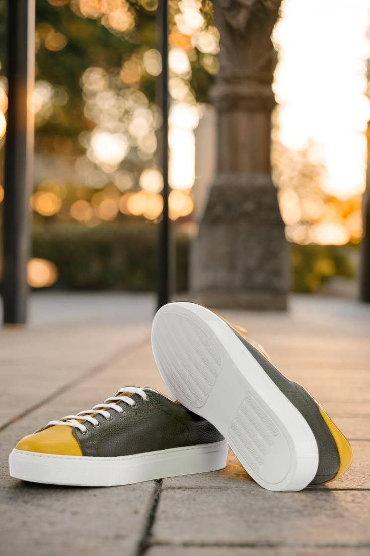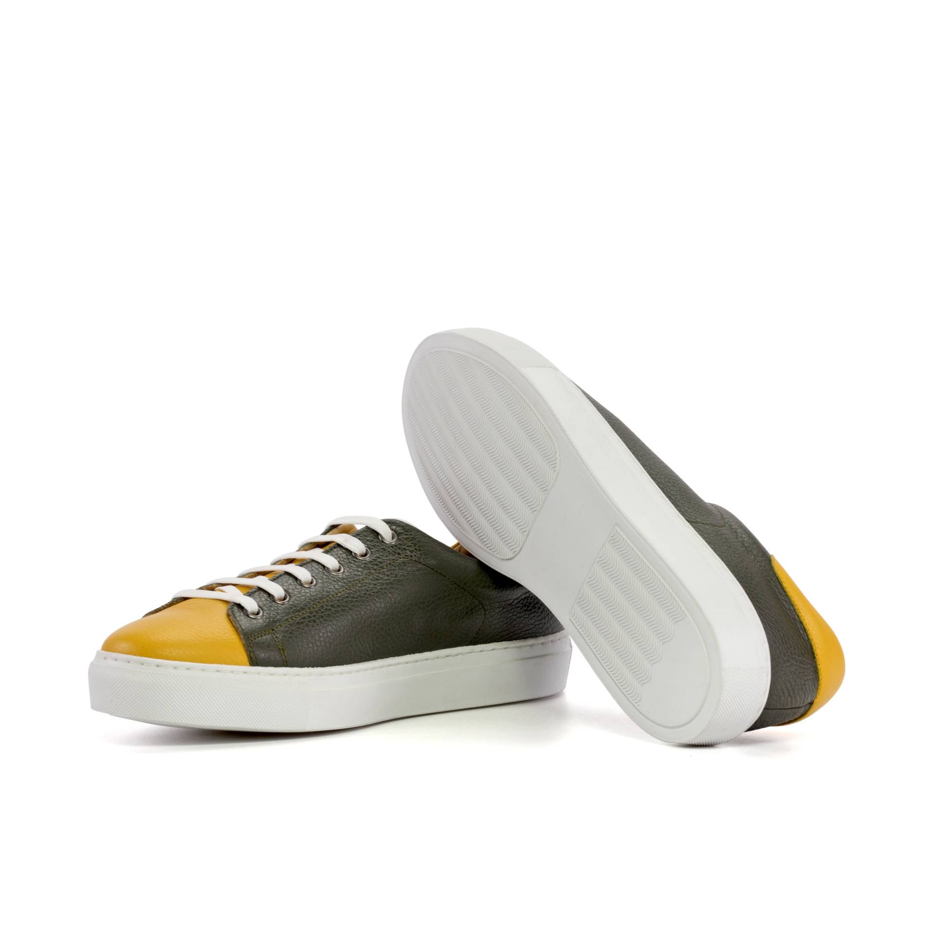 Made with a honey-full grain leather toe cap, olive-full grain leather sides, and a honey-full grain leather back, this trainer exudes a sense of refined taste and class. The exquisite white-nappa leather trim adds a touch of contrast and interest, while the graphite eyelets and white laces provide a subtle pop of color.