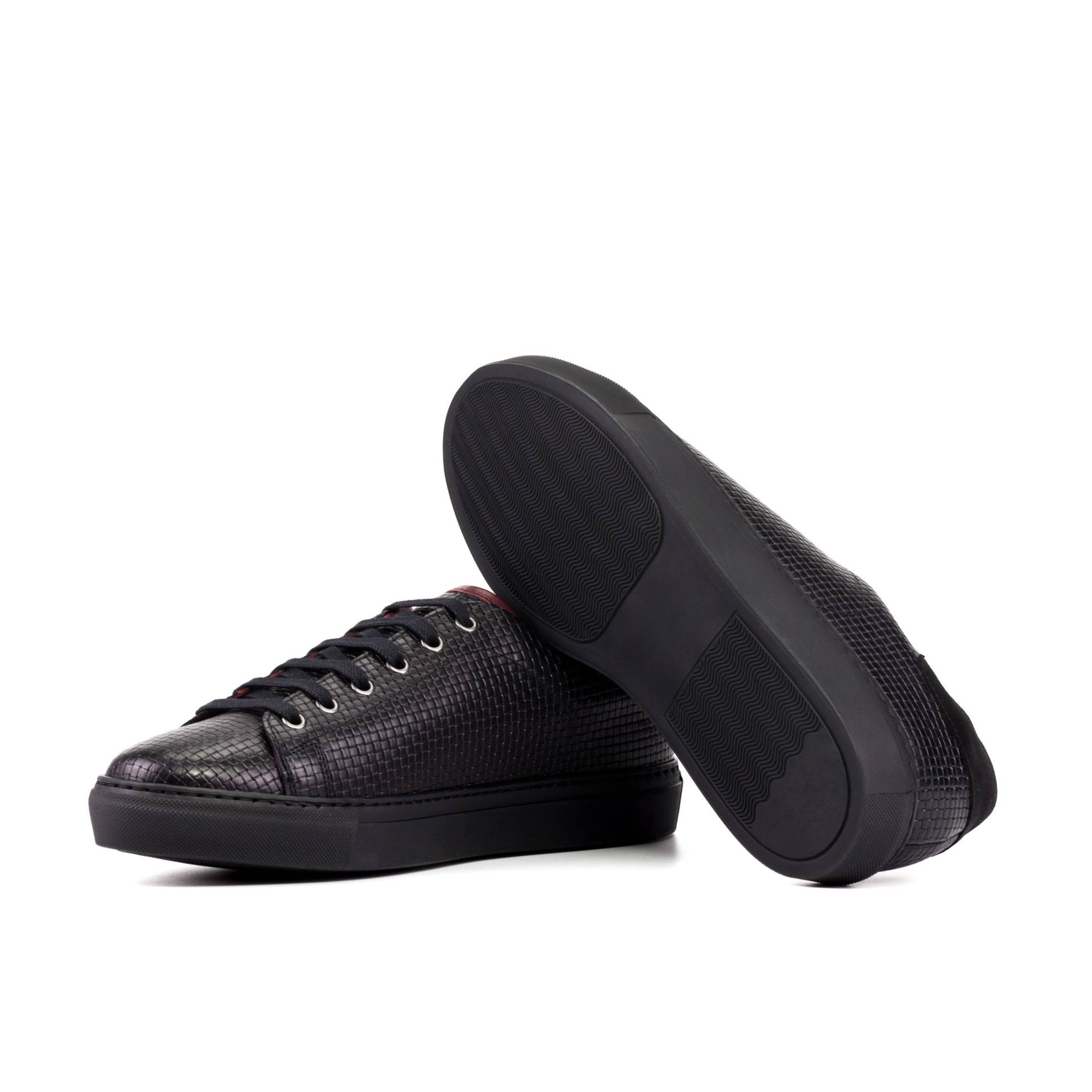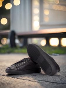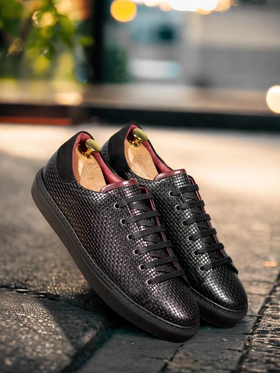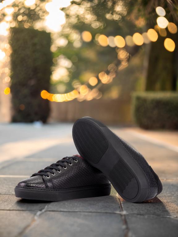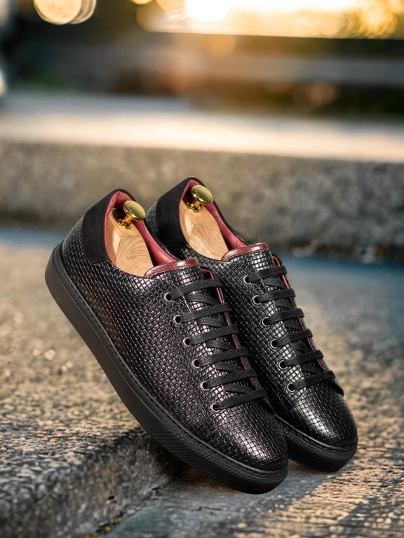Starting from the top, the Toe Cap is made with black woven painted calf leather, giving it a sleek and sophisticated appearance. Moving on to the sides, we use the same material for a consistent and polished look. The back is made with black luxe suede, adding a touch of luxury to the trainer.