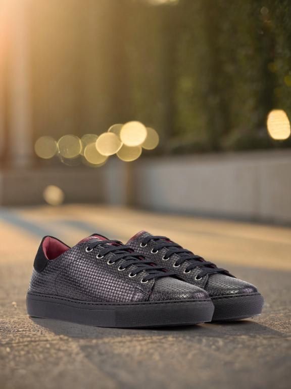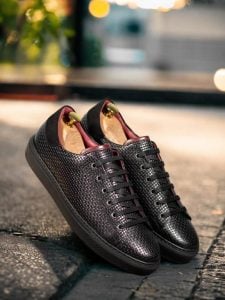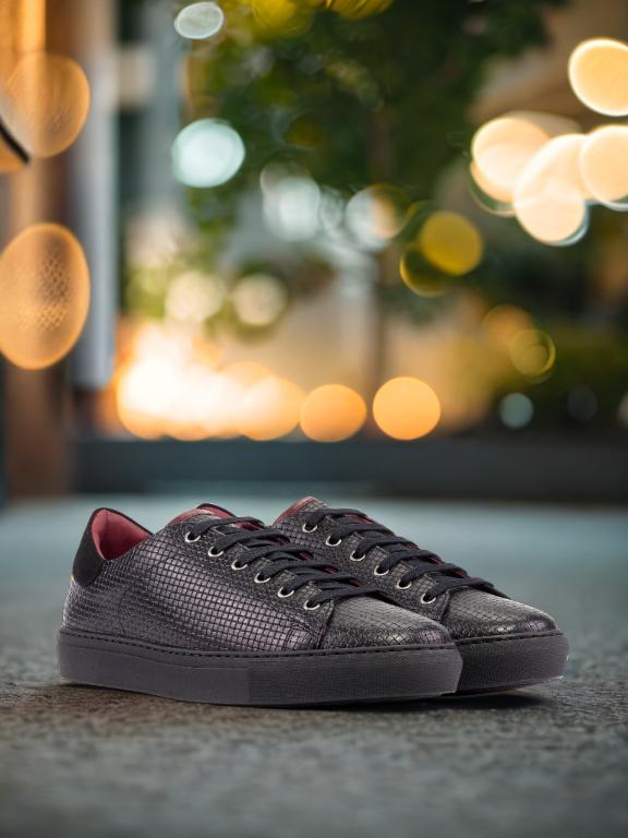 But it’s the small details that truly make this trainer stand out. The trim is made with burgundy nappa leather, adding a pop of color to the otherwise monochrome design. The eyelets are made with graphite, giving a subtle contrast and a modern touch. And to tie it all together, we use black laces for a clean and classic finish.
