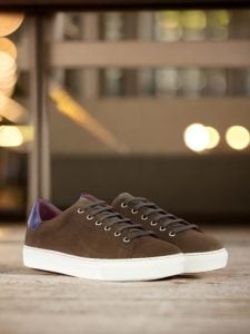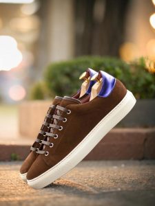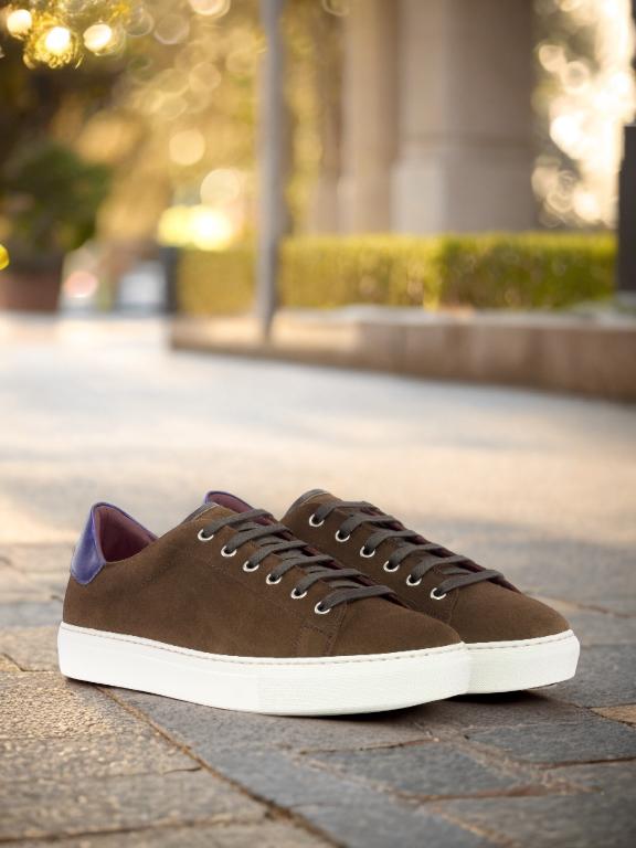 The medium brown luxe suede toe cap and sides give the trainer a classic yet modern look, while the striking purple metallic calf leather back adds a hint of edginess. The dark brown painted calf trim and nickel eyelets elevate the overall design, making it a standout piece in your collection.