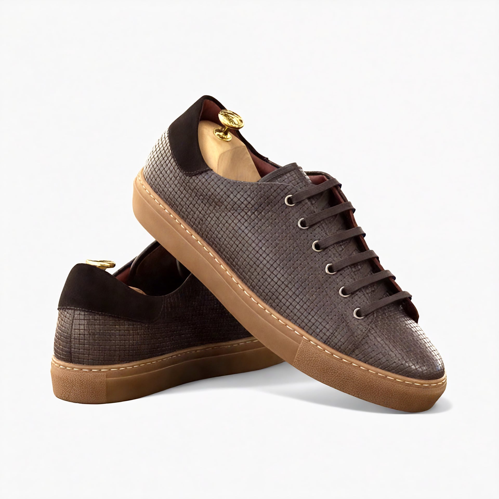 Made with only the finest materials, these trainers feature a dark brown woven painted calf toe cap, sides and back for a unique and eye-catching look. The contrast of the dark brown luxe suede and the graphite eyelets adds a touch of effortless sophistication.