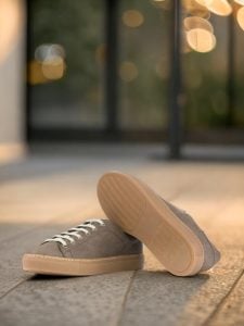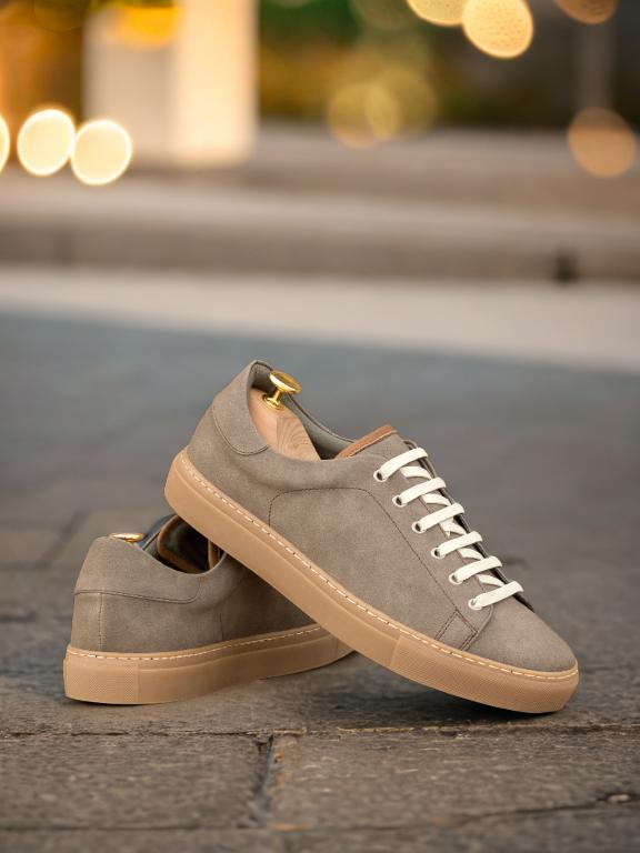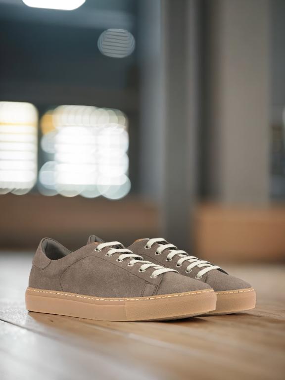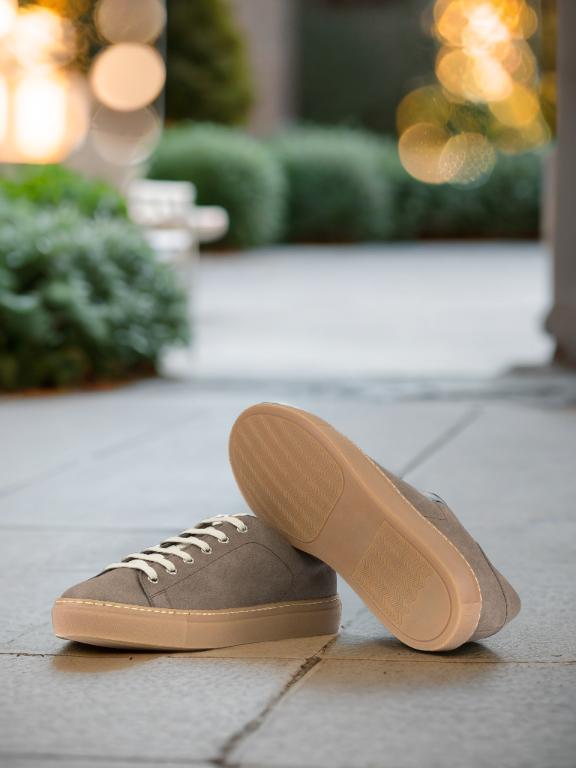 The toe cap, sides, and back of this trainer are made with luxurious taupe vegan suede, giving it a soft yet sophisticated look. The trim adds a touch of warmth with its medium brown vegan suede, while the eyelets in graphite provide a subtle but distinctive pop of color.