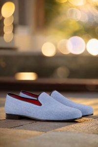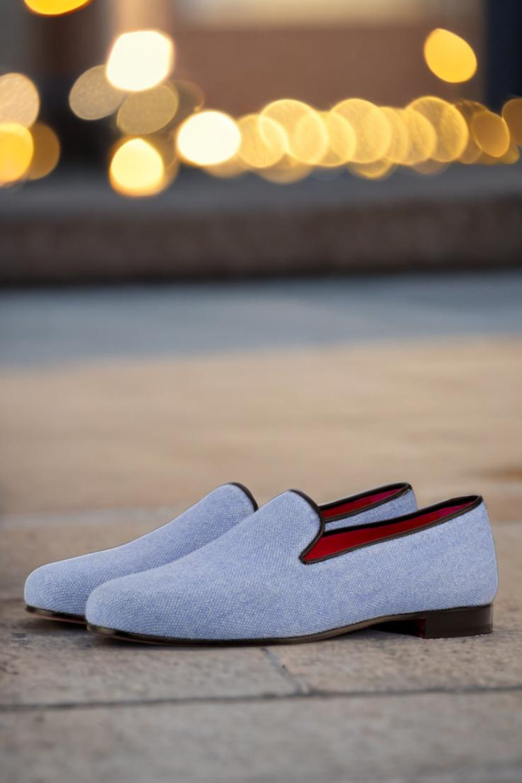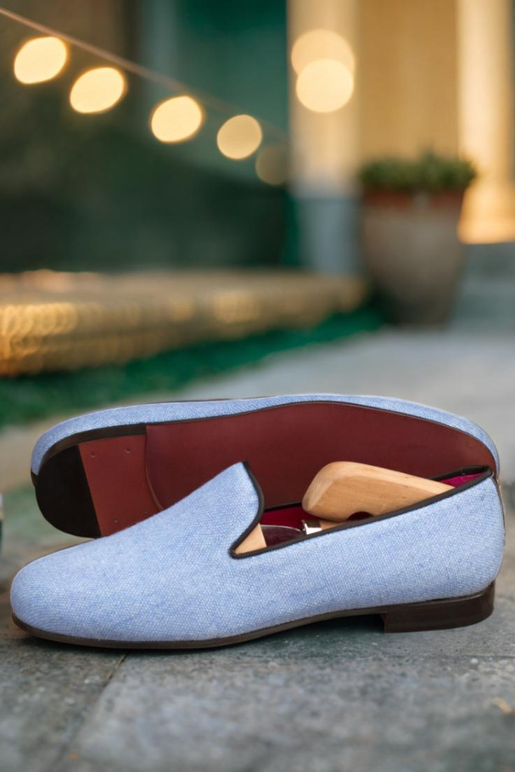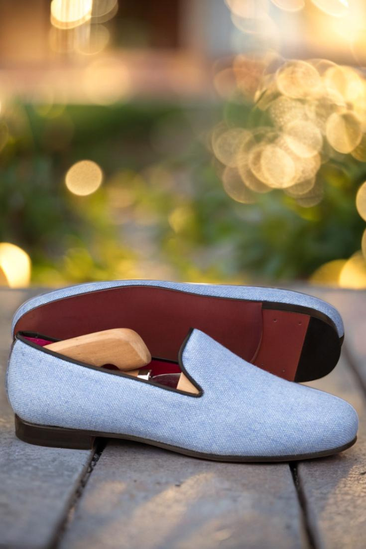 The uppers are crafted from a striking blue linen, giving these slippers a sophisticated yet understated appeal. Paired with black painted calf trim, these slippers exude elegance and quality.