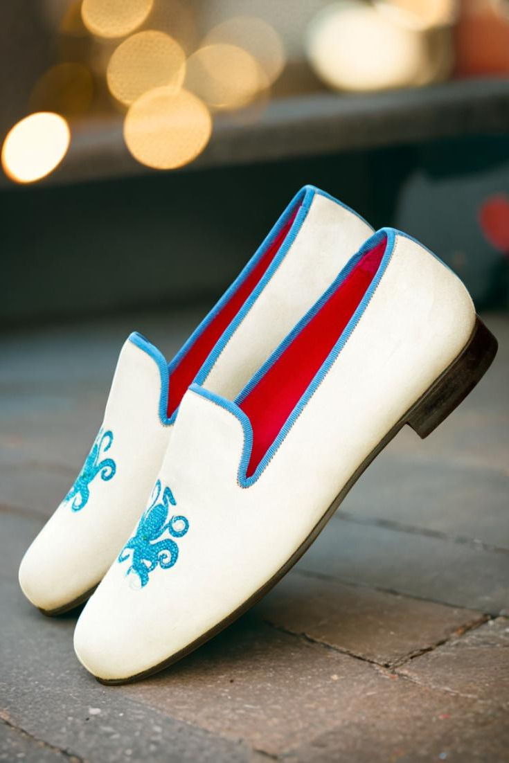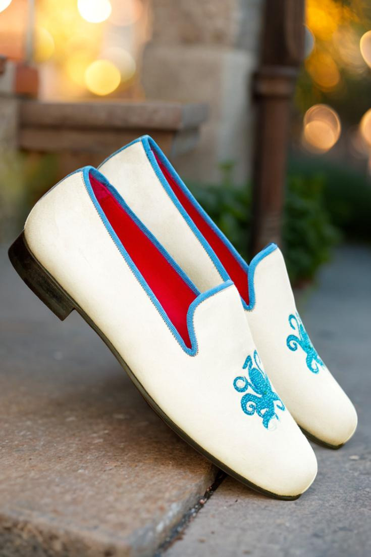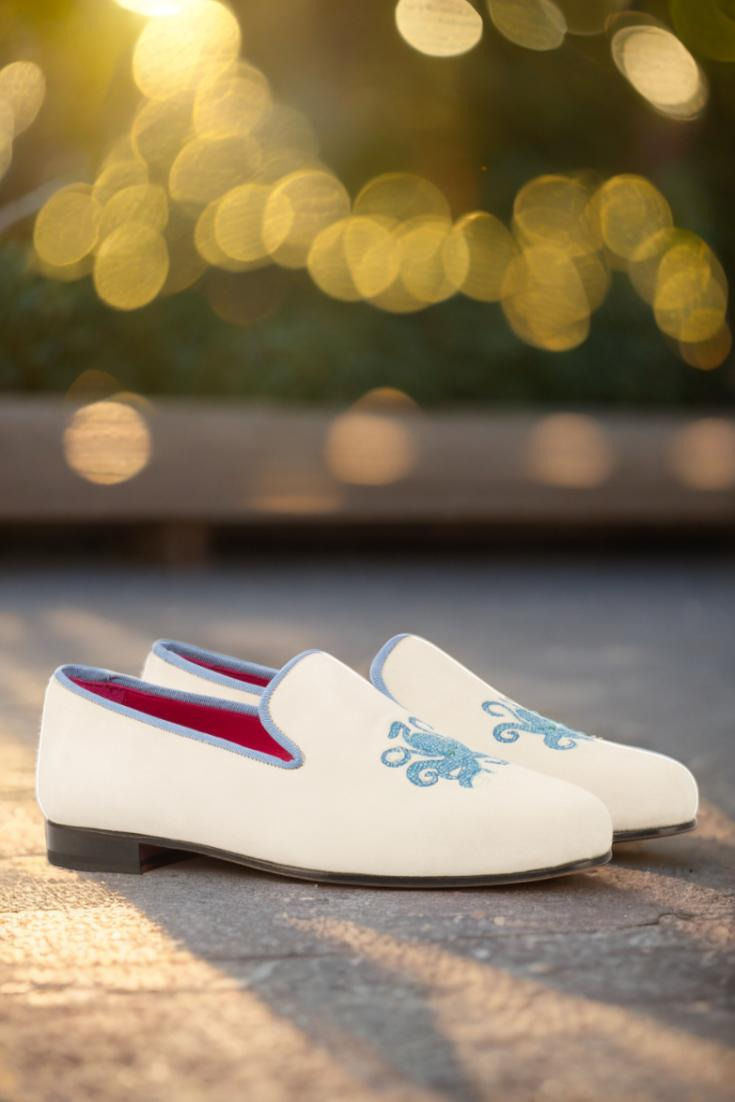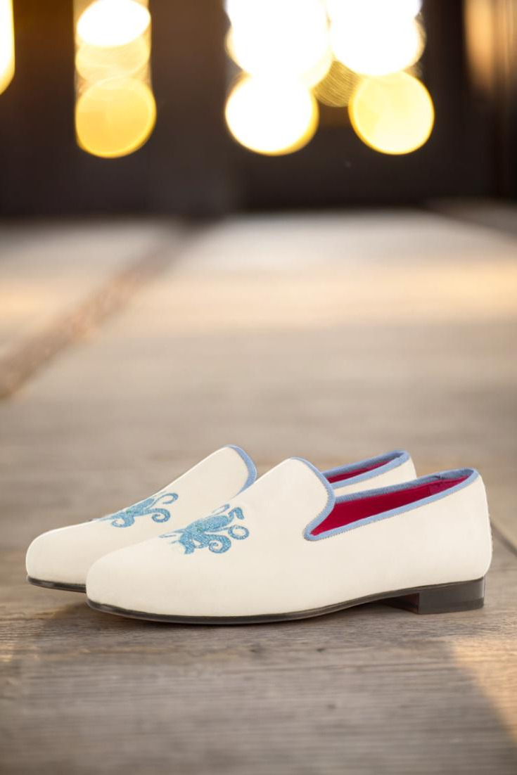 The uppers of the Wellington Slipper are made from luxurious white suede, giving them a timeless and classic look. The trim, in a beautiful medium blue grossgrain, adds just the right amount of contrast and elevates the overall design. But that’s not all – the “Octopussy” blue embroidery on the side adds a playful twist to this formal slipper, making it perfect for any occasion.