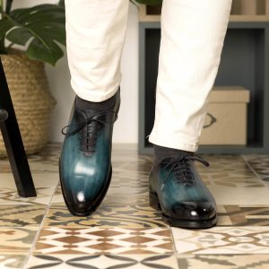 Introducing the ultimate combination of style and craftsmanship – The Wabash Ave. Wholecut Oxford No. 5269EX from Robert August. This shoe is a true work of art, handcrafted with precision and attention to detail. The standout feature of this shoe is its uppers, made from stunning turquoise hand patina leather. The gorgeous swirls and patterns on the leather create a unique and eye-catching design. Completing the look are the round black laces, adding a touch of sleekness to the overall design.