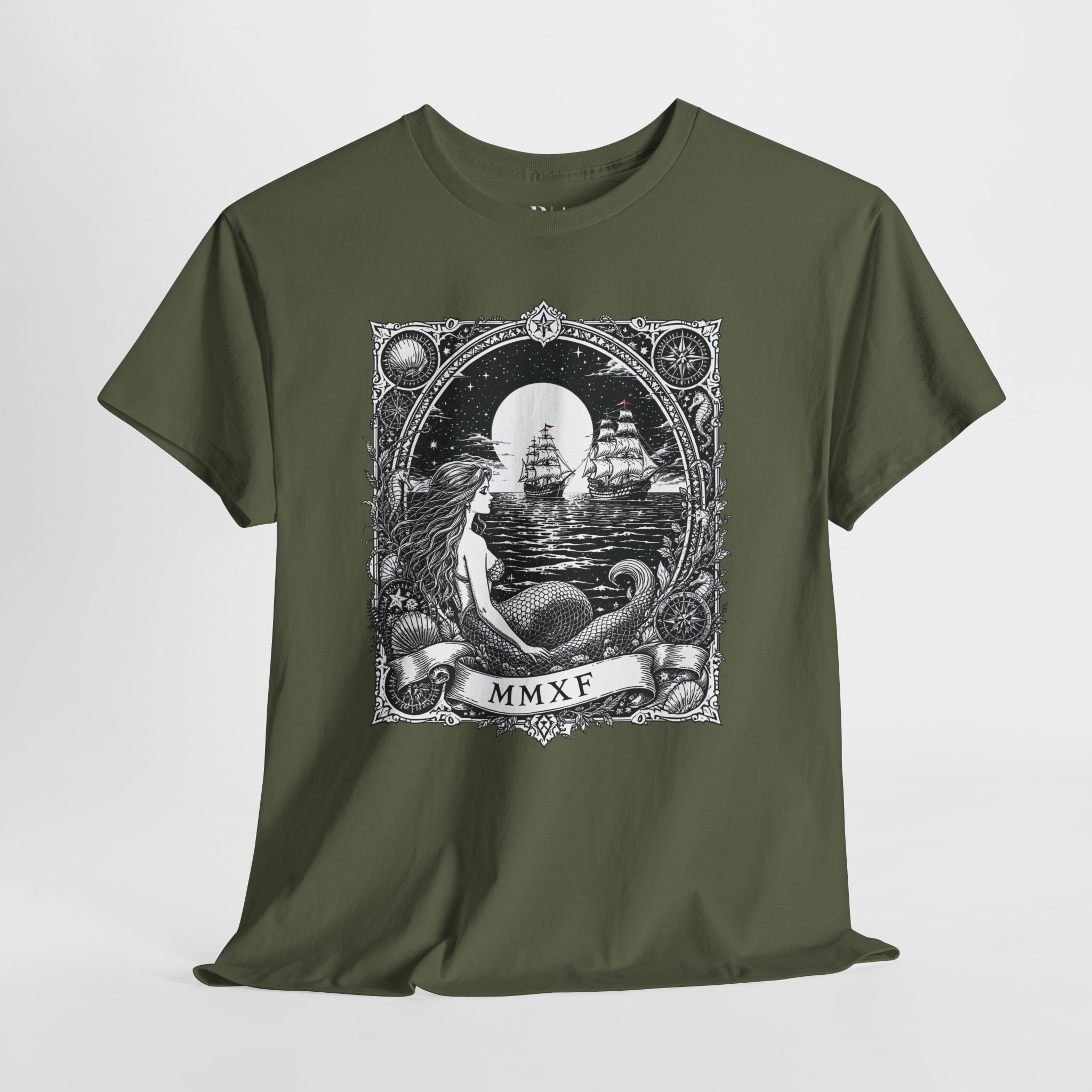 Midnight Mirage: The Mermaid’s Watch captures that exact moment when the tide pauses, the moon hangs low, and something impossibly beautiful is waiting just offshore. This 100% cotton tee frames a lone mermaid watching tall ships cut across a starlit sea, surrounded by ornate nautical details and a banner of cryptic roman numerals. Equal parts sea legend and vintage tattoo flash, it’s made for night swimmers, daydream pirates, and anyone who’s ever felt the pull of the horizon.