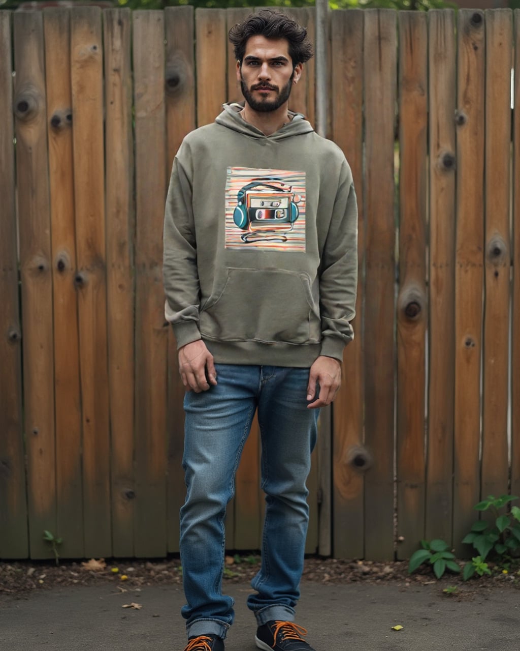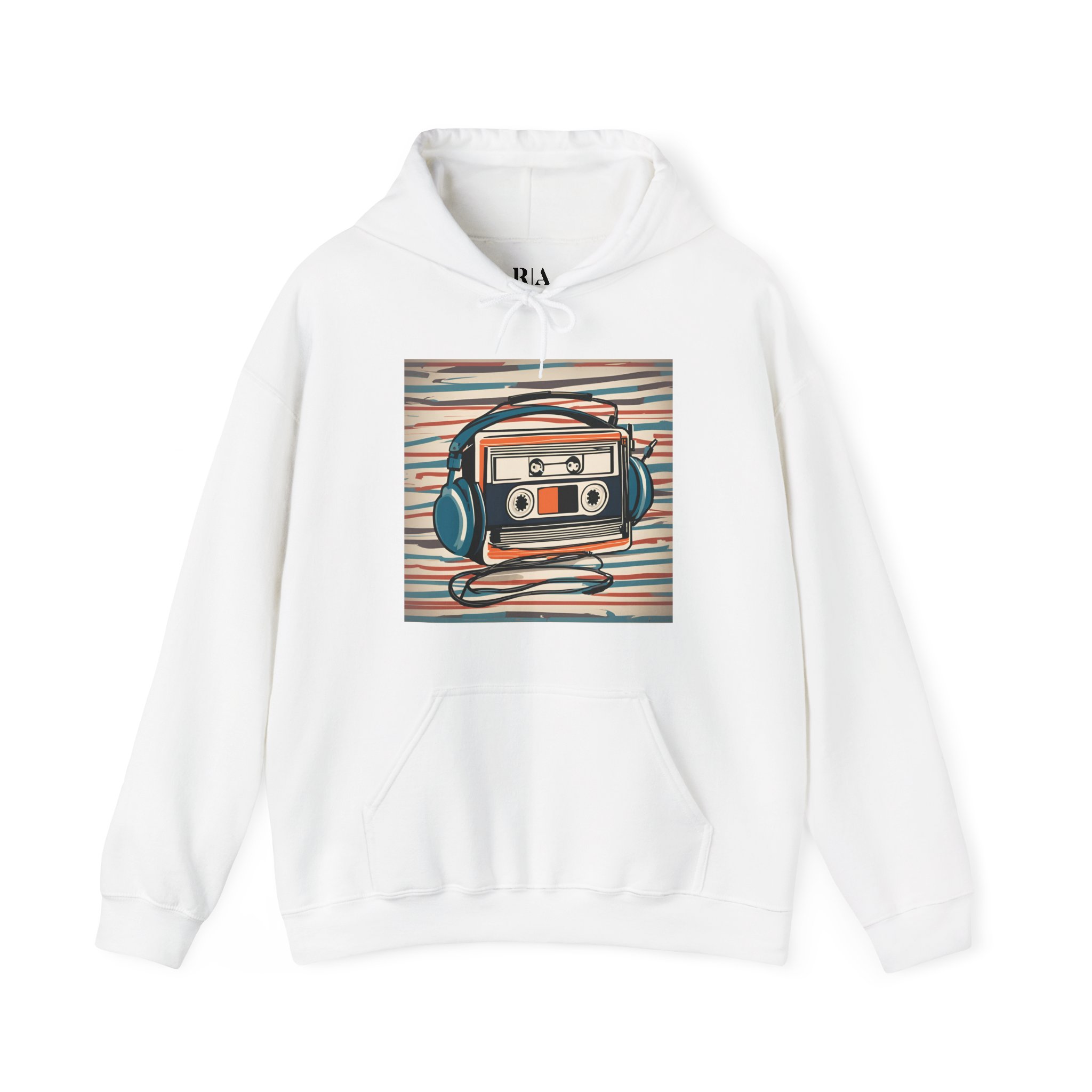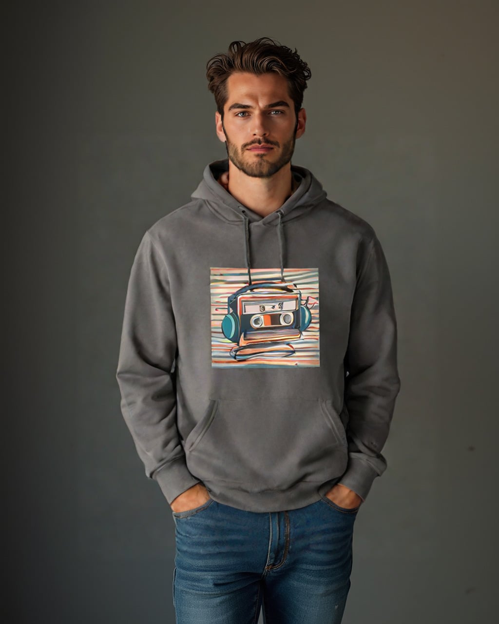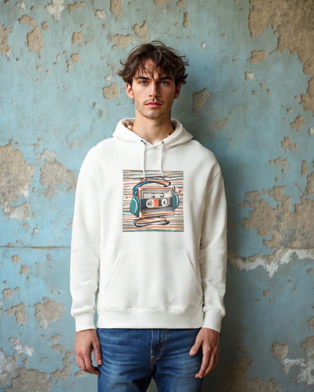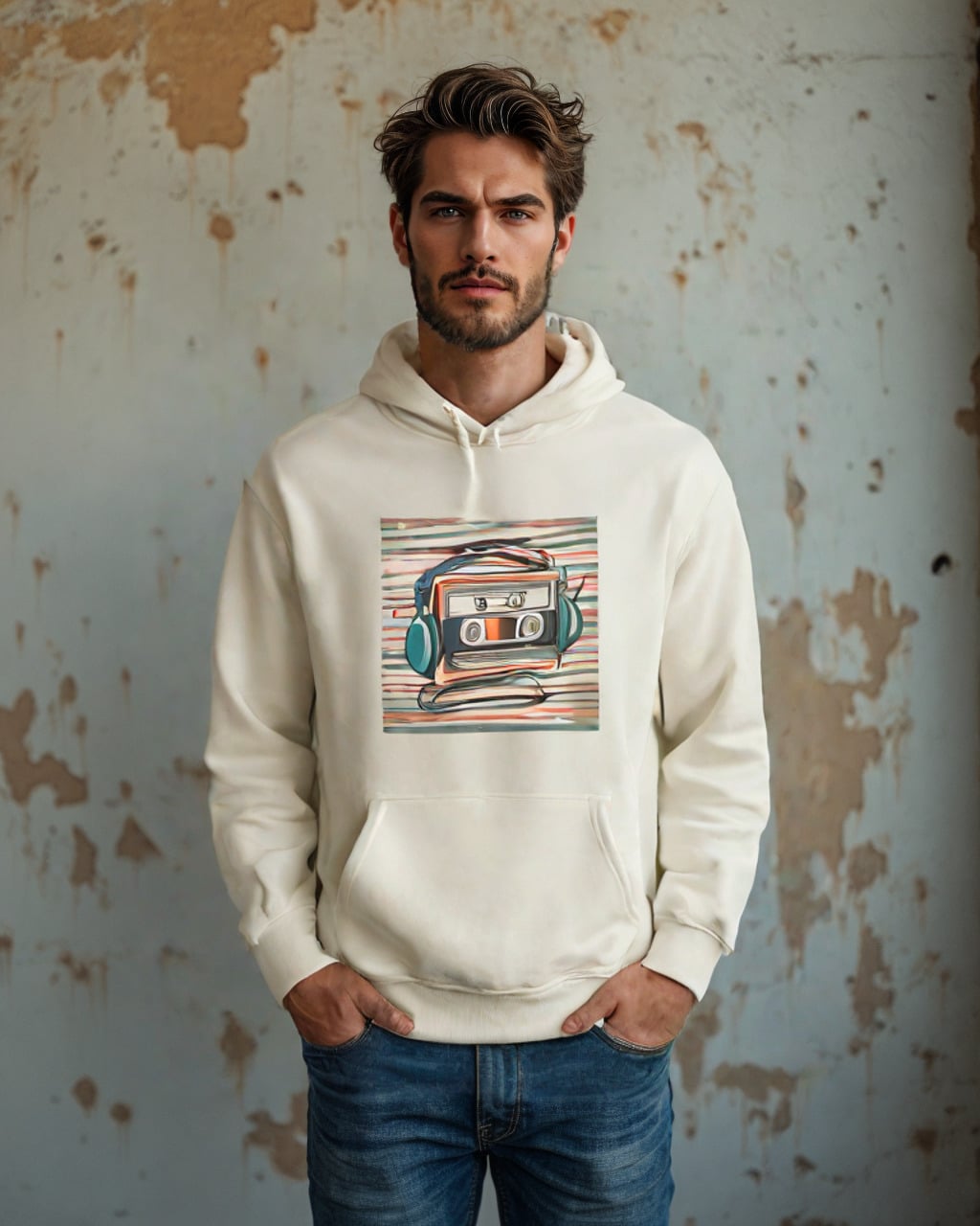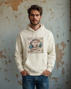 This retro-inspired hoodie brings a blast from the past with its eye-catching design! A vintage cassette tape and teal headphones steal the spotlight, set against bold coral and blue stripes. The vibrant color palette gives nostalgic audio tech a fresh, modern twist, making it the perfect piece for music lovers who want to wear their love for the classics with style.