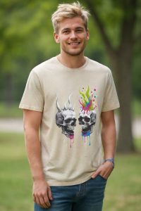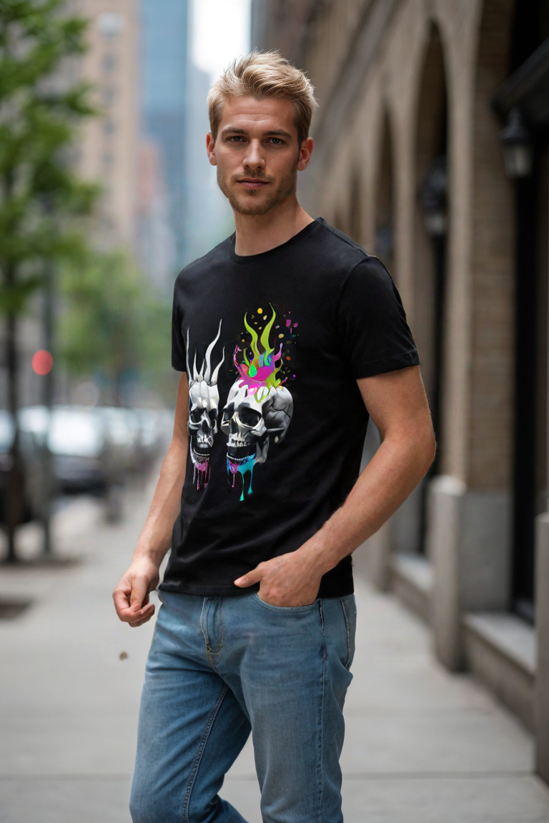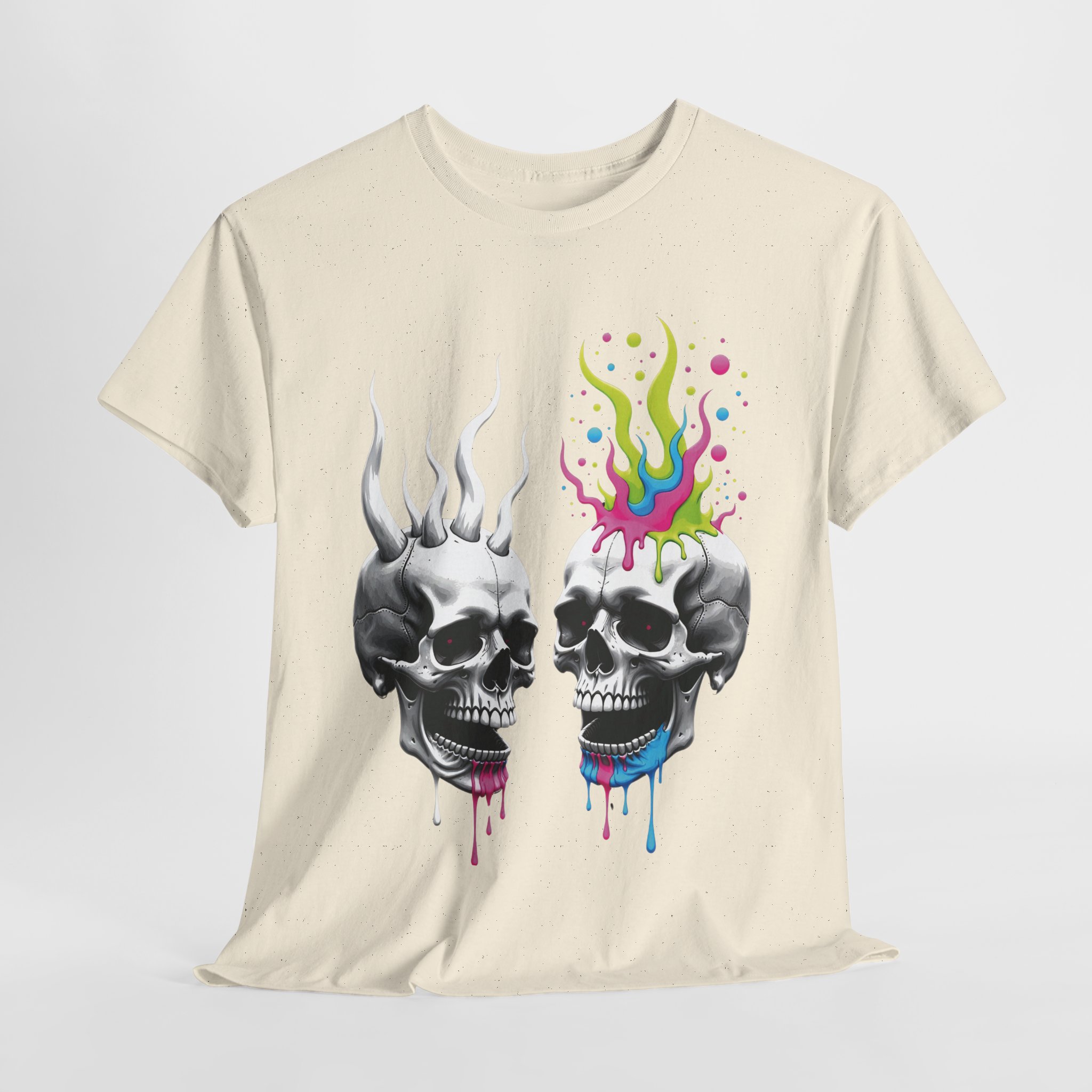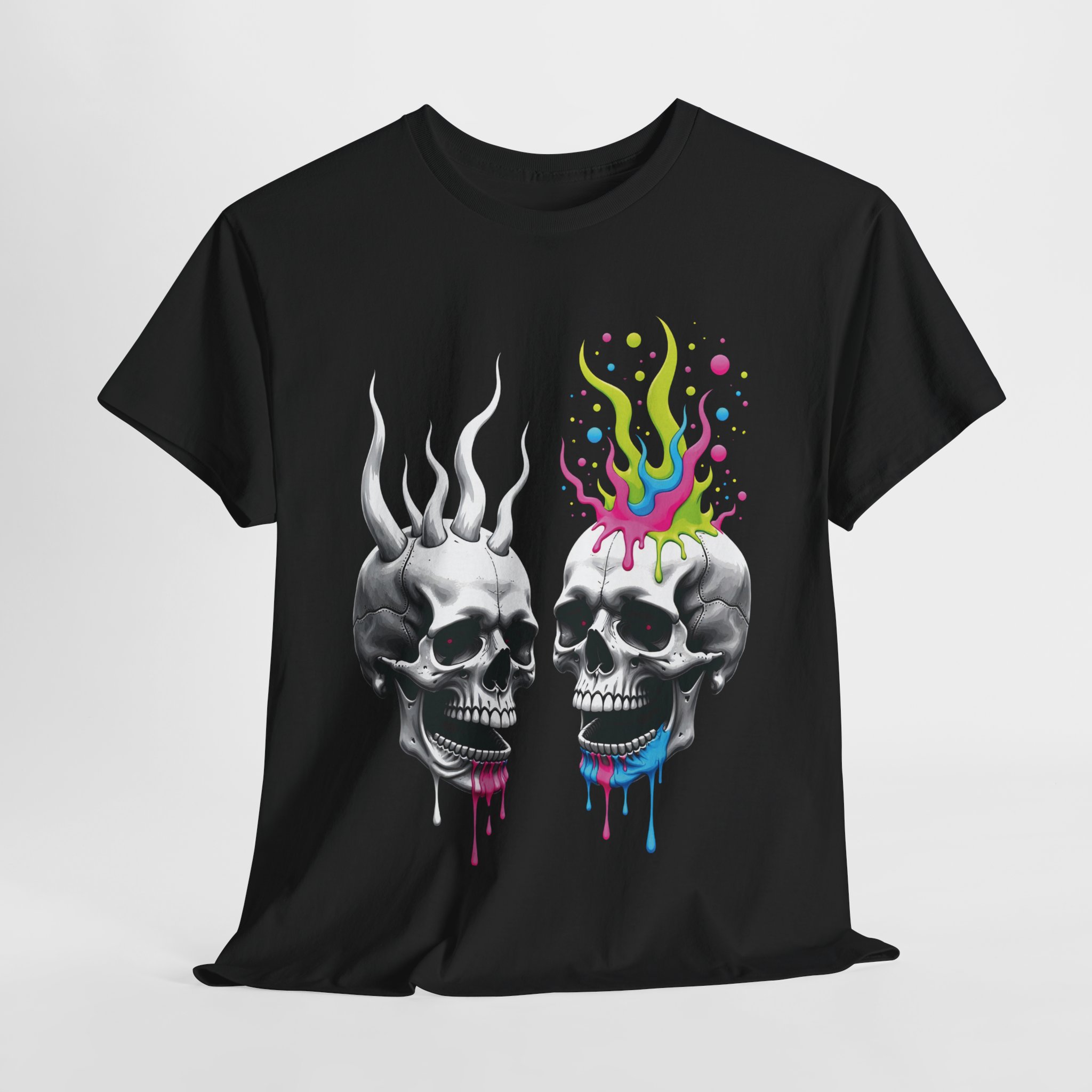 Embrace bold contrasts with the Neon Mortality t-shirt. Featuring two intricately detailed skulls, one adorned with fiery horns and the other bursting with vibrant neon splashes, this design symbolizes the fusion of life, death, and creativity. The dripping accents add a dynamic, edgy touch. Printed on soft, high-quality fabric and available in multiple colors, this shirt is perfect for those who love striking, artistic fashion.