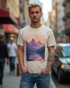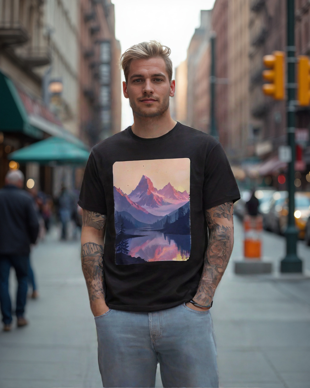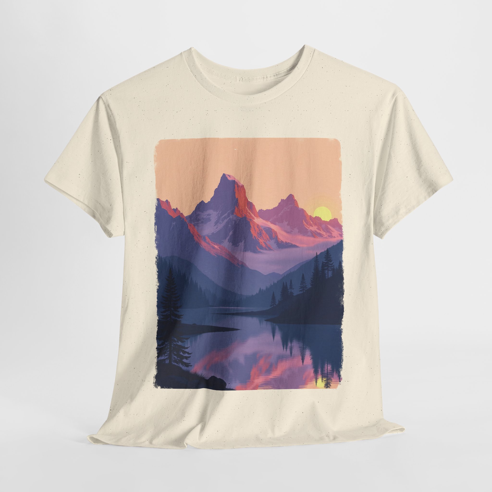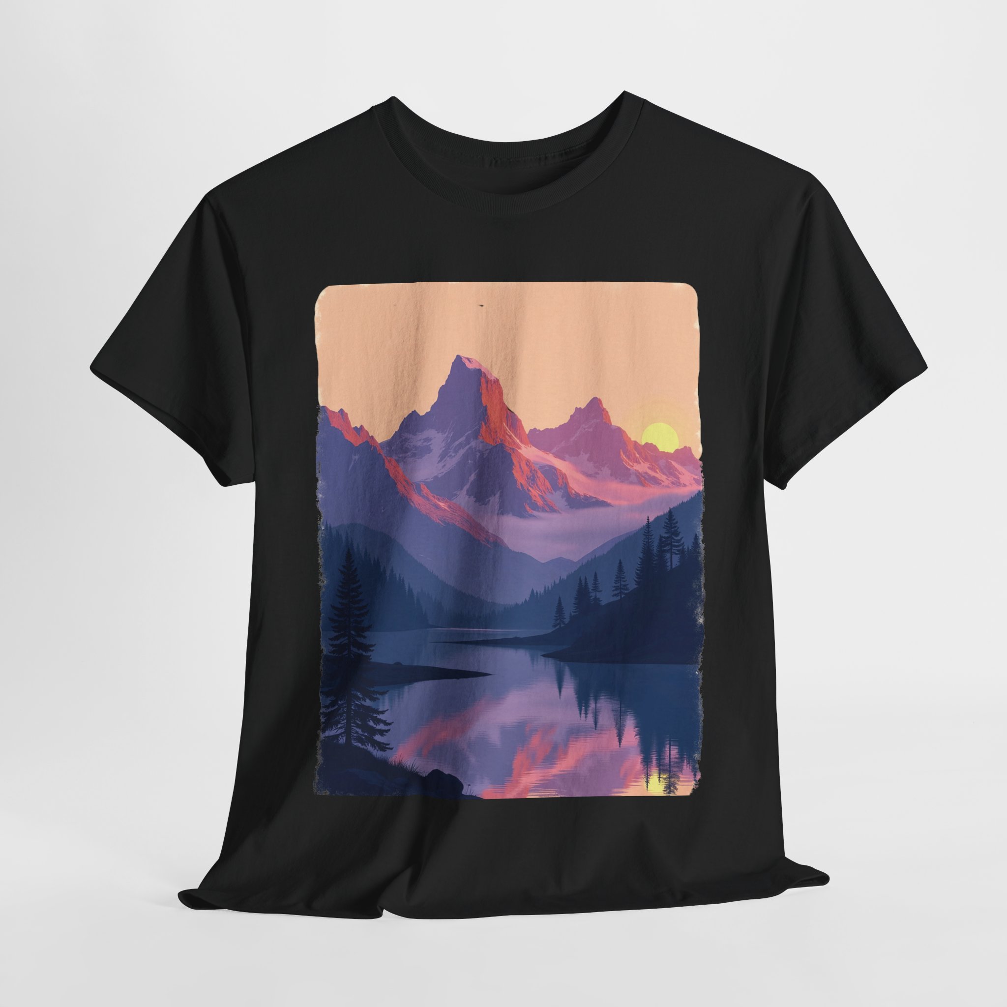 Capture the tranquility of nature with the Serenity’s Reflection t-shirt, featuring a stunning mountain landscape bathed in soft sunset hues. The design showcases majestic peaks, serene waters, and towering trees, creating a peaceful scene that inspires wanderlust. Crafted from premium, breathable fabric, this tee is available in multiple colors to suit your style. Perfect for adventurers and dreamers alike, it combines comfort with artistic beauty for everyday wear.