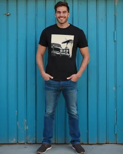 Cruise into vintage style with our “Shadow Cruiser” Graphic Tee. This striking black t-shirt features an artistically rendered classic car design with a mysterious dripping umbrella silhouette, creating an atmosphere of film noir elegance