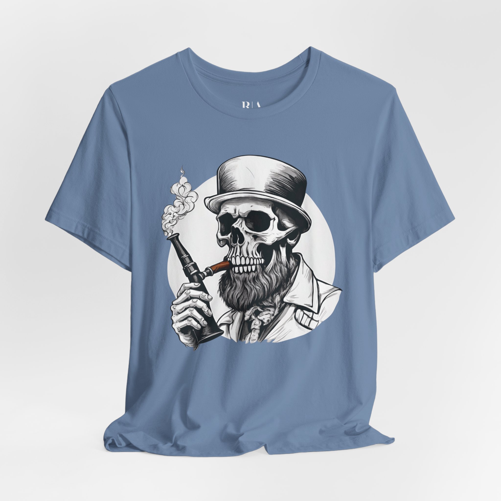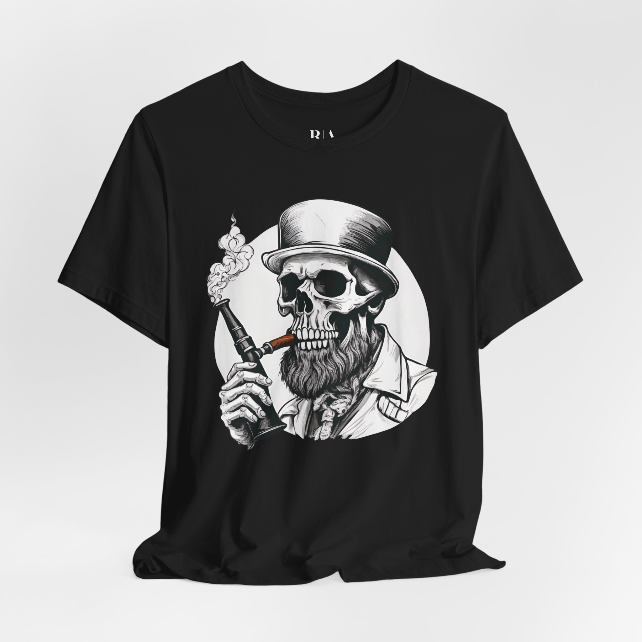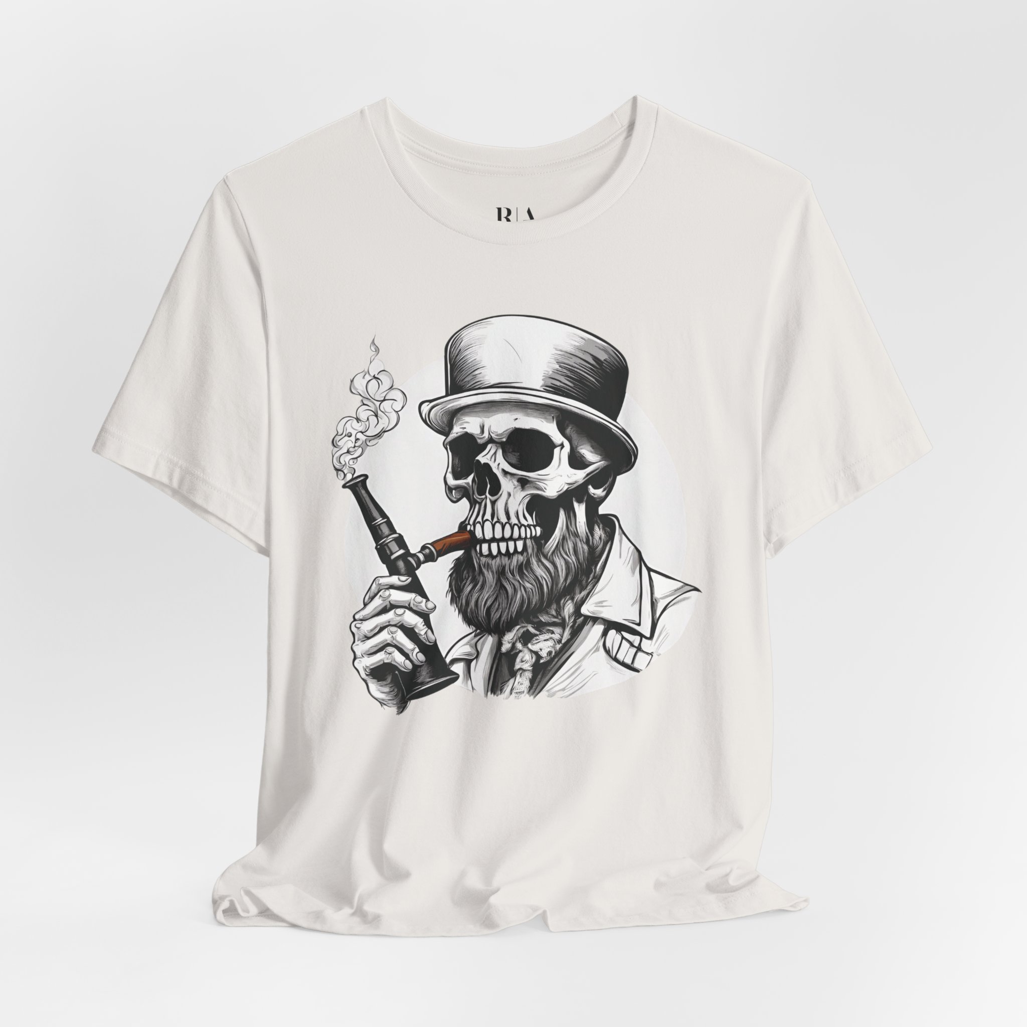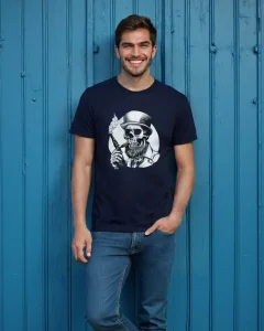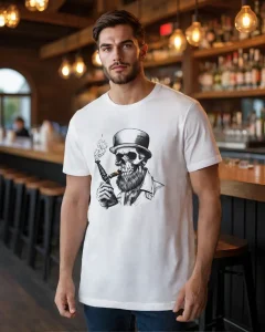 Meet “Smokin’ Bones” – where Victorian sophistication meets skeletal rebellion. This eye-catching tee features a dapper skull sporting a distinguished top hat and a perfectly groomed beard, taking a sophisticated puff from his vintage pipe. Whether you’re a gentleman of leisure or just dead serious about style, this shirt brings a haunting elegance to your wardrobe.