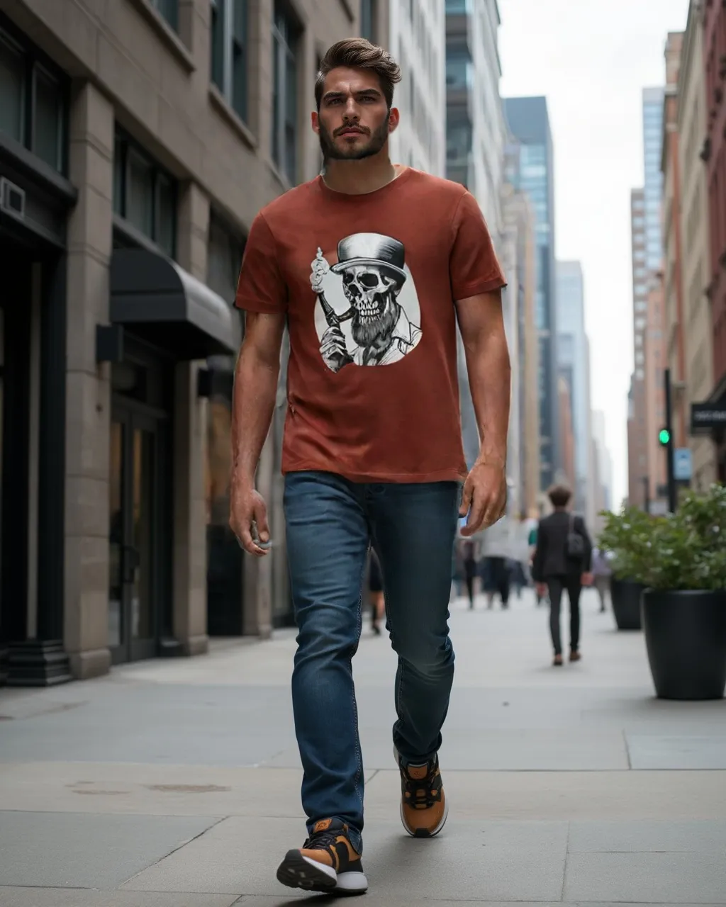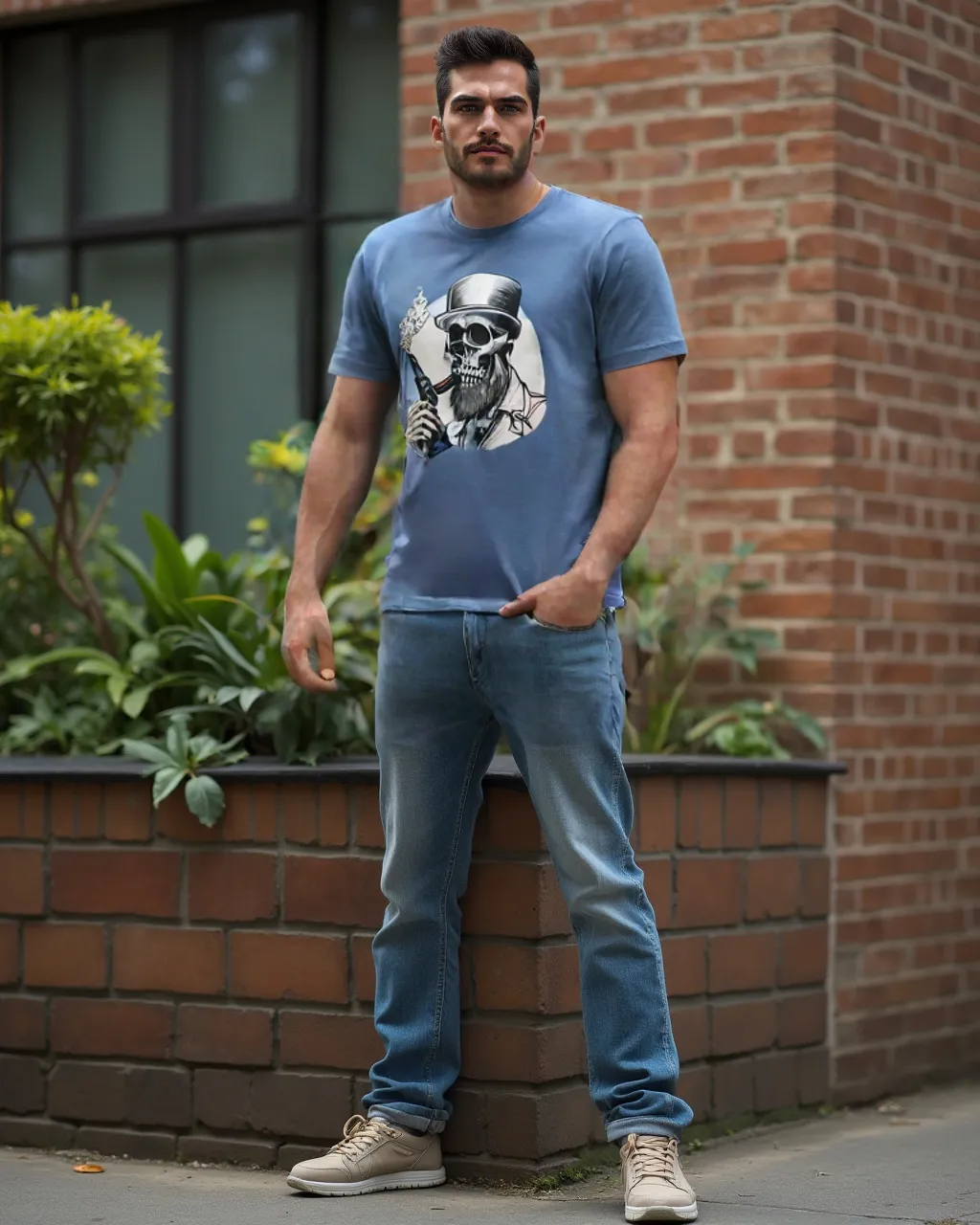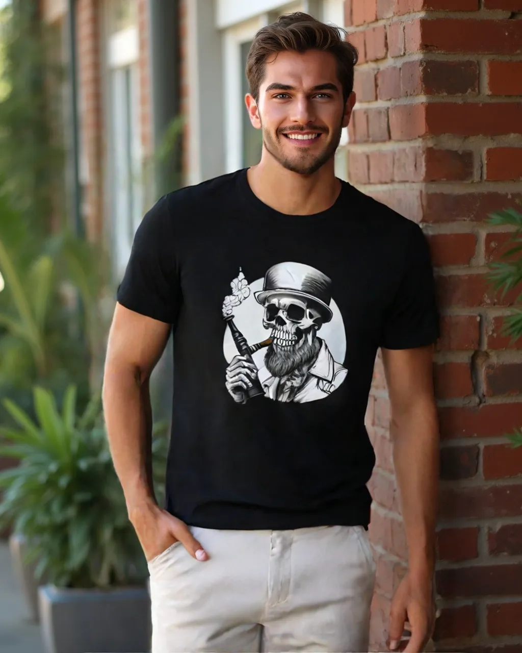 Meet “Smokin’ Bones” – where Victorian sophistication meets skeletal rebellion. This eye-catching tee features a dapper skull sporting a distinguished top hat and a perfectly groomed beard, taking a sophisticated puff from his vintage pipe. Whether you’re a gentleman of leisure or just dead serious about style, this shirt brings a haunting elegance to your wardrobe.