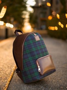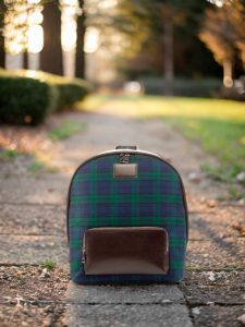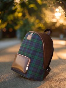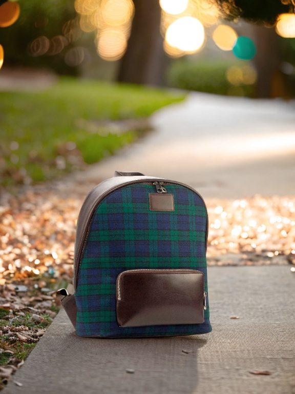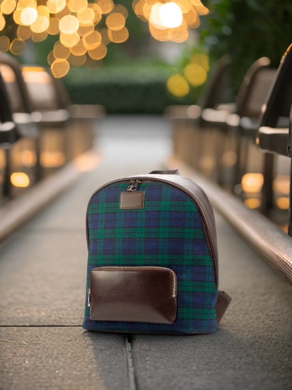 The base of this backpack is made with luxurious Blackwatch Wool, known for its durability and classic appeal. The upper base, shoulder strap, handle, pocket, and hardware are all crafted from Dark Brown Painted Calf leather, adding a touch of sophistication to the overall design. The hardware is finished in Nickel, adding a sleek and modern touch.