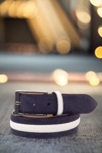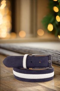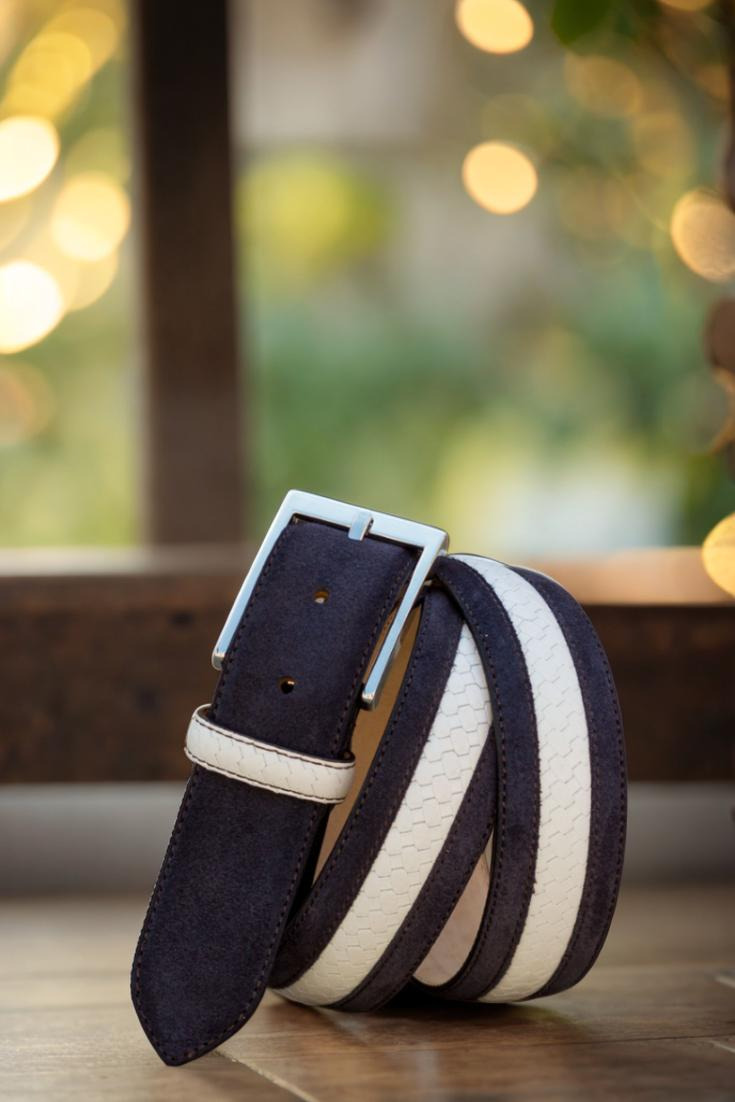 But the beauty of this belt doesn’t stop there. The quarter, belt loop, and back loop all boast the same navy blue luxe suede and white braided box calf combination, creating a cohesive and stylish look from every angle. The light brown stitching adds a subtle touch of contrast, adding to the overall charm of the belt.