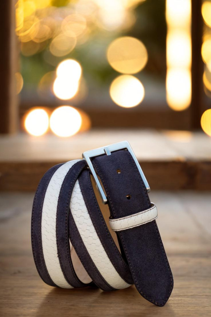 Featuring a sleek and modern design, The Delaware Place Belt No. 3426 is the perfect addition to any outfit. The front is made with luxurious navy blue luxe suede, while the center boasts a striking white braided box calf. The combination of these two materials adds texture and depth to the belt, making it a truly unique piece.
