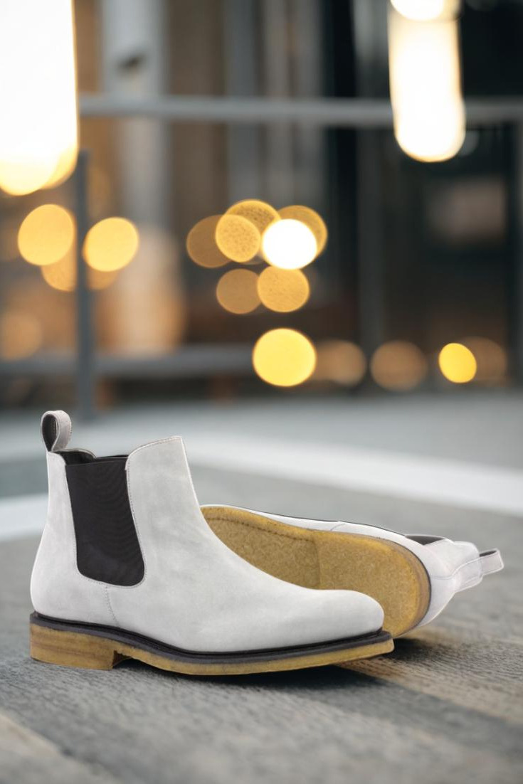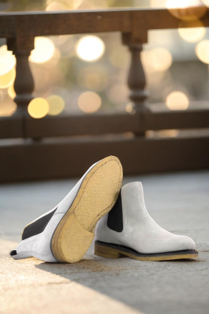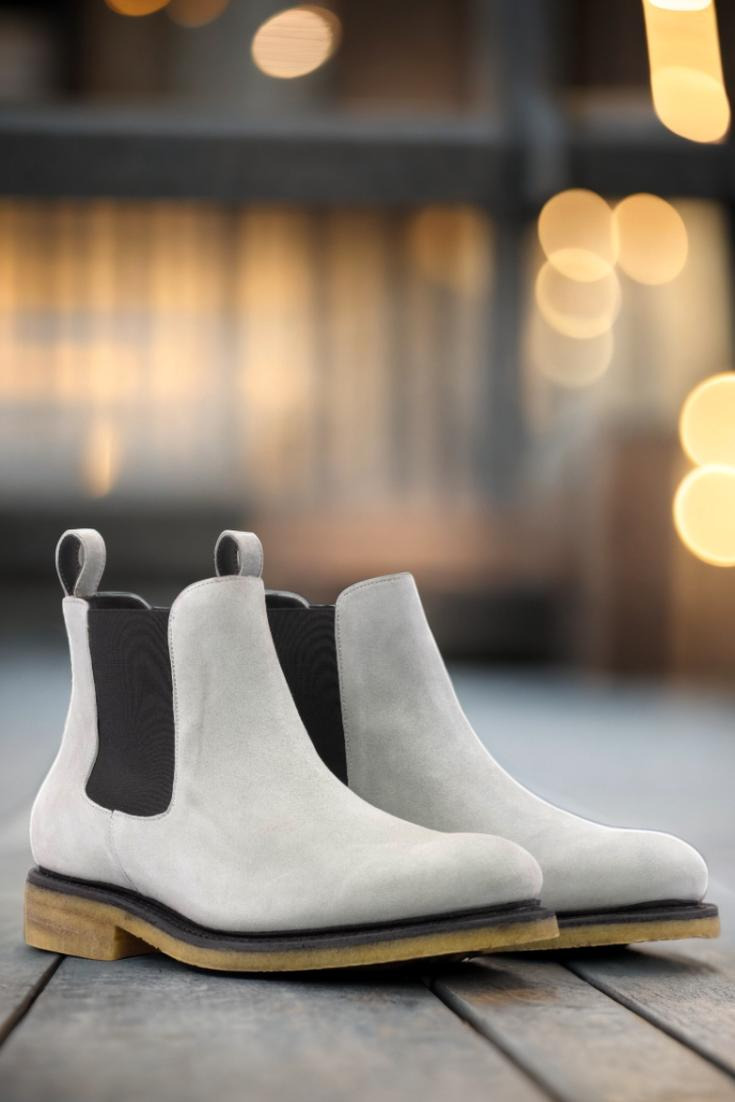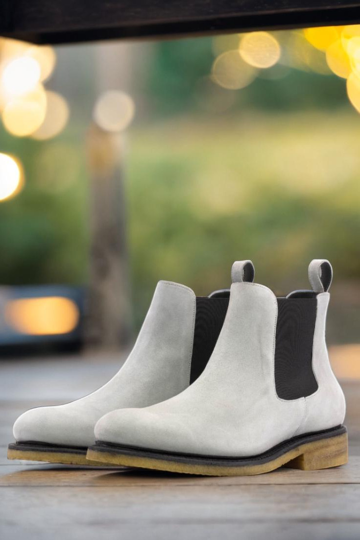 Crafted with impeccable attention to detail, the Fulton St. Chelsea Boot features a sleek and sophisticated design. The light grey kid suede covers the entire front, sides, and back strip of the boot, giving it a sleek and seamless look. The elastic, in classic black, adds a touch of edginess to the overall design.