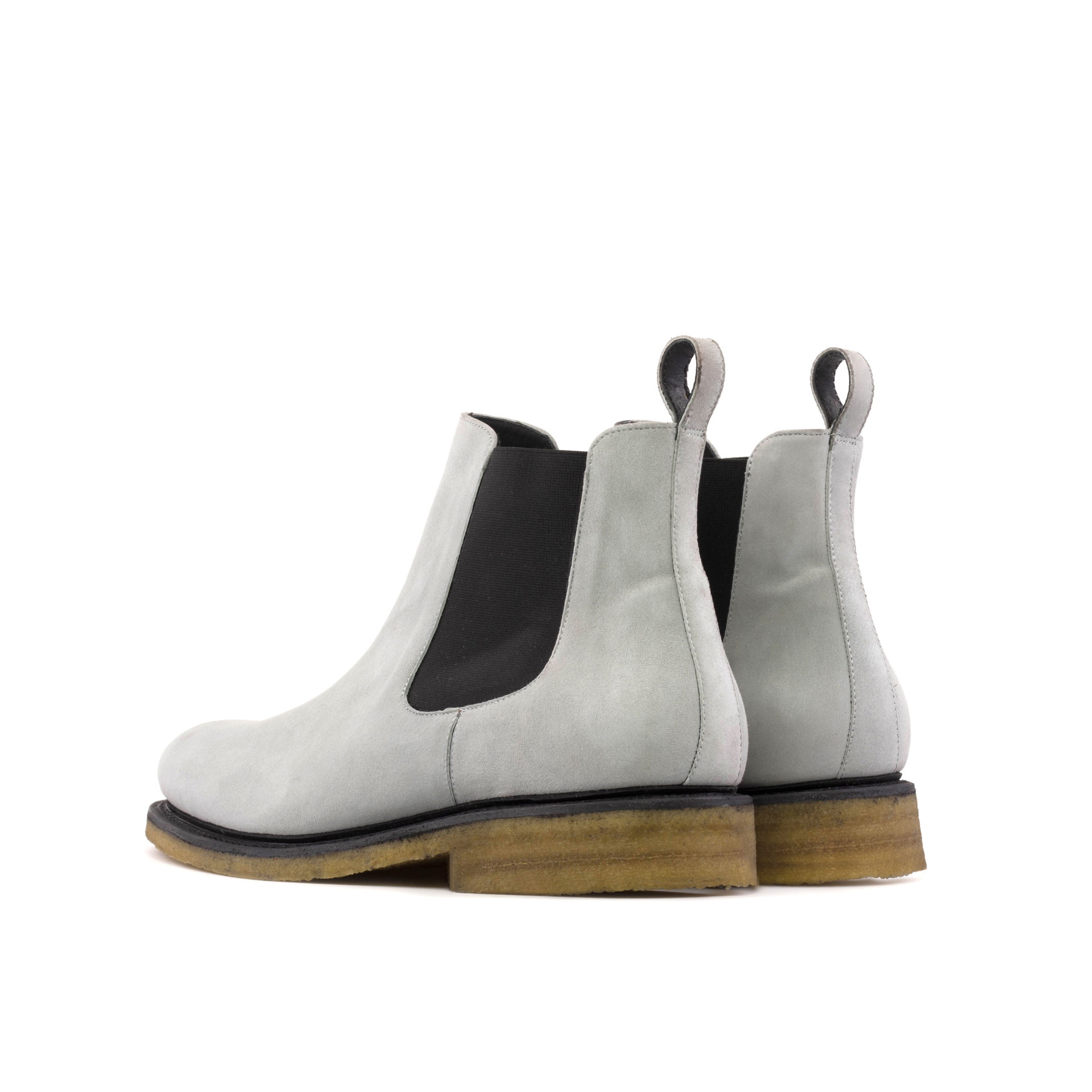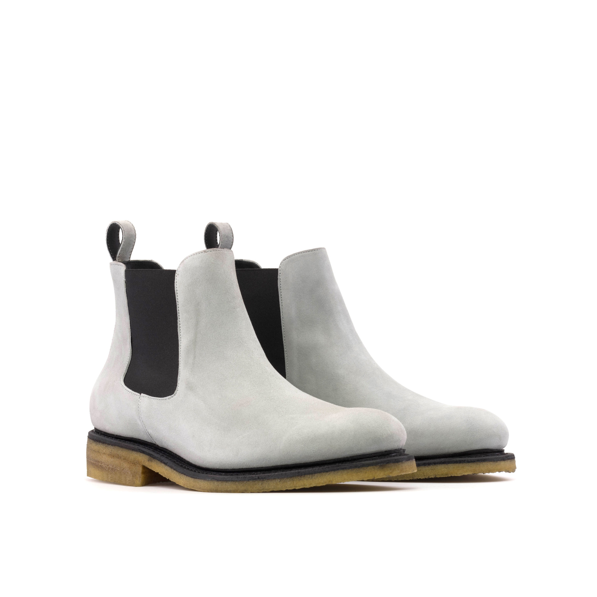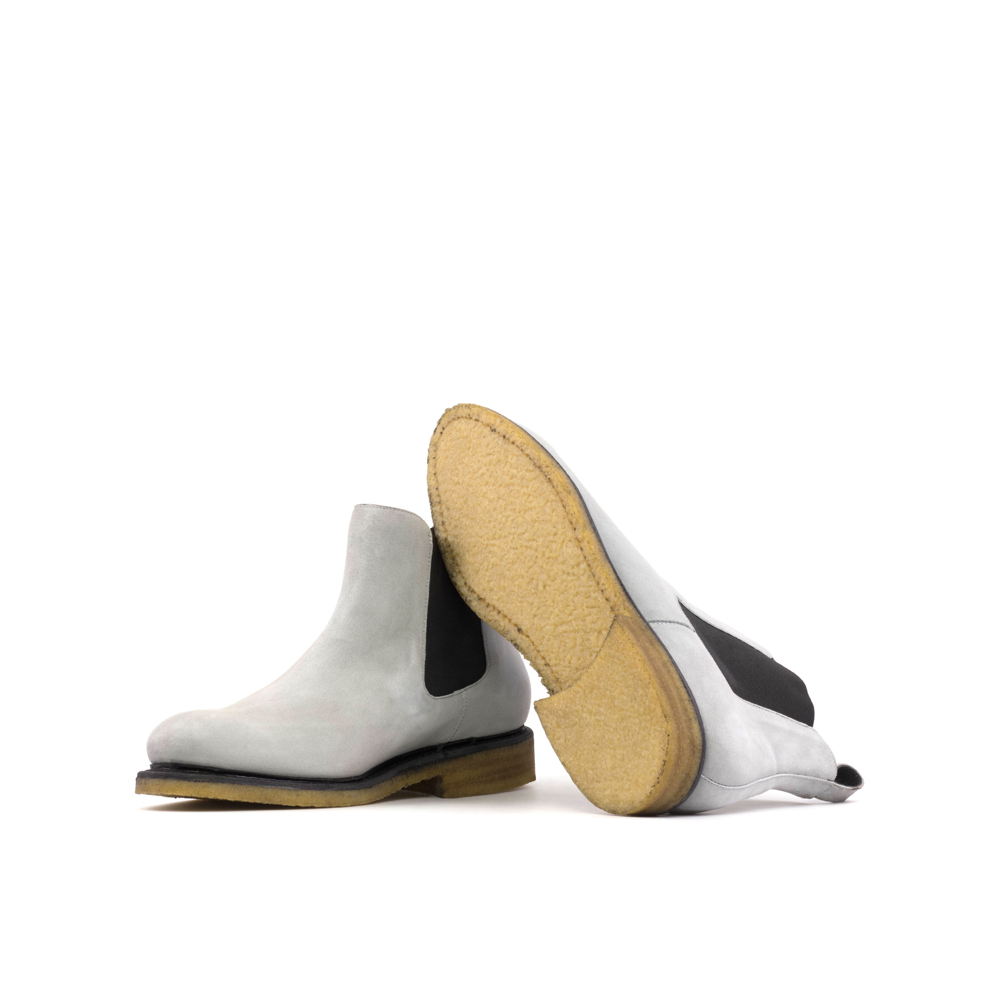 Crafted with impeccable attention to detail, the Fulton St. Chelsea Boot features a sleek and sophisticated design. The light grey kid suede covers the entire front, sides, and back strip of the boot, giving it a sleek and seamless look. The elastic, in classic black, adds a touch of edginess to the overall design.