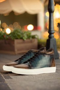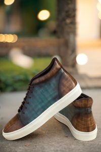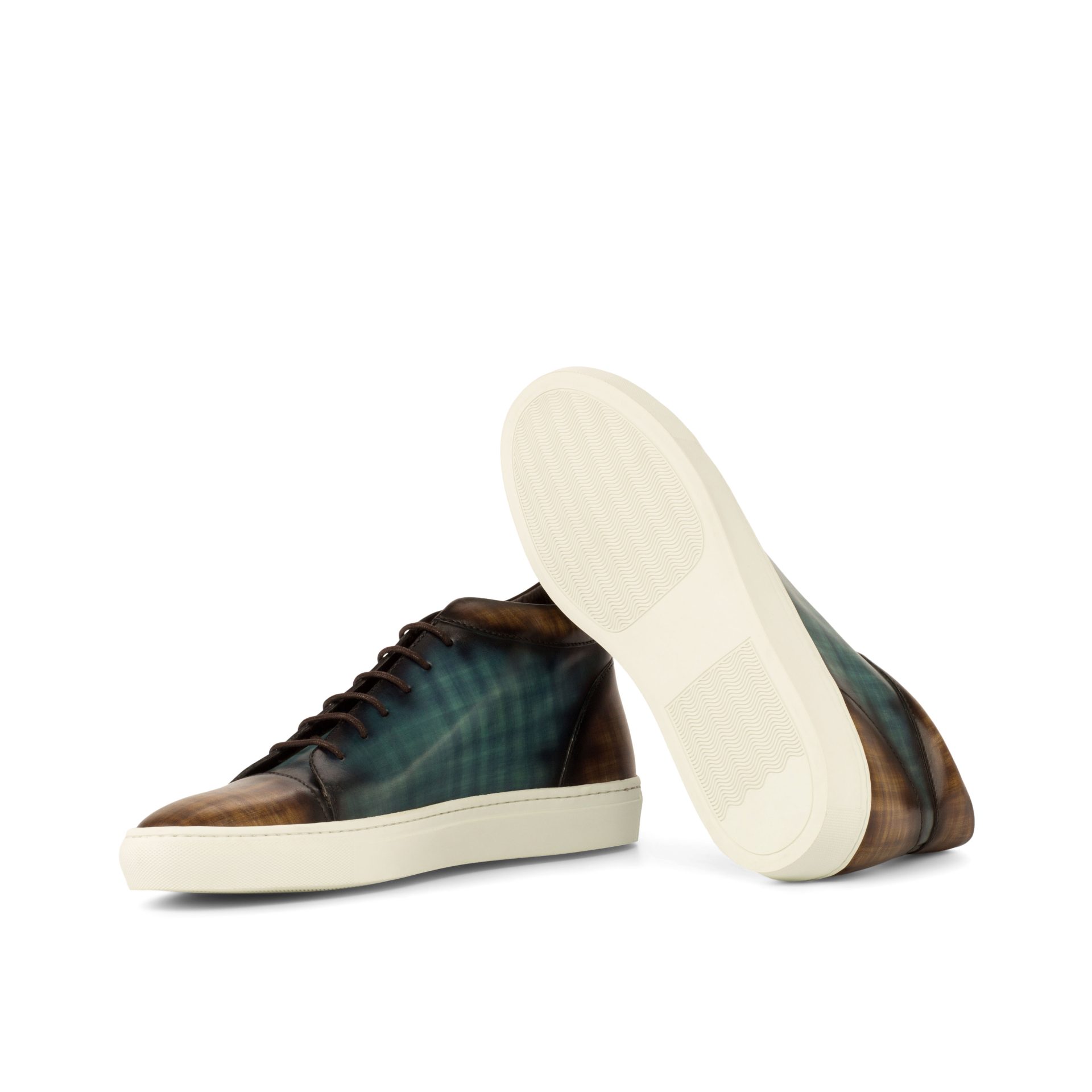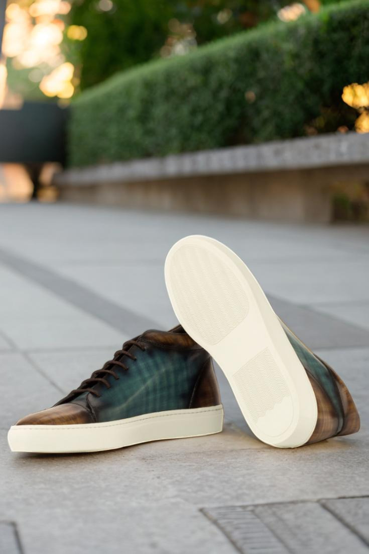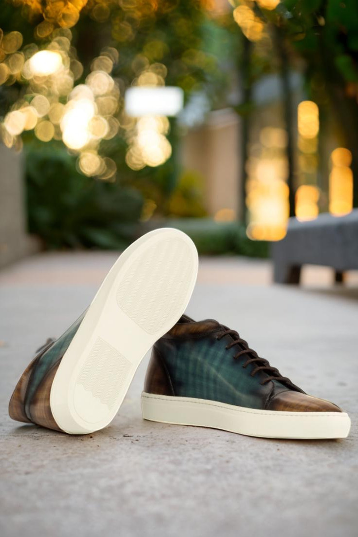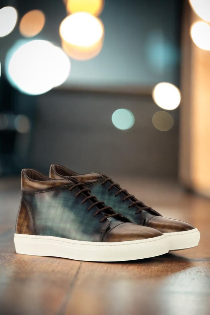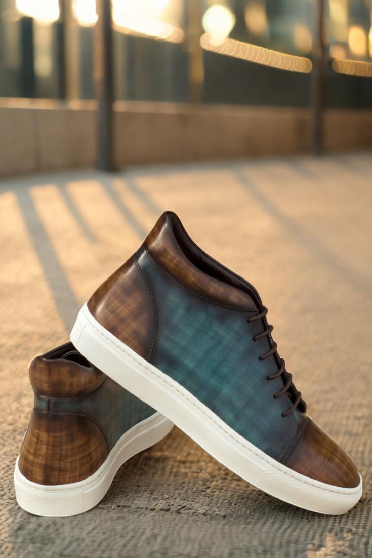 Introducing the Argyle St. High Top Sneaker No. 3882 from Robert August. Crafted with the upmost attention to detail, these sneakers are a true embodiment of style and quality. Made in Spain, the uppers are constructed with luxurious Italian Calf Leather, boasting a stunning brown and turquoise hand patina finish. This unique patina style, known as Papiro, elevates the sneakers to a class of their own.