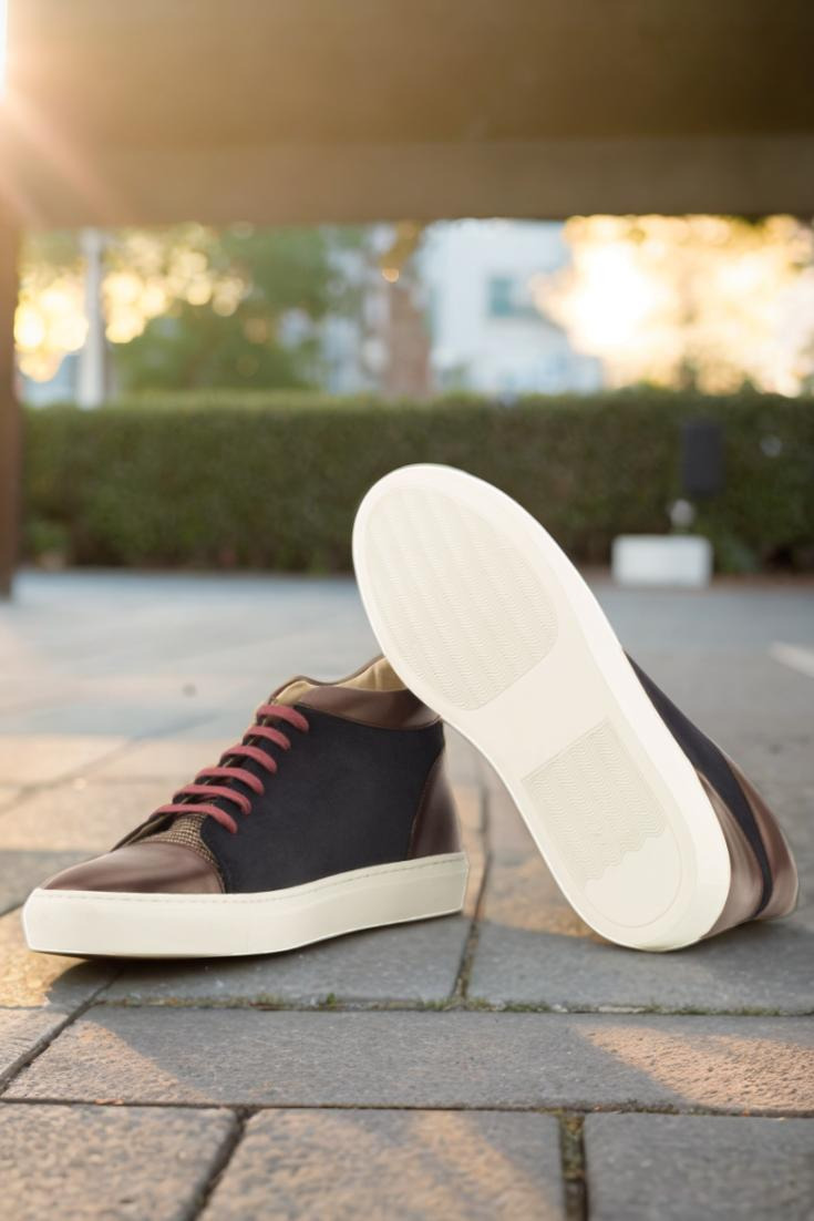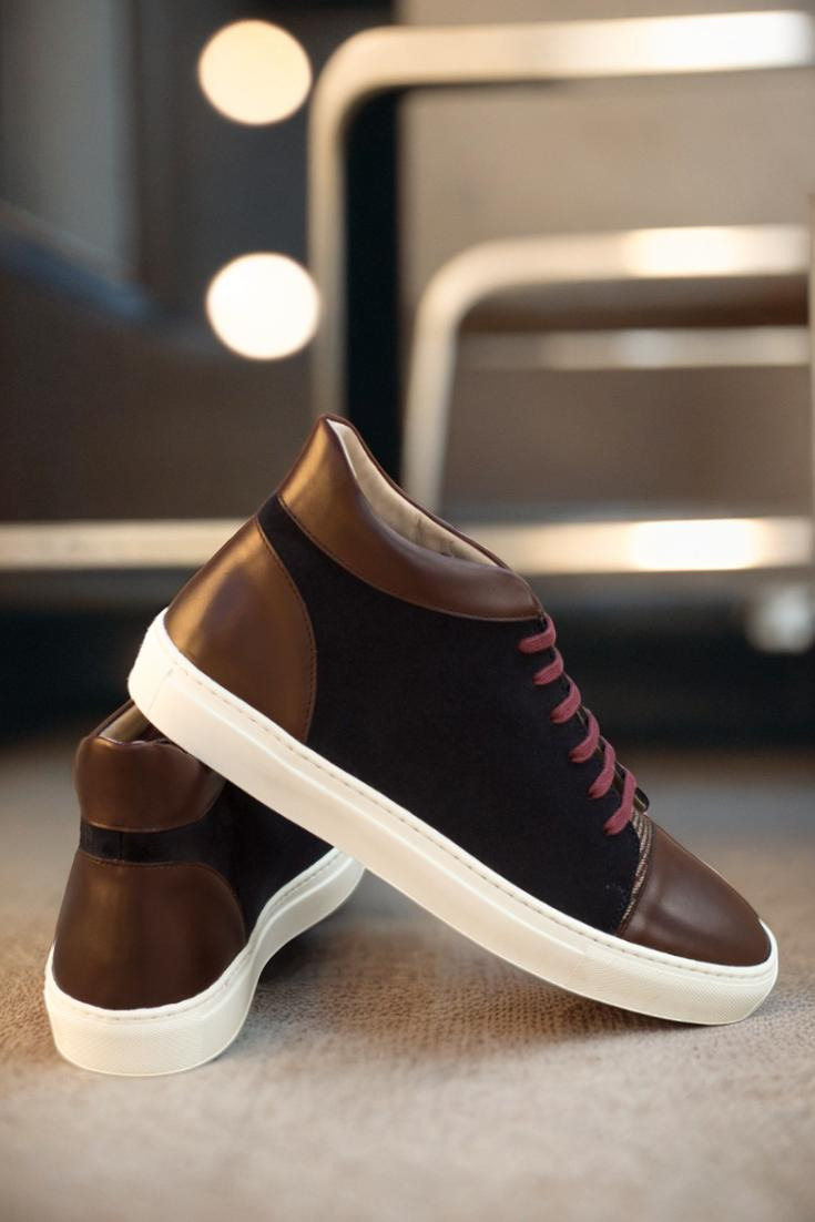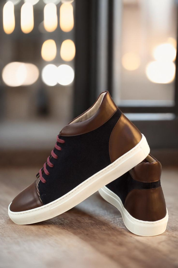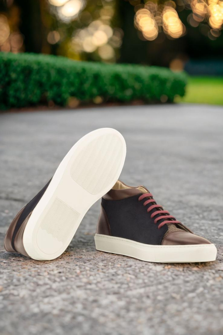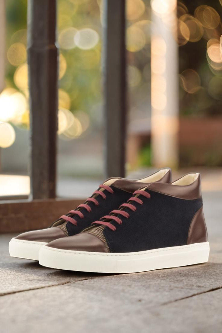 Crafted from the finest materials, these high top sneakers boast a unique blend of navy blue luxe suede and dark brown box calf, giving them a distinct and sophisticated look. This classic color combination is further enhanced by the addition of a subtle tweed detail, adding a touch of texture and depth to the overall design.
