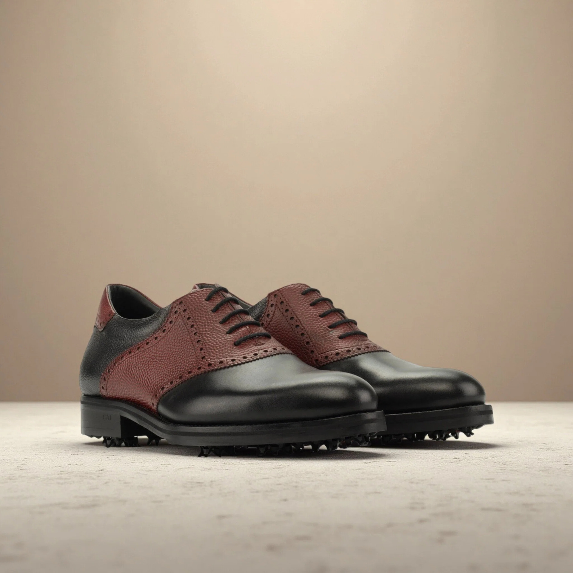 Every material is purposefully selected for maximum durability and visual impact. The front profile features smooth, black luxe calf leather that naturally resists the elements, keeping your feet protected through early morning dew and long afternoon rounds. A striking red pebble grain leather saddle provides a sharp contrast while anchoring the midfoot for lateral stability during your swing. The sides and back utilize robust black and red full-grain leathers, ensuring the shoe maintains its structural integrity and supportive shape season after season.