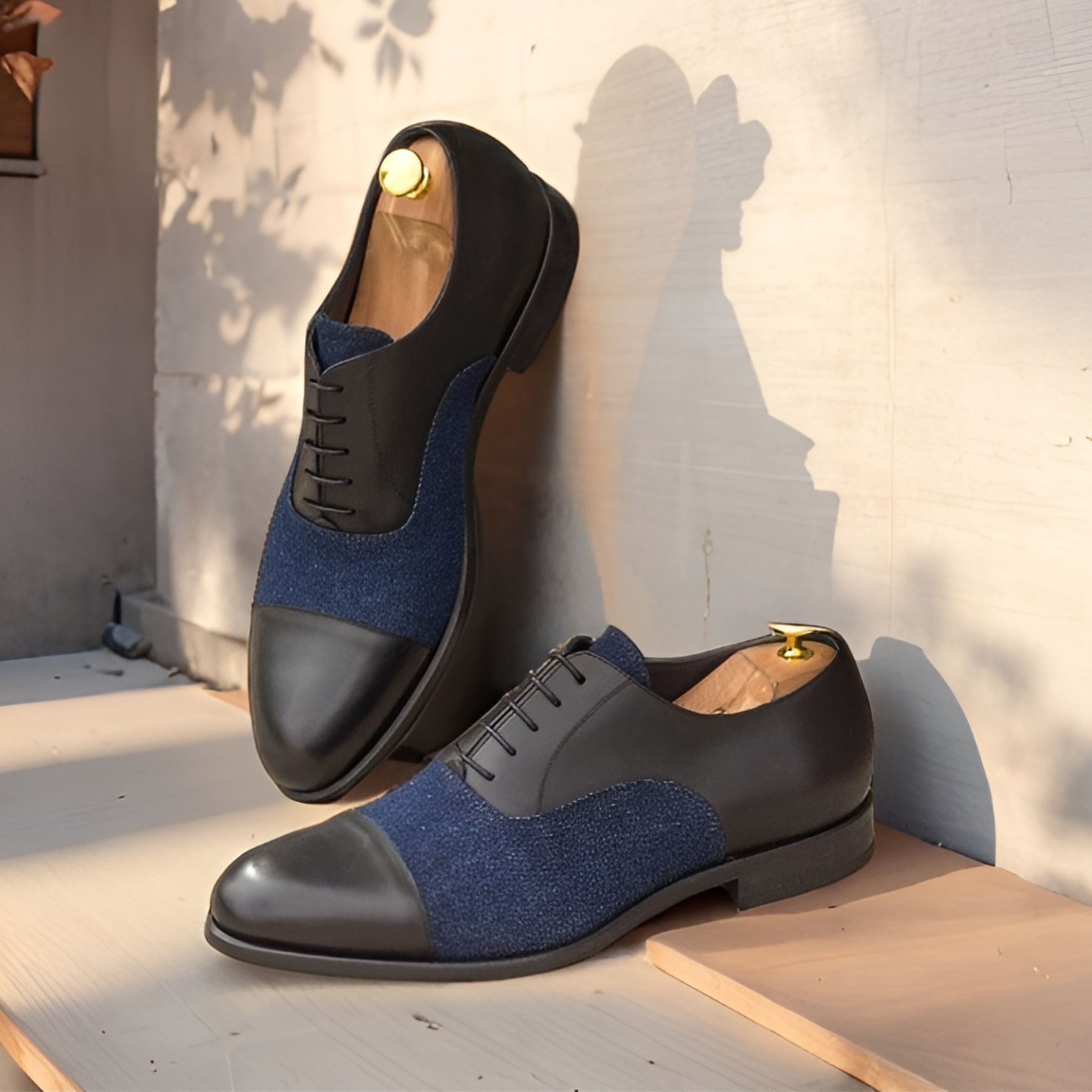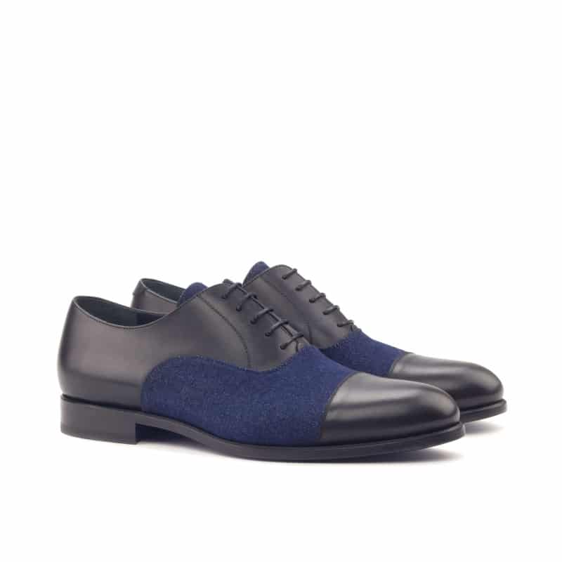 The base in black box calf provides a solid foundation, while the navy blue denim tongue adds a pop of color and character. The round black laces tie everything together seamlessly, completing the look with finesse.