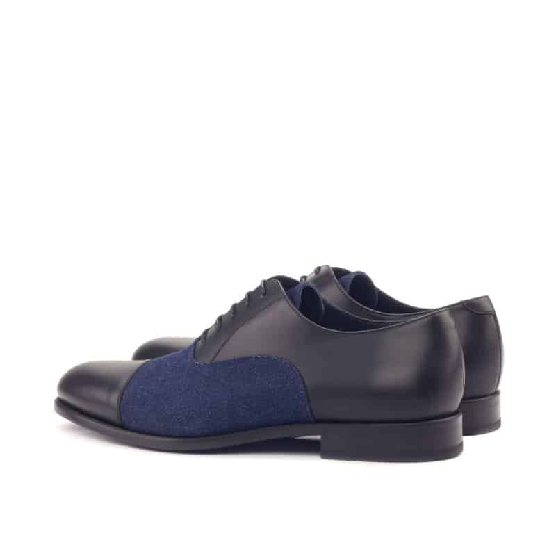 The toe cap in black box calf adds a touch of classic sophistication, while the vamp in navy blue denim brings a modern and stylish twist to the design. The dark brown painted calf vamp tab adds a unique and eye-catching element, setting this shoe apart from the rest.