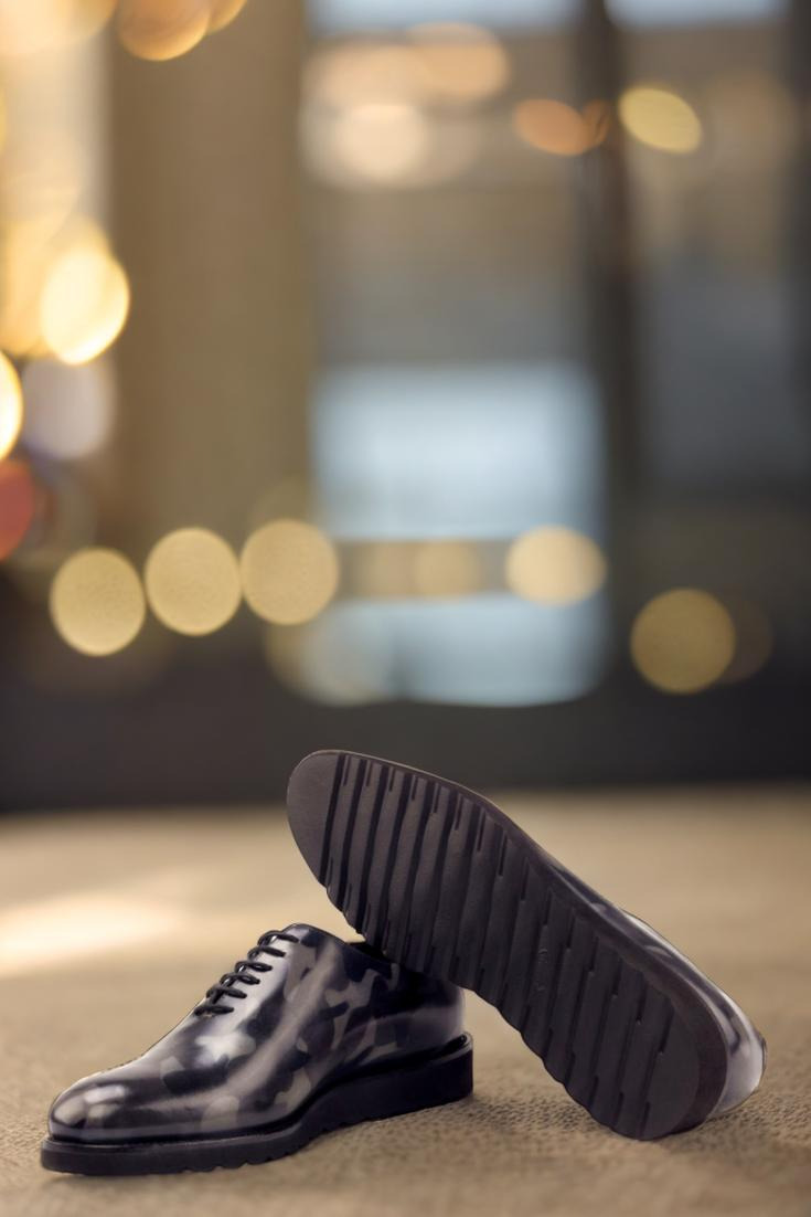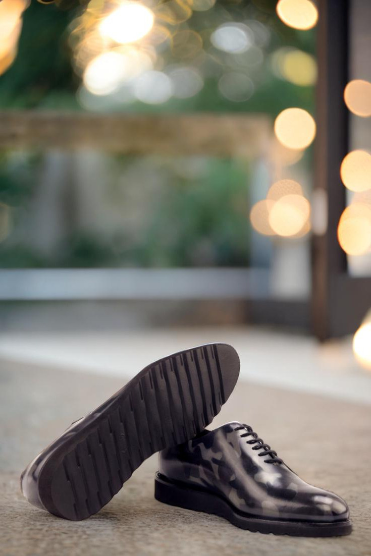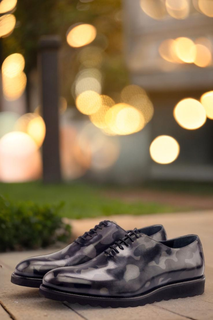 Meticulously crafted with the finest Italian Calf Leather, this Oxford boasts a striking grey camo hand patina on the quarter, tongue, and back. The design is both modern and edgy, making it the perfect choice for any fashion-forward individual.