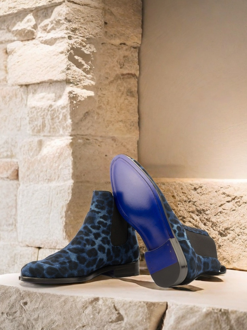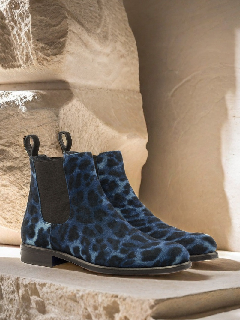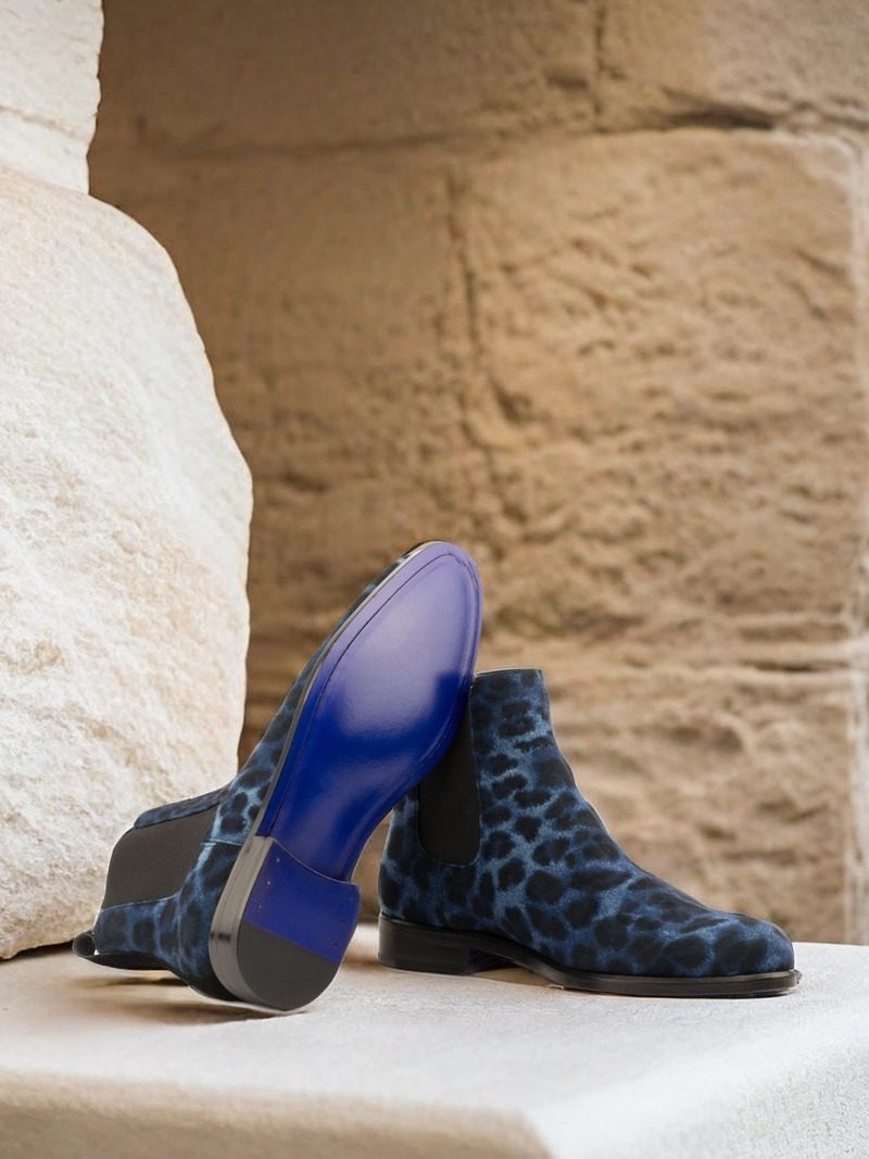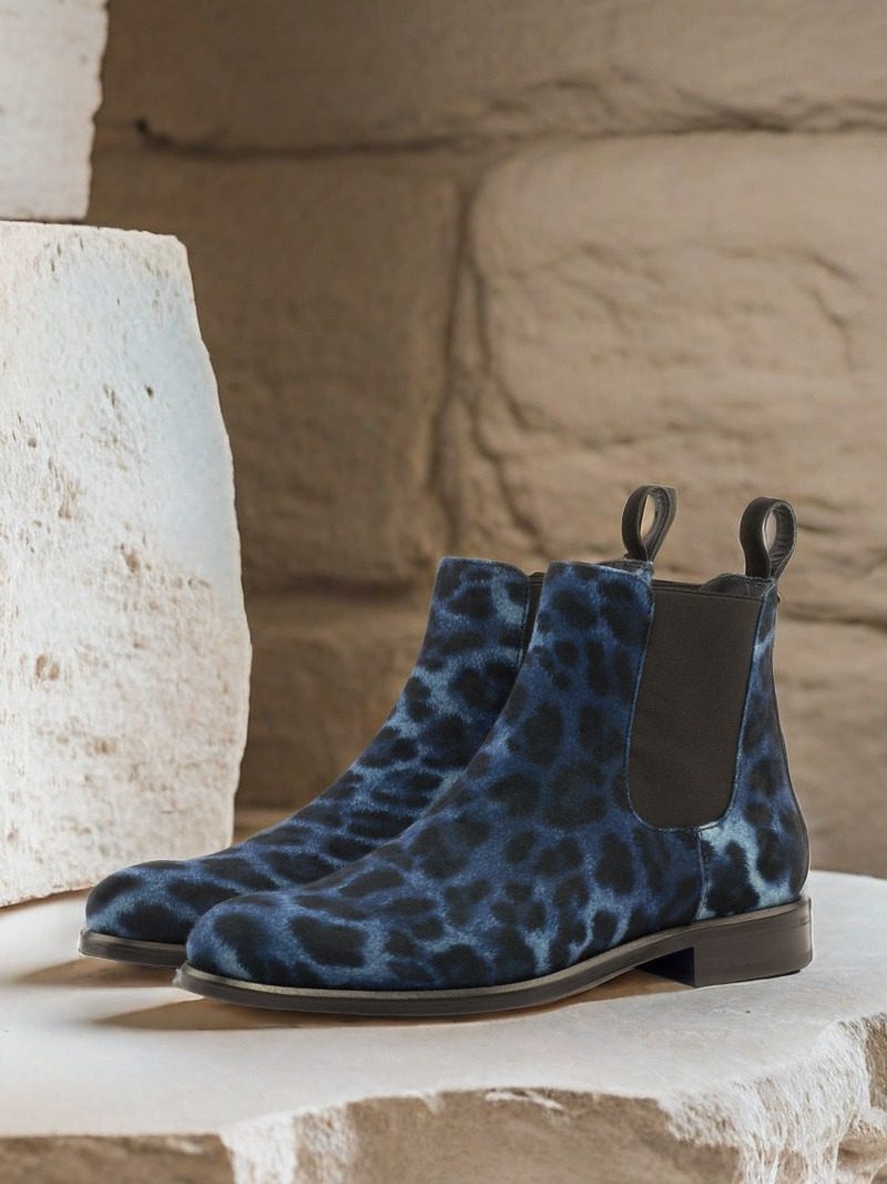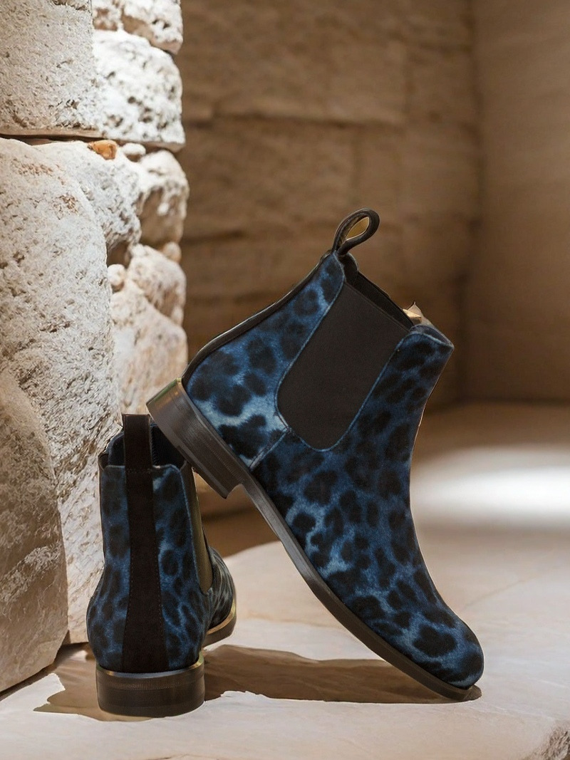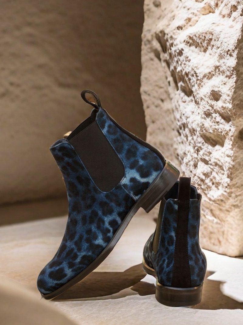 But the blue leopard print isn’t the only eye-catching feature of these boots. The back of the boot is made of luxurious black kid suede, adding a touch of elegance to the overall design. And to balance out the prints, the elastic is kept simple in black, keeping the focus on the stunning blue leopard print.