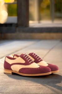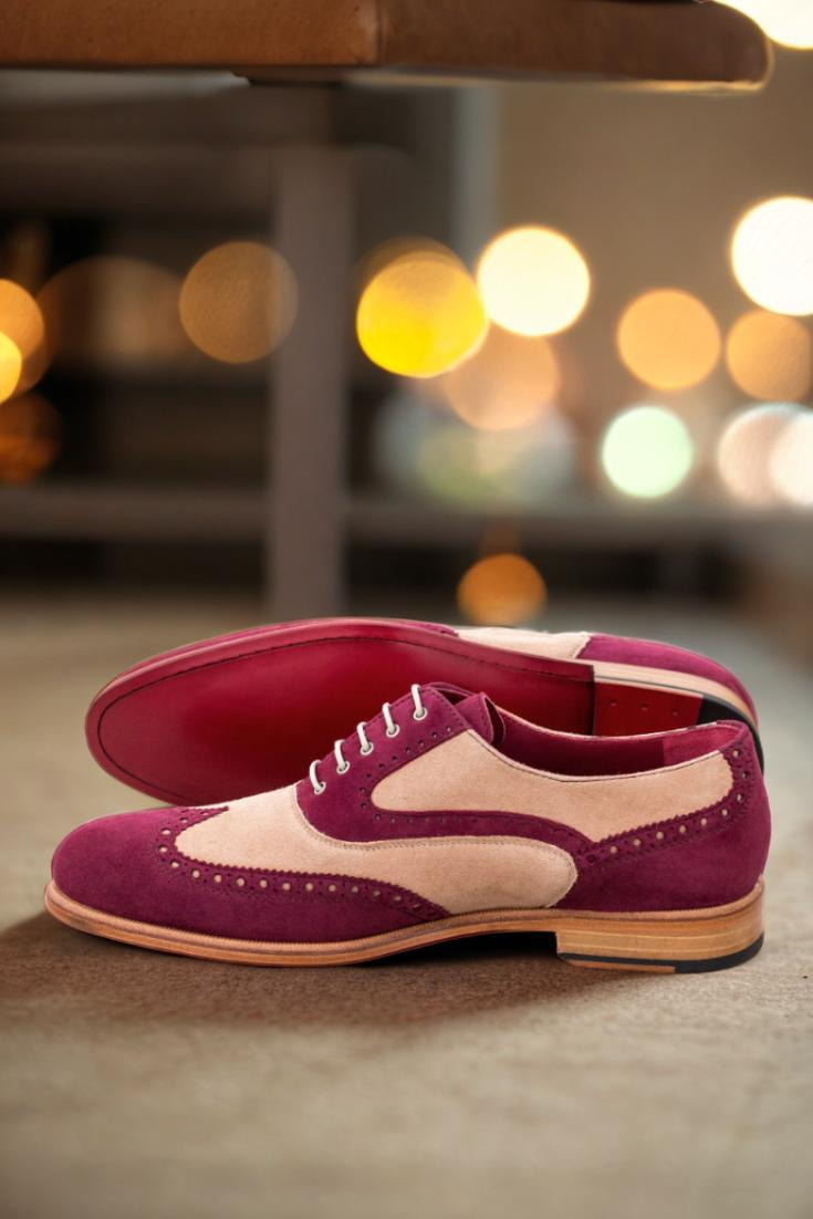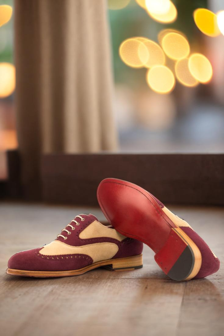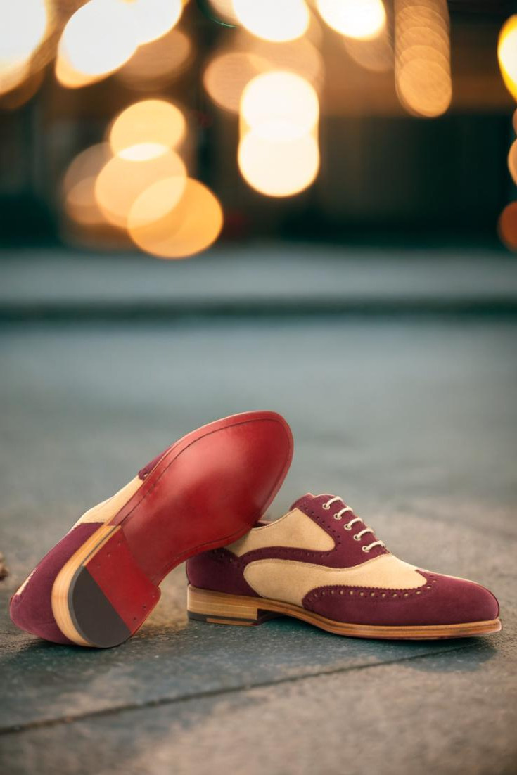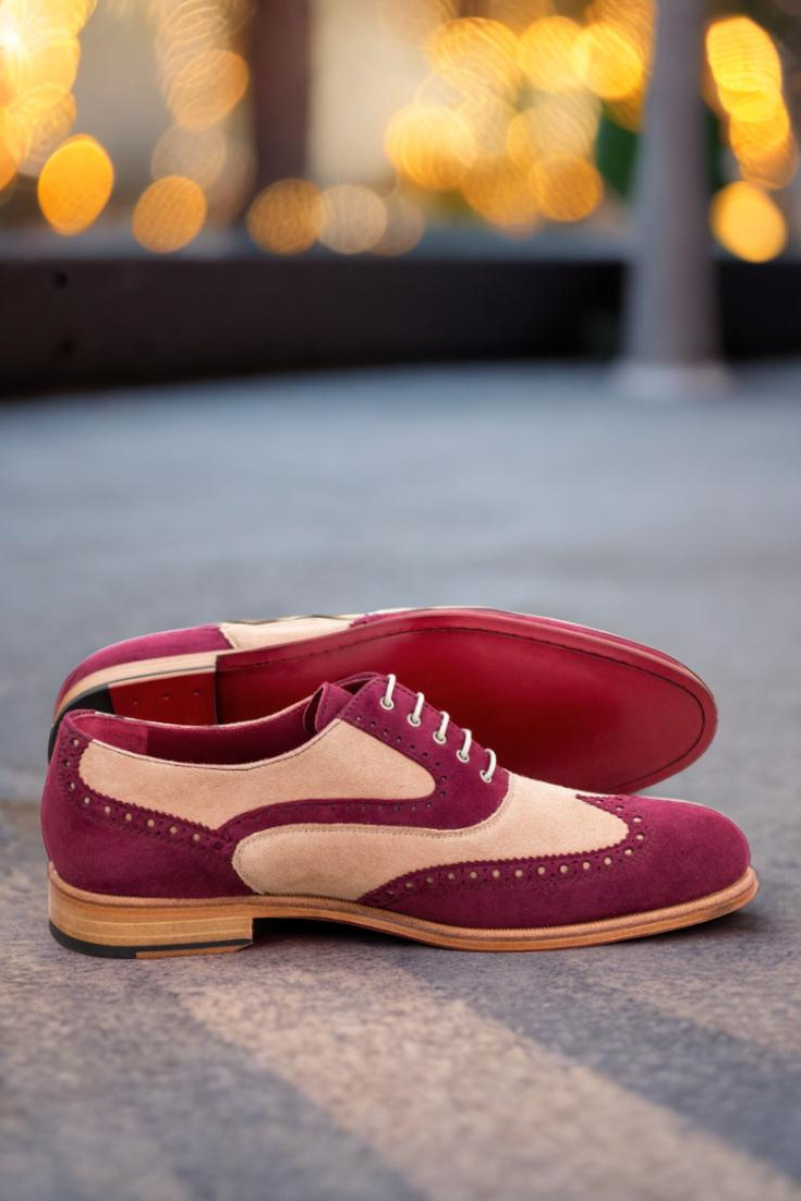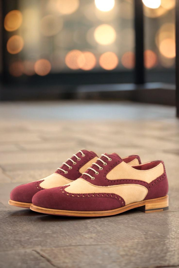 The uppers of this shoe are crafted from the finest wine and taupe kid suede, giving it a soft and supple feel while exuding a sense of refinement. The laces in a matching taupe color add a touch of contrast and complete the overall look.