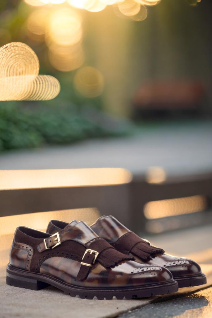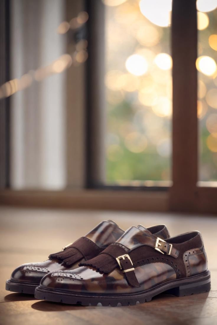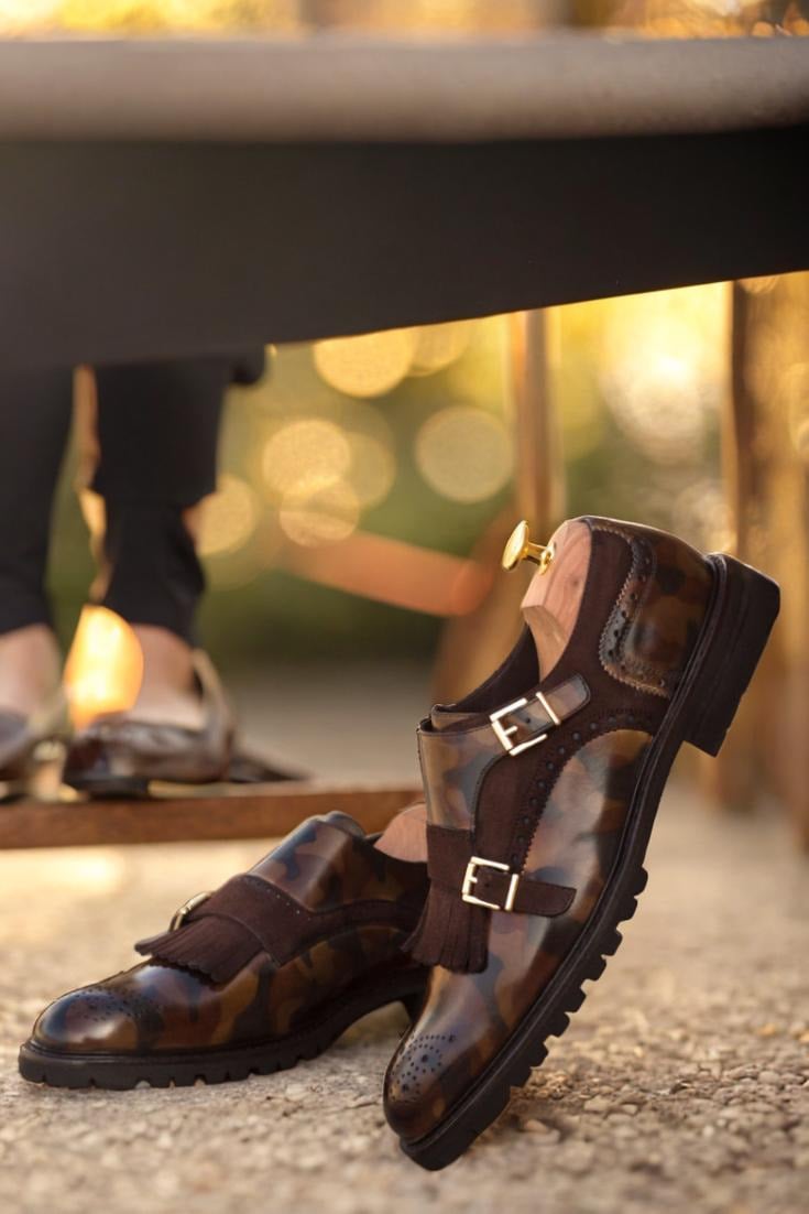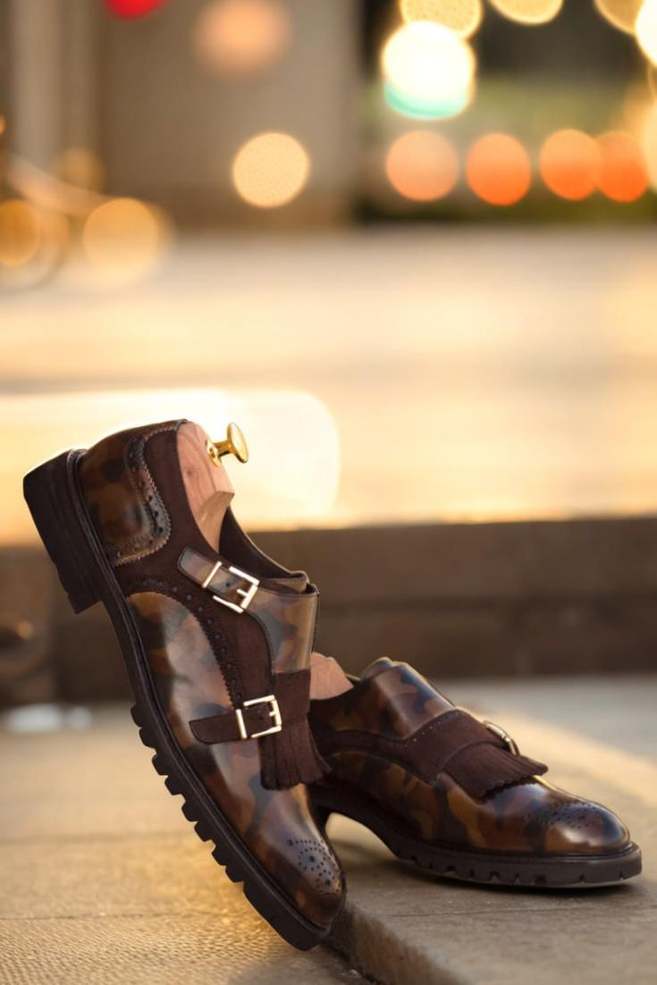 Elevate your style and make a bold statement with the Fullerton Ave. Women’s Kiltie Monk No. 3279—a stunning fusion of elegance and edgy attitude. Handcrafted with precision in Spain, this standout shoe features luxurious Italian calf leather paired with rich brown kid suede, creating a refined contrast that exudes sophistication. The unique camo-pattern hand patina, meticulously applied by skilled artisans, ensures each pair is truly one of a kind and guaranteed to turn heads. Elegant gold buckles and classic kiltie fringes add timeless charm, blending traditional design with modern flair.