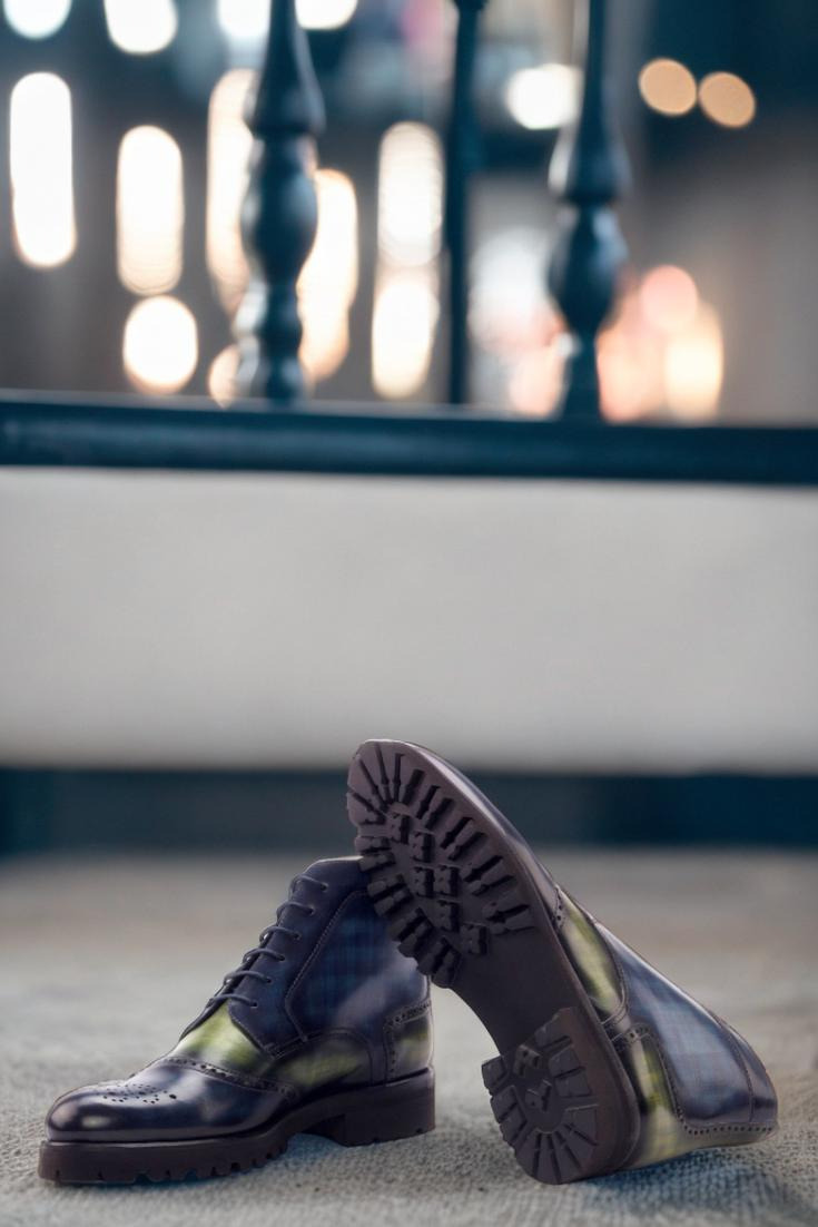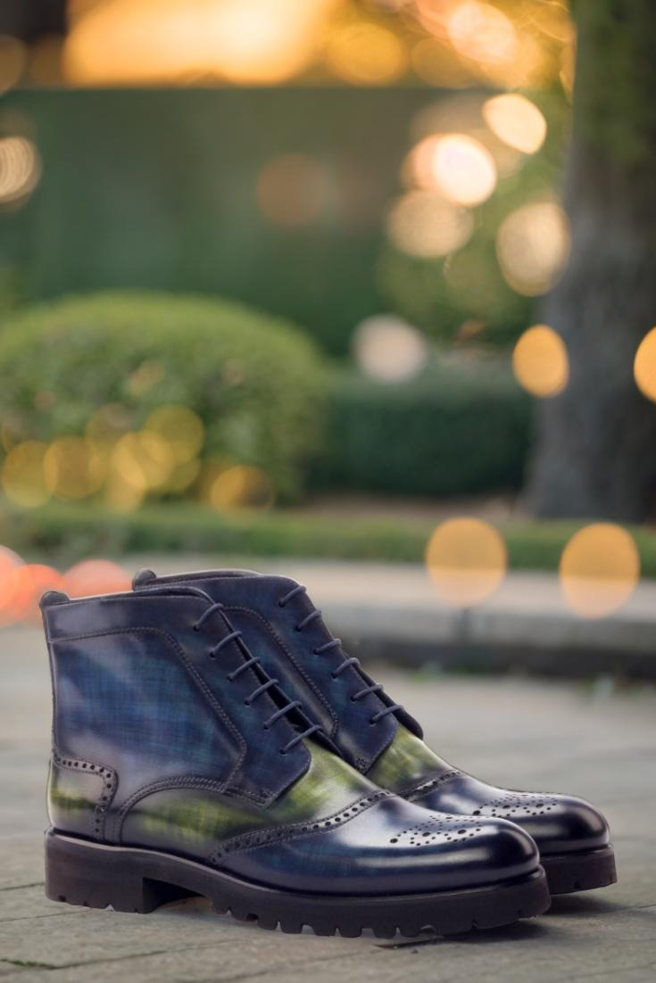 Turn heads with every step in the Astor St. Brogue Boot. Handcrafted in Spain, this boot combines traditional design with a modern twist. The upper is crafted from premium Italian calf leather, featuring a unique Papiro hand patina in contrasting denim blue and khaki. This distinctive finish ensures no two pairs are exactly alike.