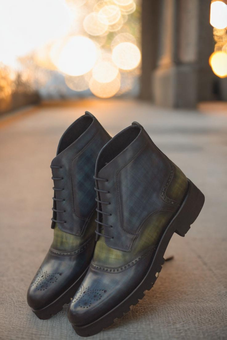 Built for both style and practicality, the boot features a Blake stitched construction for durability and flexibility. The ultralight black rubber commando sole provides excellent traction and all-day comfort, while the navy blue calf leather lining offers a smooth, luxurious feel. Finished with navy blue laces and a black dress welt, this brogue boot is a statement piece designed to elevate any outfit. You also have the option to customize this design to create a boot that is uniquely yours.