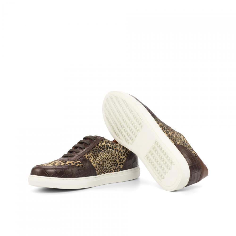 Crafted with a base of luxurious leopard print velvet, these trainers are bold and eye-catching from the very first step. The uppers are also made from the same material, ensuring a cohesive and high-end look. But it’s not just about the looks – the toe box, eyestay, and back are all crafted with dark brown croco embossed calf, adding a touch of sophistication and texture to the design.